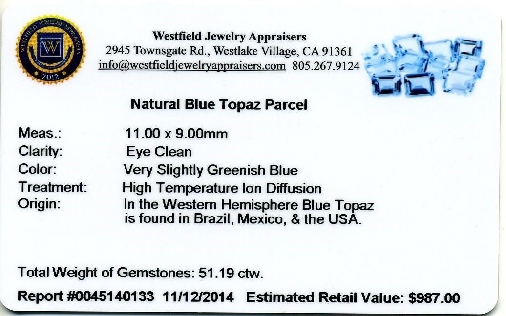 51.59cts Emerald Cut Natural Blue Topaz Parcel. Westfield Appraised at $987.00.