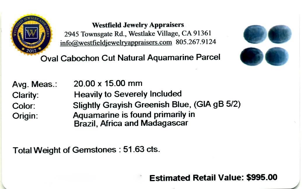 51.63cts Oval Cut Oval Cabochon Cut Natural Aquamarine Parcel. Westfield Appraised at $995.00.