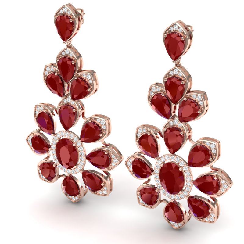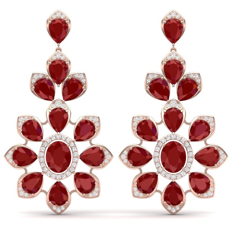 51.8 CTW Royalty Designer Ruby & VS Diamond Earrings 18K Rose Gold ---- Luxury Designer Brand Earring Appraised Retail Price at $43,500 ---- SKU Number US39049 18K Rose gold Earring Size is Larger, Earring measuring approx. 3 x 1 1/2 Inches, weighing in total approx. 27 grams. Made in the USA and is stamped 18K, Main stone 6.8 carat total weight containing 2 pieces of Intense Mid-Opaque Red color with AAA quality Oval shape cut Ruby , Stone #2 43.2 carat total weight containing 24 pieces of Intense Mid-Opaque Red color with AAA quality Pear shape cut
