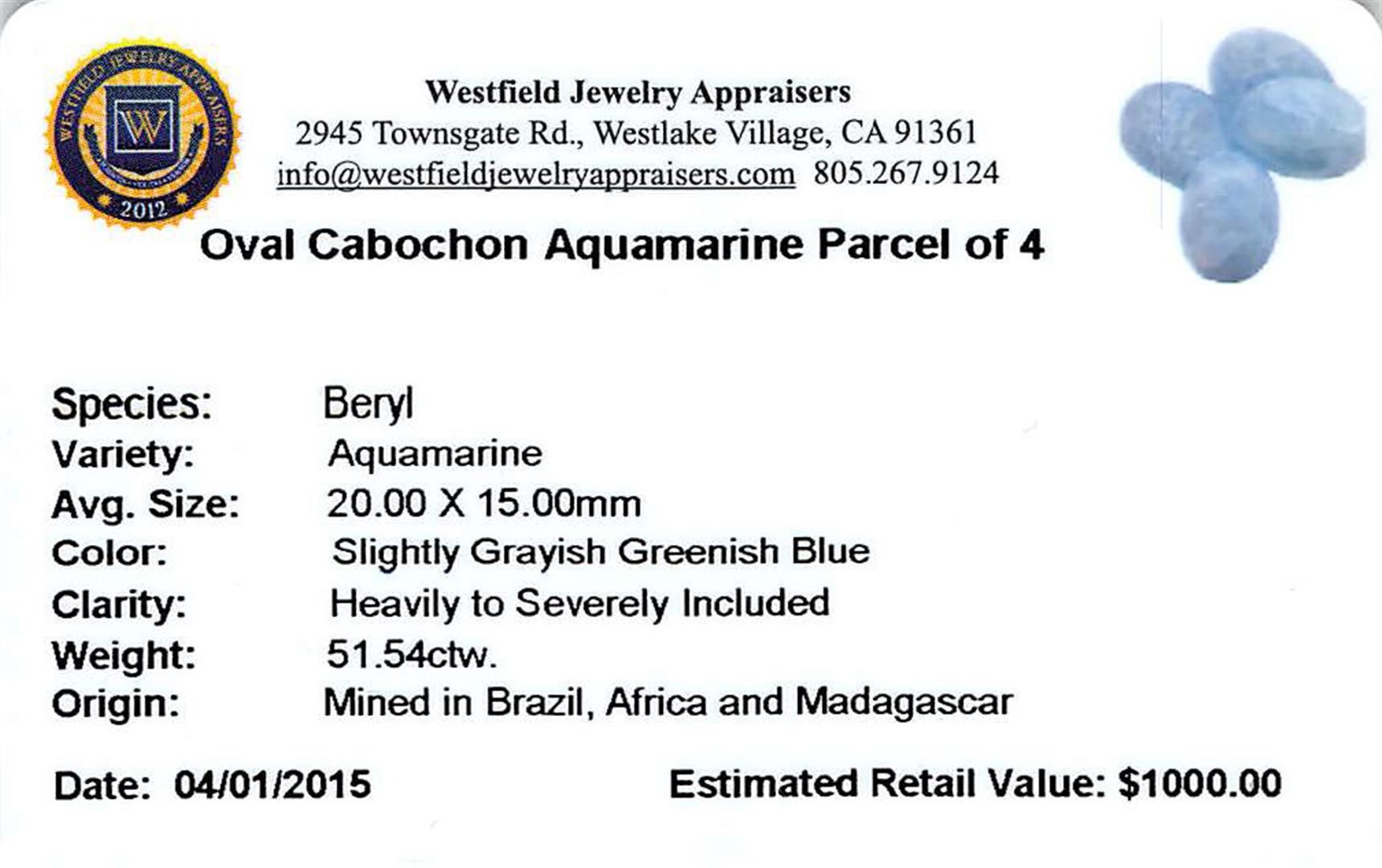 Four oval cabochon cut natural aquamarines exact total weight 51.84ct., clarity is heavily included, type I, medium, slightly grayish, very slightly greenish blue color, (GIA vslgB 5/2), cut is good. Westfield Appraised at $1,000.00.