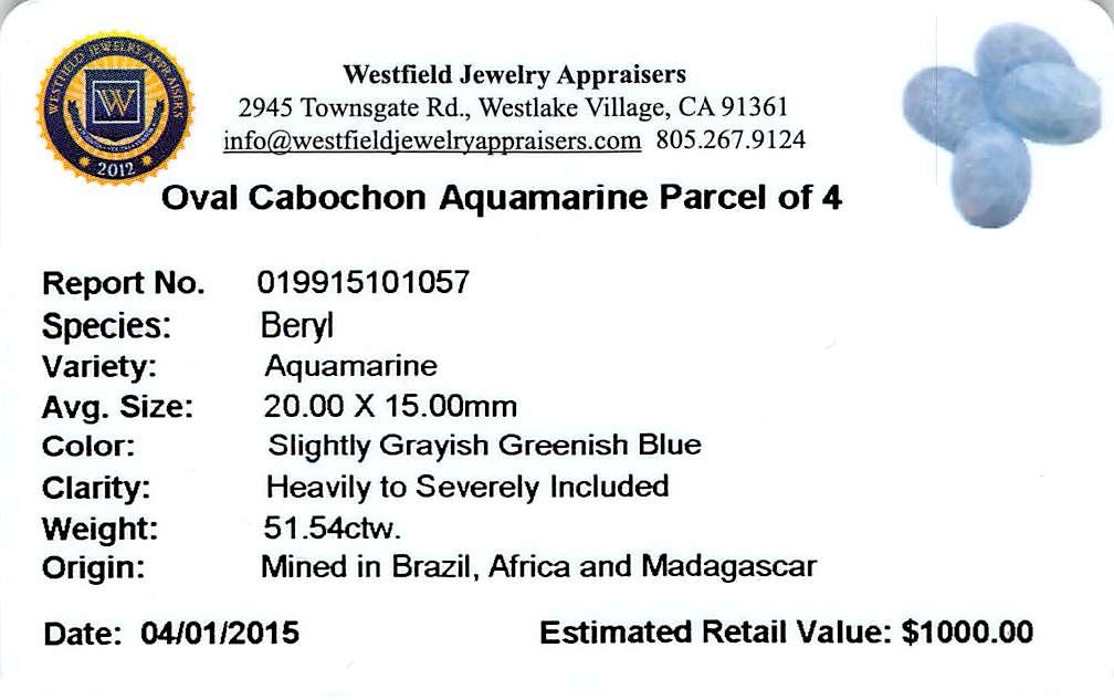Four oval cabochon cut natural aquamarines exact total weight 51.84ct., clarity is heavily included, type I, medium, slightly grayish, very slightly greenish blue color, (GIA vslgB 5/2), cut is good. Westfield Appraised at $1,000.00.