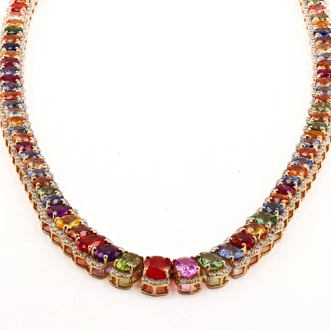 51.93ctw Multi-Color Sapphire and 5.88ctw Diamond 14K Yellow Gold Necklace. Fourteen karat (14K) yellow gold natural multi color sapphire corundum and diamond necklace. Oval brilliant cut natural multi color sapphire corundum gemstones are mounted in the center of the necklace. Round brilliant cut diamonds accent the necklace around the center gemstones. The necklace has a gross weight of 52.6 Grams. NATURAL GEMSTONE GEMSTONE: Sapphire Corundum NATURE: Natural SHAPE: Oval Brilliant, Faceted Cut WEIGHT: 51.93 carat total (105pcs.) DIMENSIONS: 7.3 x 3.7mm CLARITY: Type 3 COLOR: Multi Color (5/5) SYMMETRY: Excellent COLOR INTENSITY: Intense TRANSPARENCY: Transparent TONE: Dark NATURAL DIAMOND SHAPE: Round Brilliant Cut WEIGHT: 5.88 carat total (631pcs.) DIMENSIONS: 1.8 x 1.4mm AVERAGE COLOR: G-H SYMMETRY: Excellent POLISH: Excellent METAL METAL: Gold PURITY: 14K COLOR: Yellow CONDITION: Excellent FINISH: High Polish