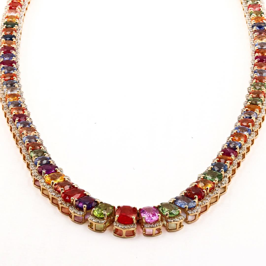 Fourteen karat (14K) yellow gold natural multi color sapphire corundum and diamond necklace. Oval brilliant cut natural multi color sapphire corundum gemstones are mounted in the center of the necklace. Round brilliant cut diamonds accent the necklace around the center gemstones. The necklace has a gross weight of 52.6 Grams. #NATURAL GEMSTONE# GEMSTONE: Sapphire Corundum; NATURE: Natural; SHAPE: Oval Brilliant, Faceted Cut; WEIGHT: 51.93 carat total (105pcs.); DIMENSIONS: 7.3 x 3.7mm; CLARITY: Type 3; COLOR: Multi Color (5/5); SYMMETRY: Excellent; COLOR INTENSITY: Intense; TRANSPARENCY: Transparent; TONE: Dark #NATURAL DIAMOND# SHAPE: Round Brilliant Cut; WEIGHT: 5.88 carat total (631pcs.); DIMENSIONS: 1.8 x 1.4mm; AVERAGE COLOR: G-H; SYMMETRY: Excellent; POLISH: Excellent #METAL# METAL: Gold; PURITY: 14K; COLOR: Yellow; CONDITION: Excellent; FINISH: High Polish