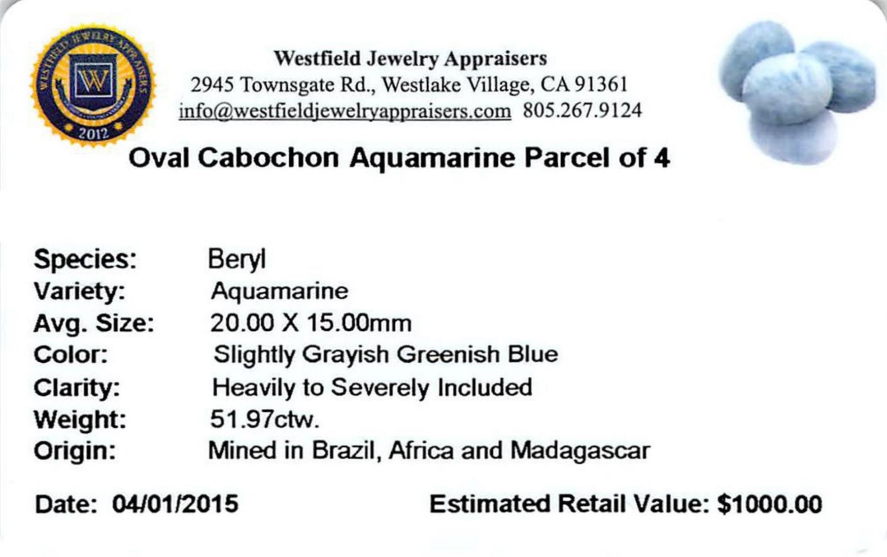 Four oval cabochon cut natural aquamarines exact total weight 51.97ct., clarity is heavily included, type I, medium, slightly grayish, very slightly greenish blue color, (GIA vslgB 5/2), cut is good. Westfield Appraised.