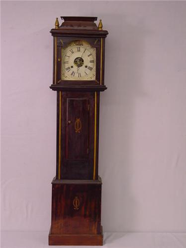 51" PINE CASED DWARF GRANDMOTHERS CLOCK (MAKE-DO), PAINTED METAL FACE W/ SHIP CREST, BRASS WORKS, & STAINED & STENCILED CASE - NO MAKER, LOSSES & IMPERFECTIONS