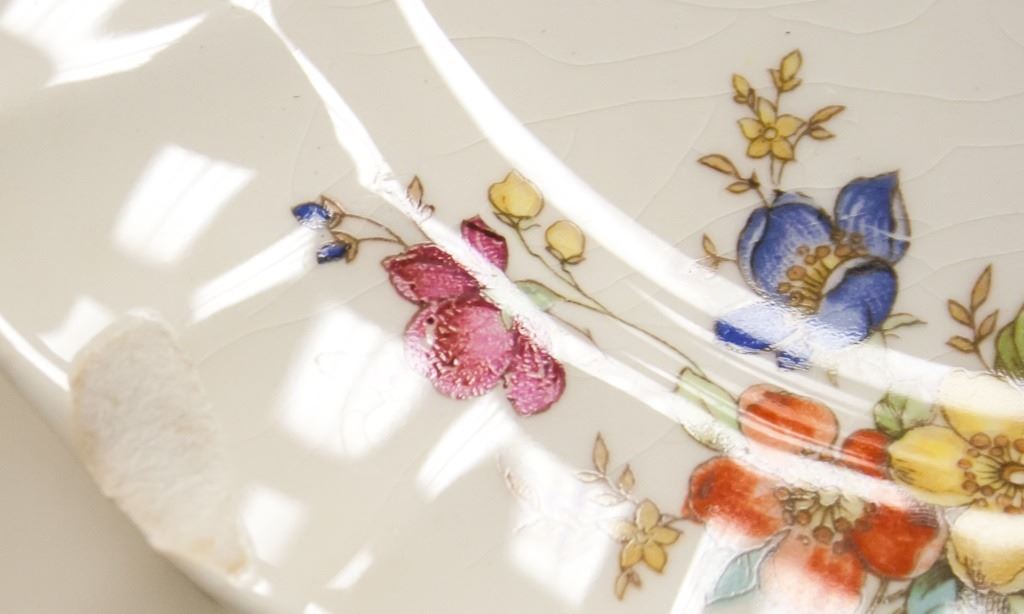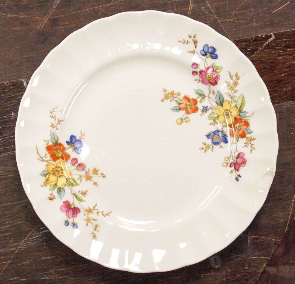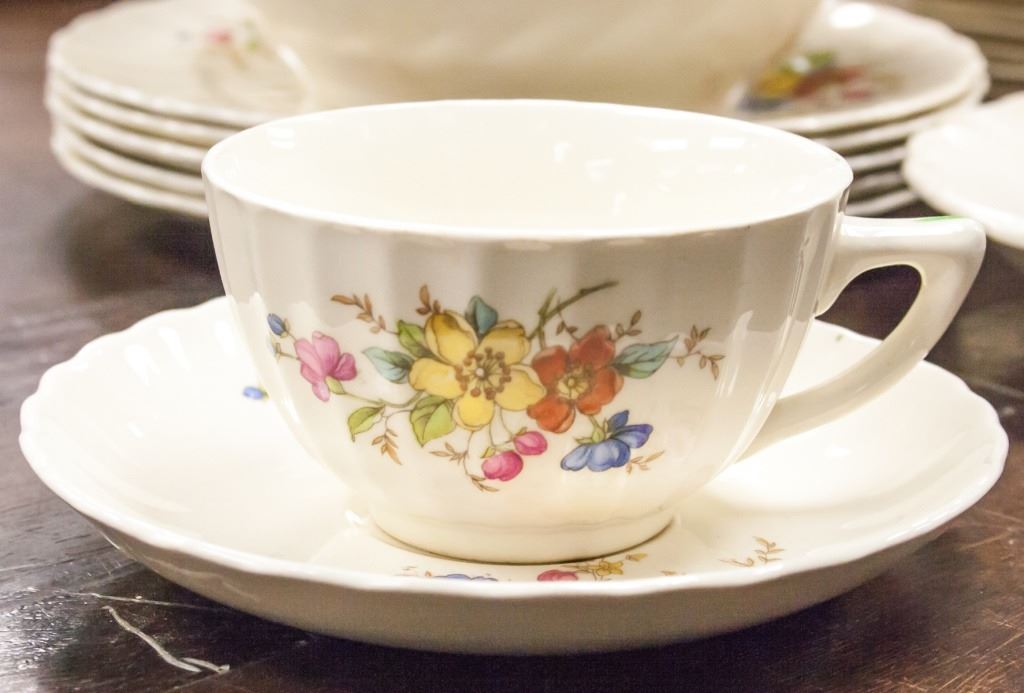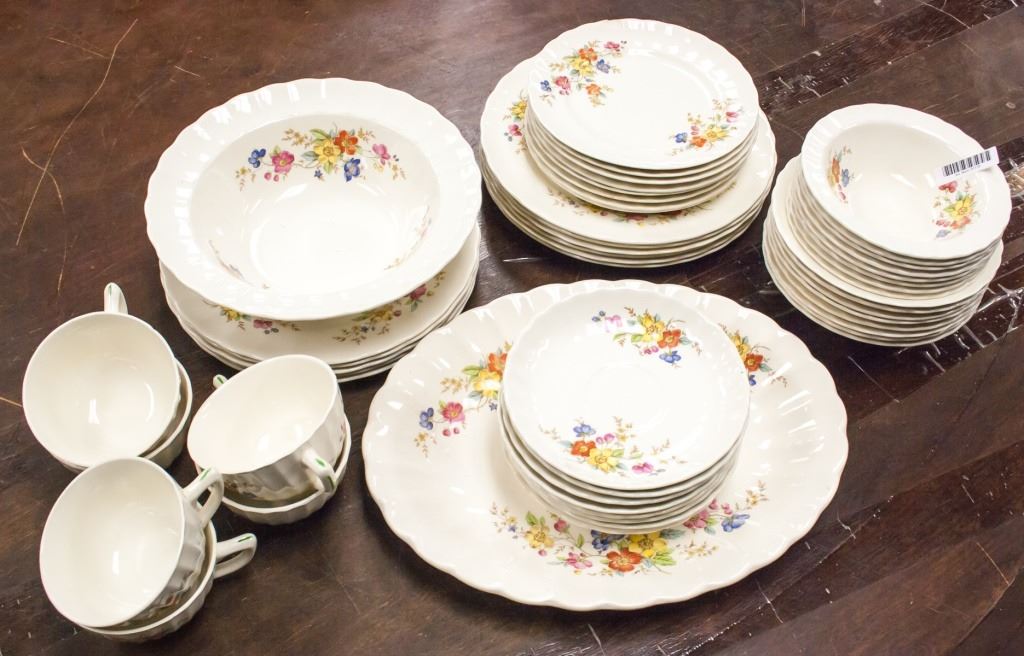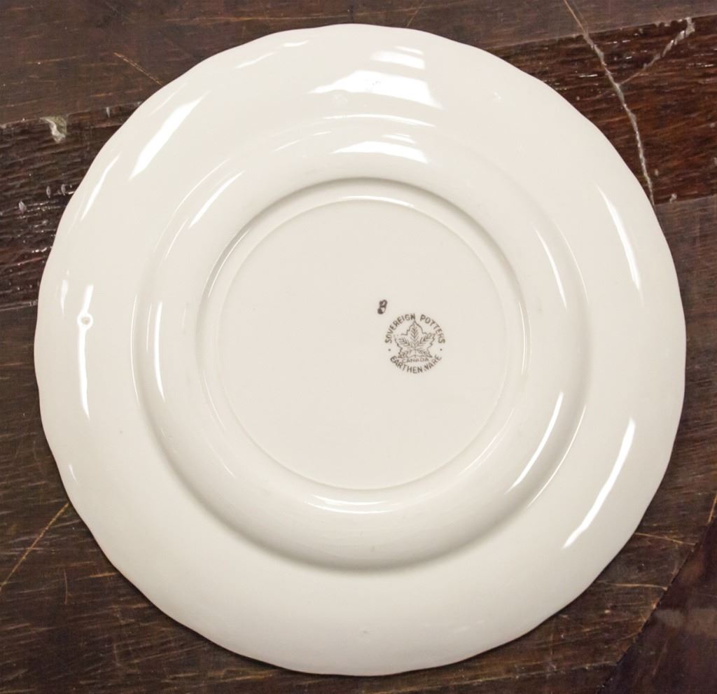 51-piece dishware. Including Plates, bowls, and cups. Painted with flowers on opposing edges. "SOVEREIGN POTTERS EARTHENWARE CANADA" stamped on base. L: 32 cm. 12 kg