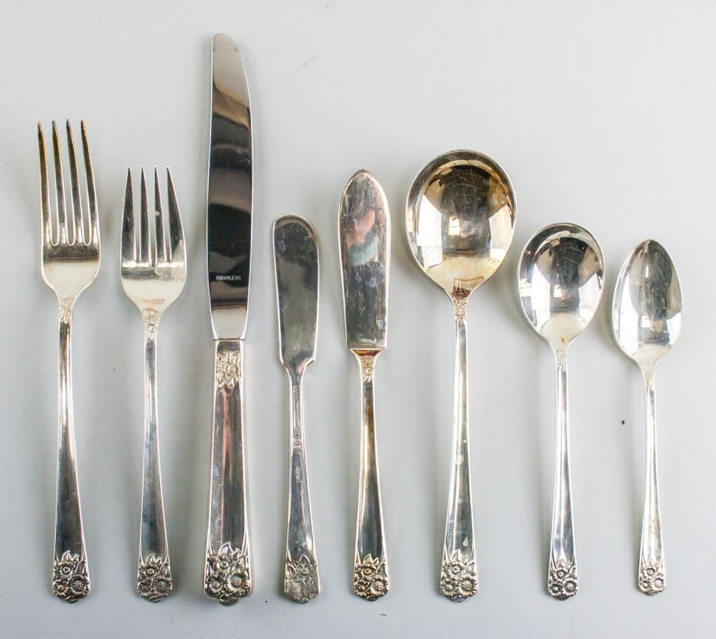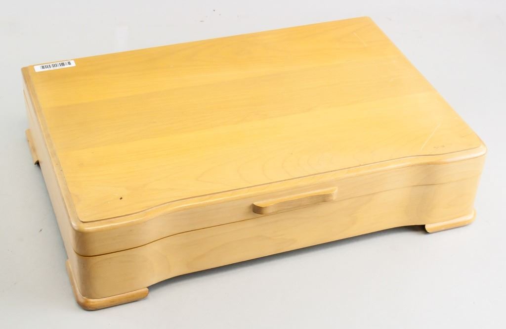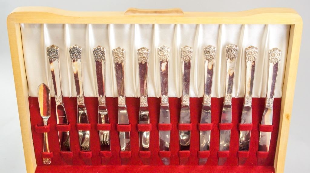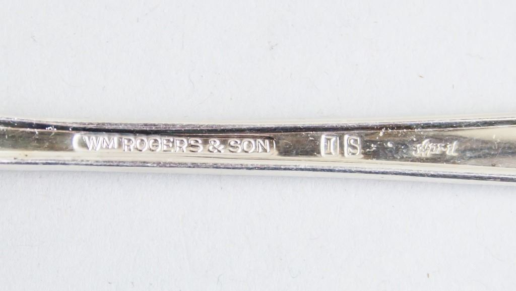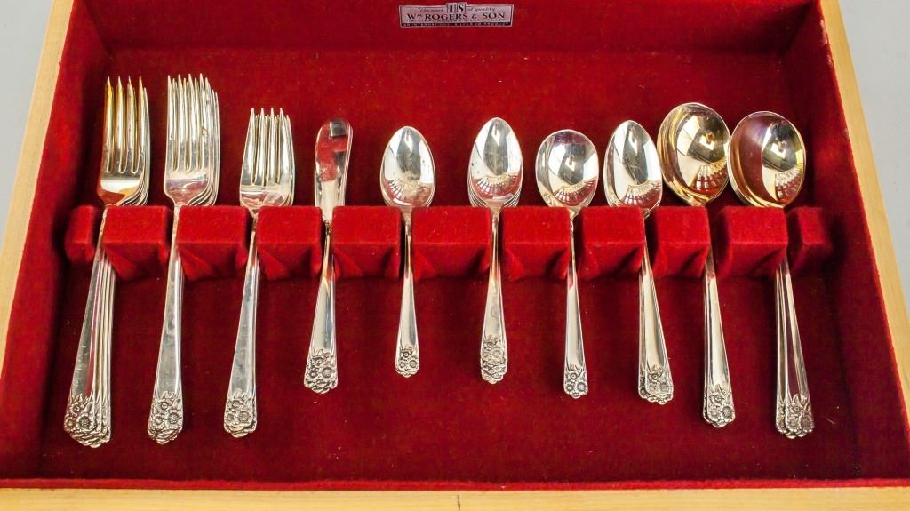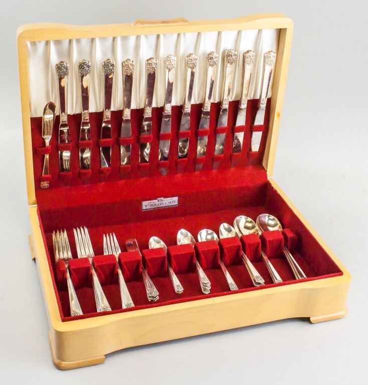 51-piece silverware set, with wooden storage box. "The Mark IS of Quality WM ROGERS & SON Original Rogers Silver Plate / An International Silver Co. Product" label inside box. "WM ROGERS & SON / IS / [illegible]" and "STAINLESS" stamped on silverware. 10 x 43 x2 8.5 cm. 4 kg. Metal untested.