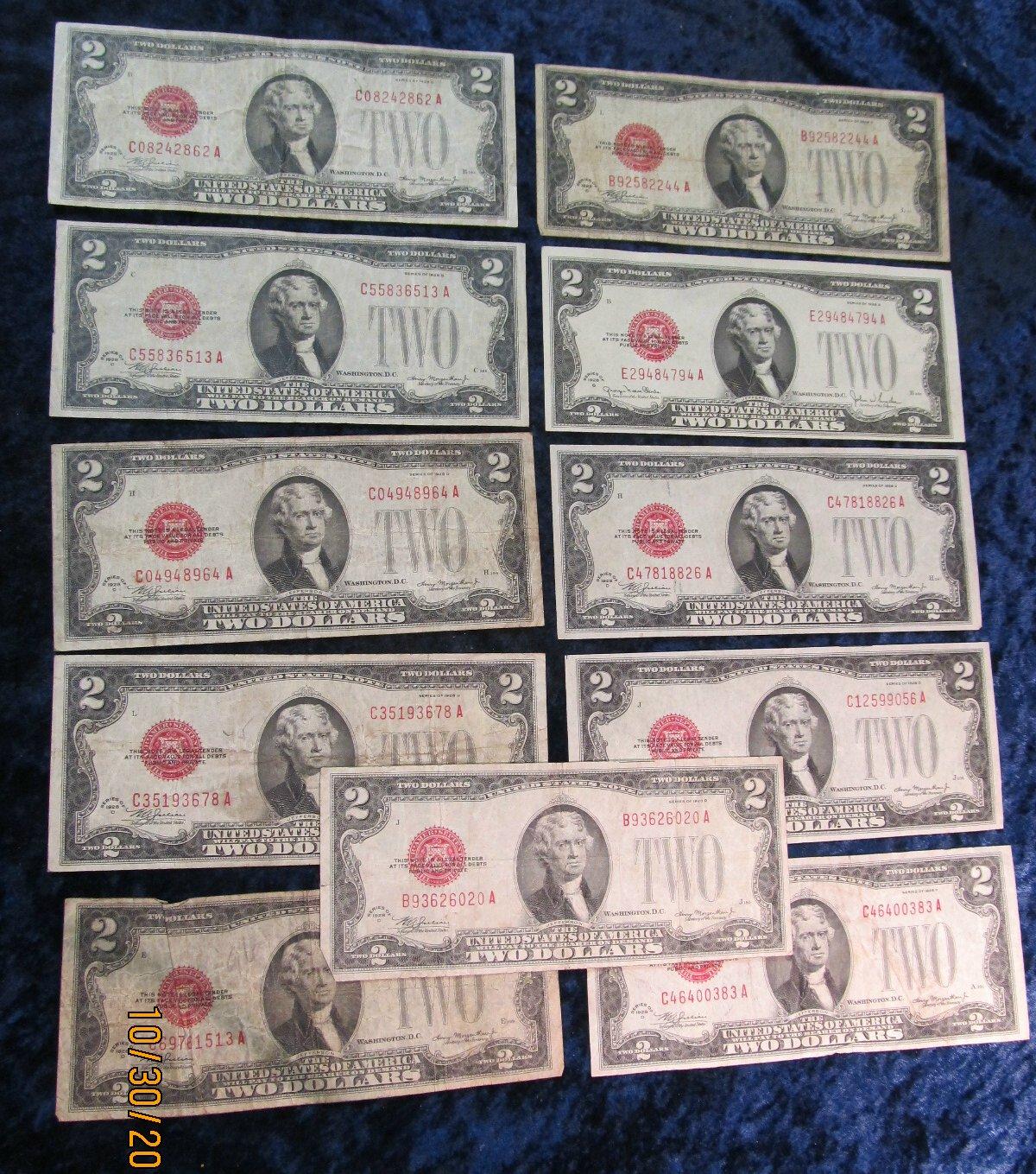 51. Series 1928C, (9) 1928D & 28G $2 U.S. Notes. "Red Seals" VG-VF. ($22.00 face value)