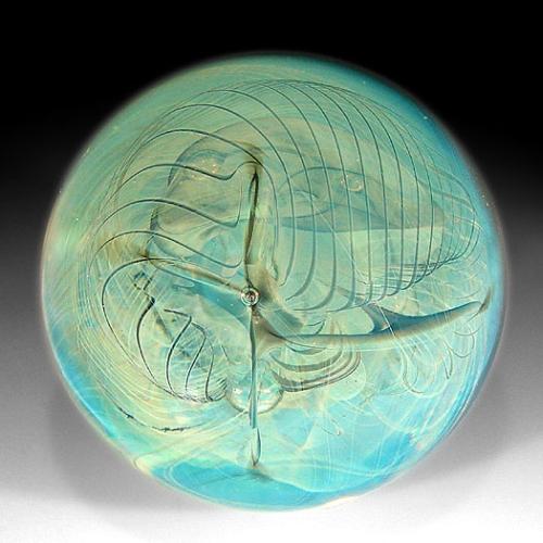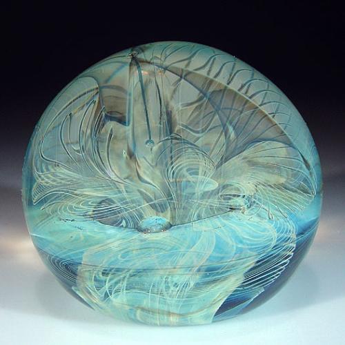 Slade 1984 abstract design paperweight, with translucent pale blue and pale gray swirling veils. Signed/dated. Diameter 2 3/4". NO RESERVE