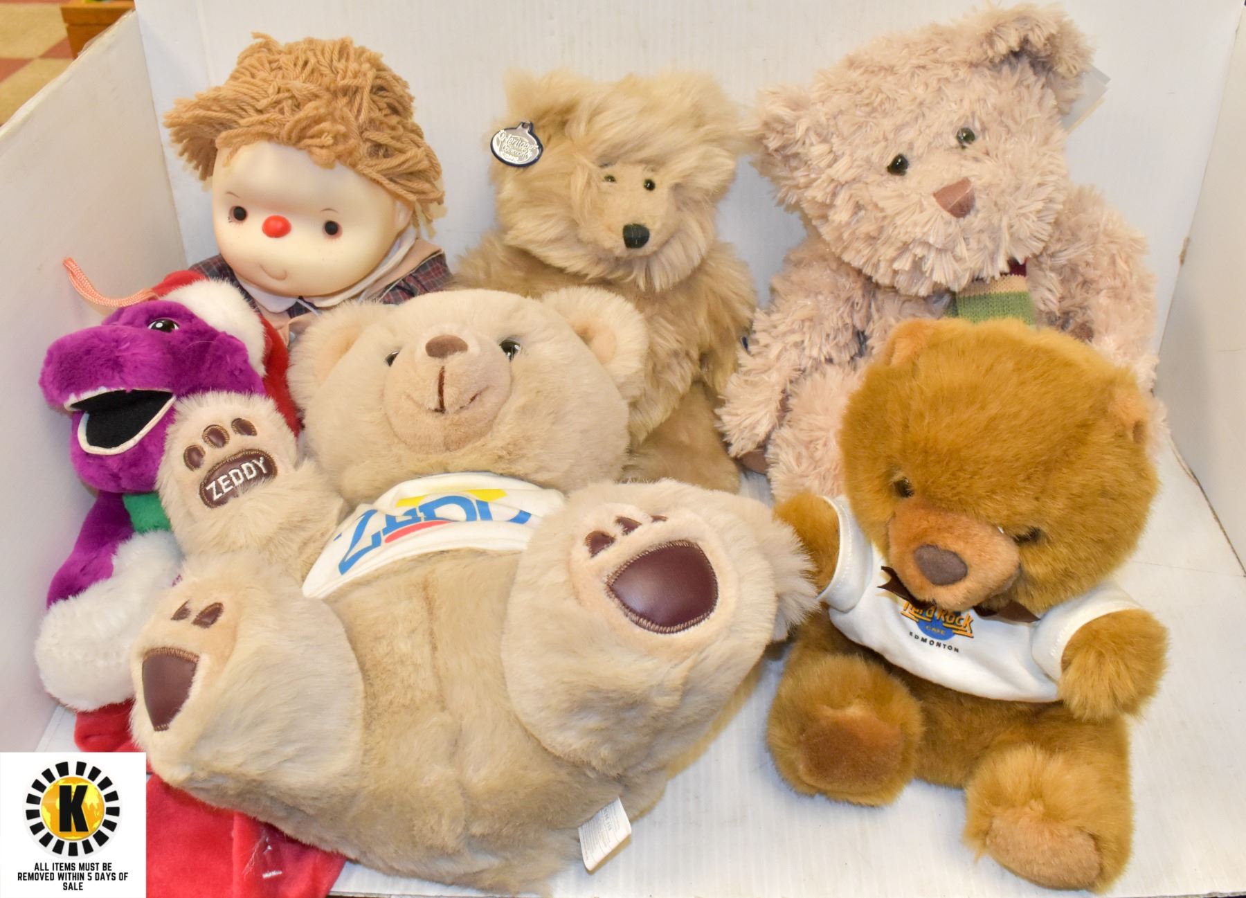 VINTAGE STUFFED ANIMALS, NEW WITH TAGS, INCLUDING “ZEDDY” FROM ZELLERS, HARD ROCK CAFE EDMONTON BEAR, BARNEY AND MORE.