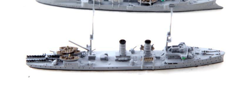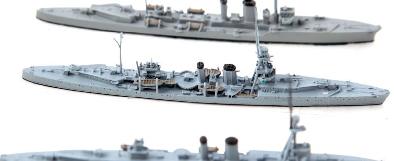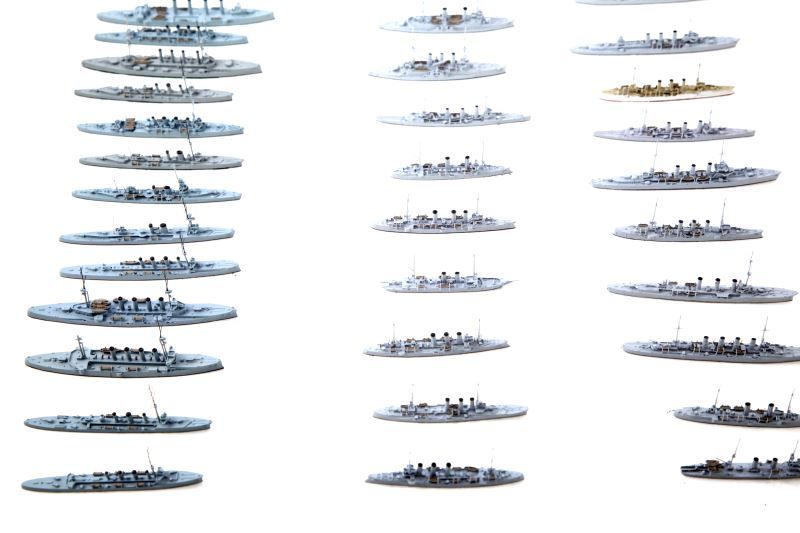 51 waterline ship ID models of WWI British and German warships, consisting of armored cruisers, battle cruisers, and light cruisers. British Ships, all prefixed HMS: Amphion, Arethusa, Argyil, Black Prince, Bristol, Calypso, Cardiff, Castor, Chester, Comus, Defence, Falmouth, Good Hope, Hocue, Monmouth, Natal, Nottingham, Patrol, Pegasus, Sydney, and Topaz. German ships, all prefixed SMS; Albatross, Arcona, Breslau, Brummer, Dresden, Dresden II, Elbing, Emden, Emden II, Frankfurt, Gazelle, Hela, Karlsruhe, Kolberg, Koln I, Koenigsberg, Leipzig, Lubeck, Munchen, Nautilus, Nurnberg, Nymph, Pilau, Prinz Adalbert, Prinz. Heinrich, Regensburg, Roon, Scharnhorst, Vineta, and Wiesbaden. Ships are accompanied by alphabetized card catalog of launch date, class, specifications, and service history of each ship.