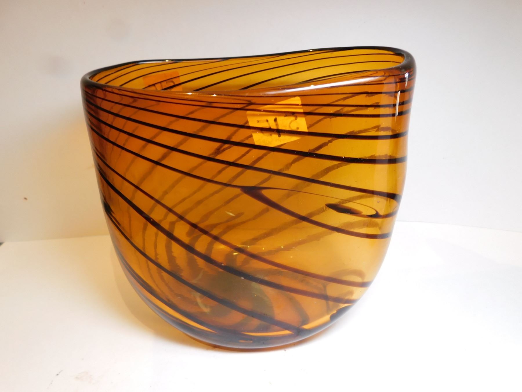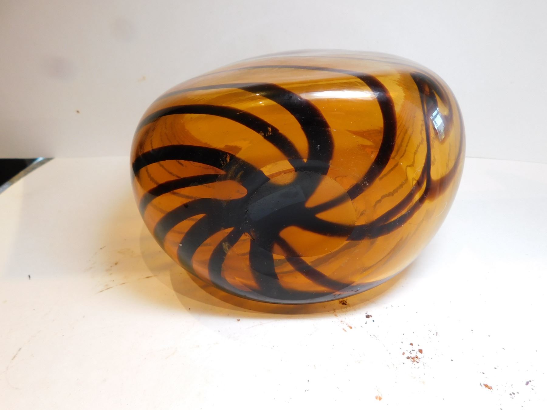 515. AMBER TIGER STIRPE HEAVY GLASS VASE 7” TALL