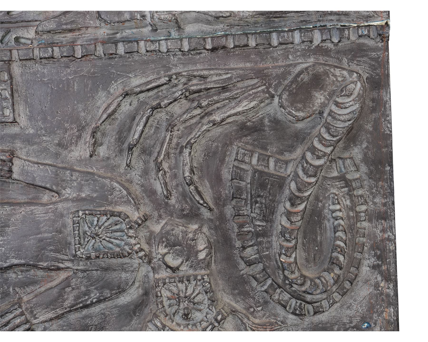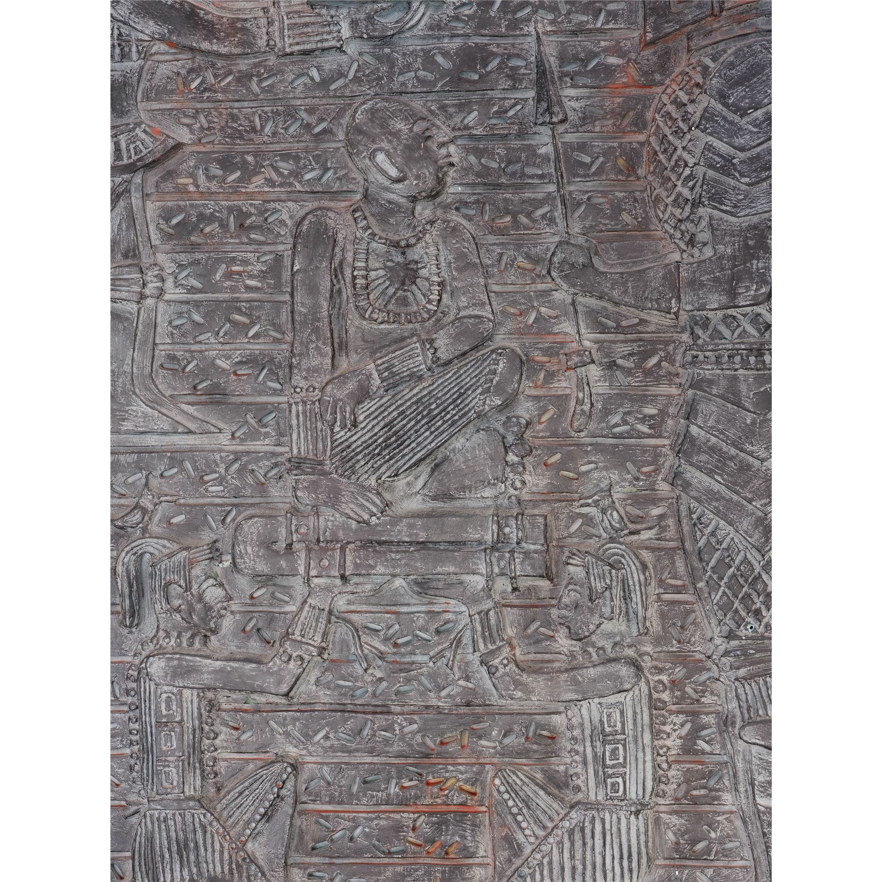 This large, ornately designed fiberglass panel depicting a human sacrifice to the Yautja was created by Academy Award& reg;-winning special effects group Amalgamated Dynamics, Inc. (ADI). It is airbrushed gray and brown, aged by production to appear ancient, and features large holes for hanging on a wall. The panel exhibits some orange paint staining, cracking, and areas of fragility in the fiberglass near its base. Dimensions: 79" x 40" x 2" (200.75 cm x 101.75 cm x 5 cm)