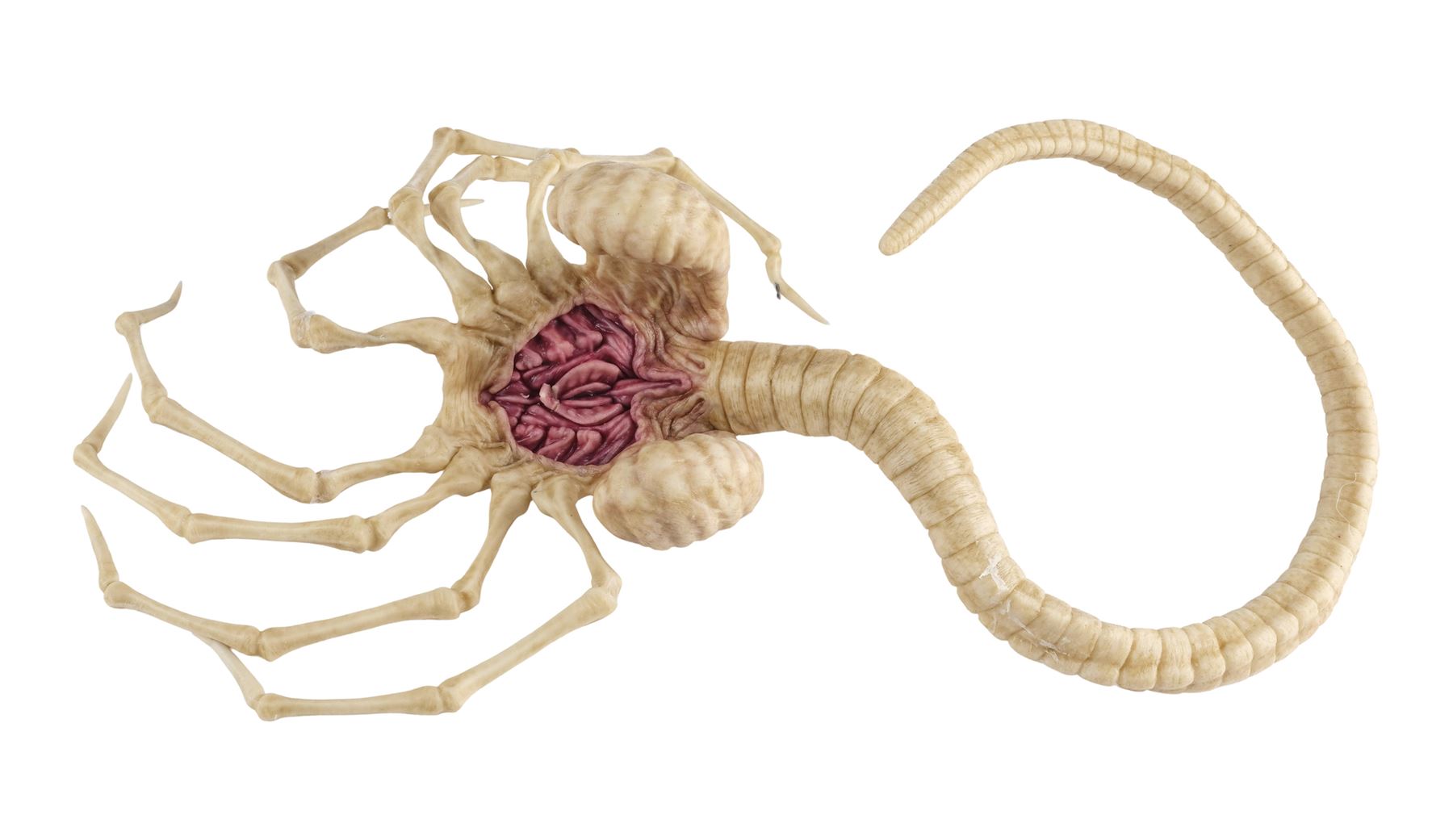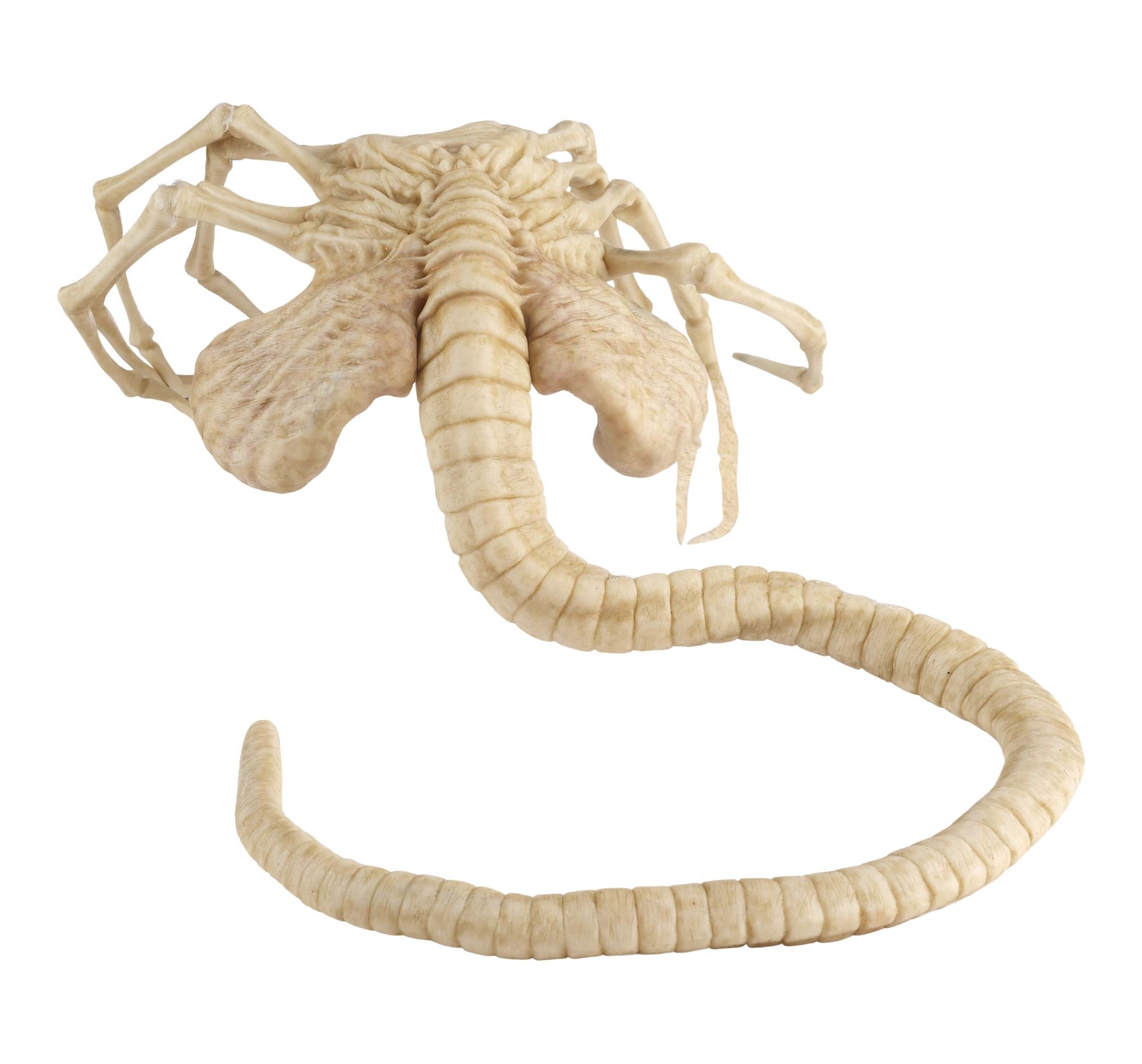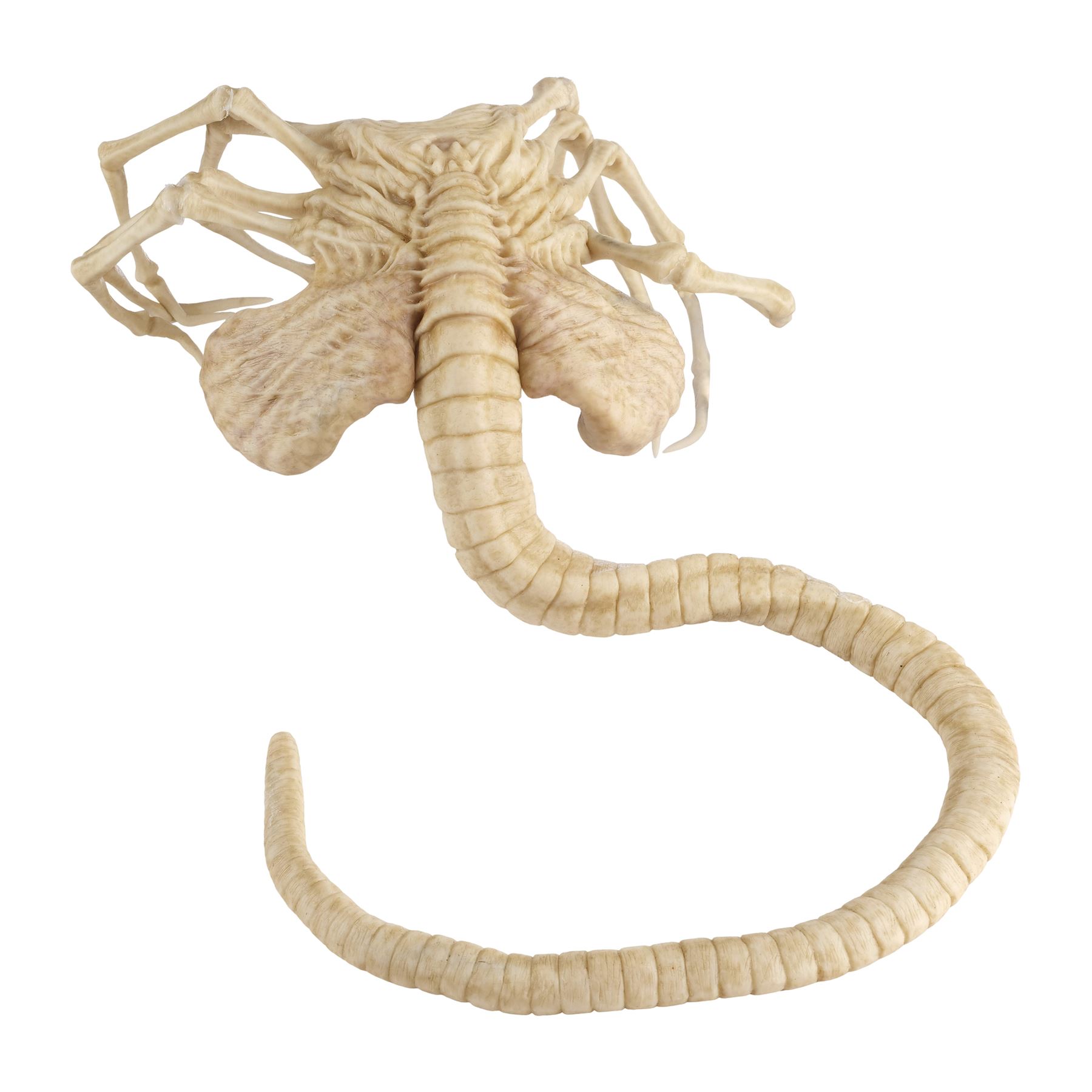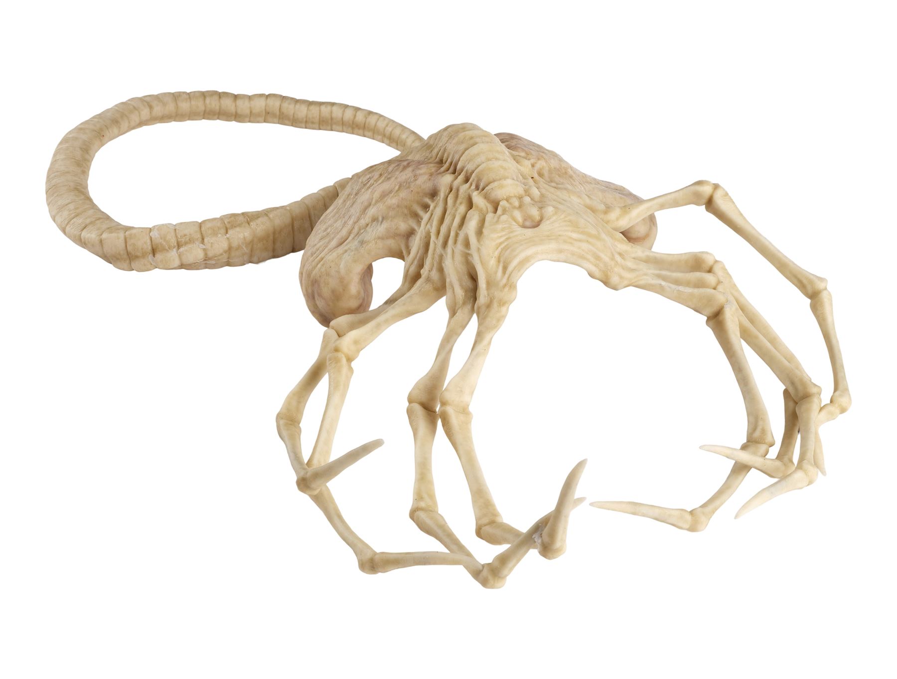 Jointly designed and created by the creature design and effects teams at Creatures Inc. Ltd. and Odd Studio, this jointed silicone facehugger is painted in shades of white and brown on the exterior with a fleshy pink underbelly. It features eight spindly legs molded around metal armatures and a long, coiled spiny tail. The silicone exhibits some peeling around its joints and protruding metal from production use and age. Dimensions: 20" x 15" x 8" (51 cm x 38.25 cm x 20.5 cm)