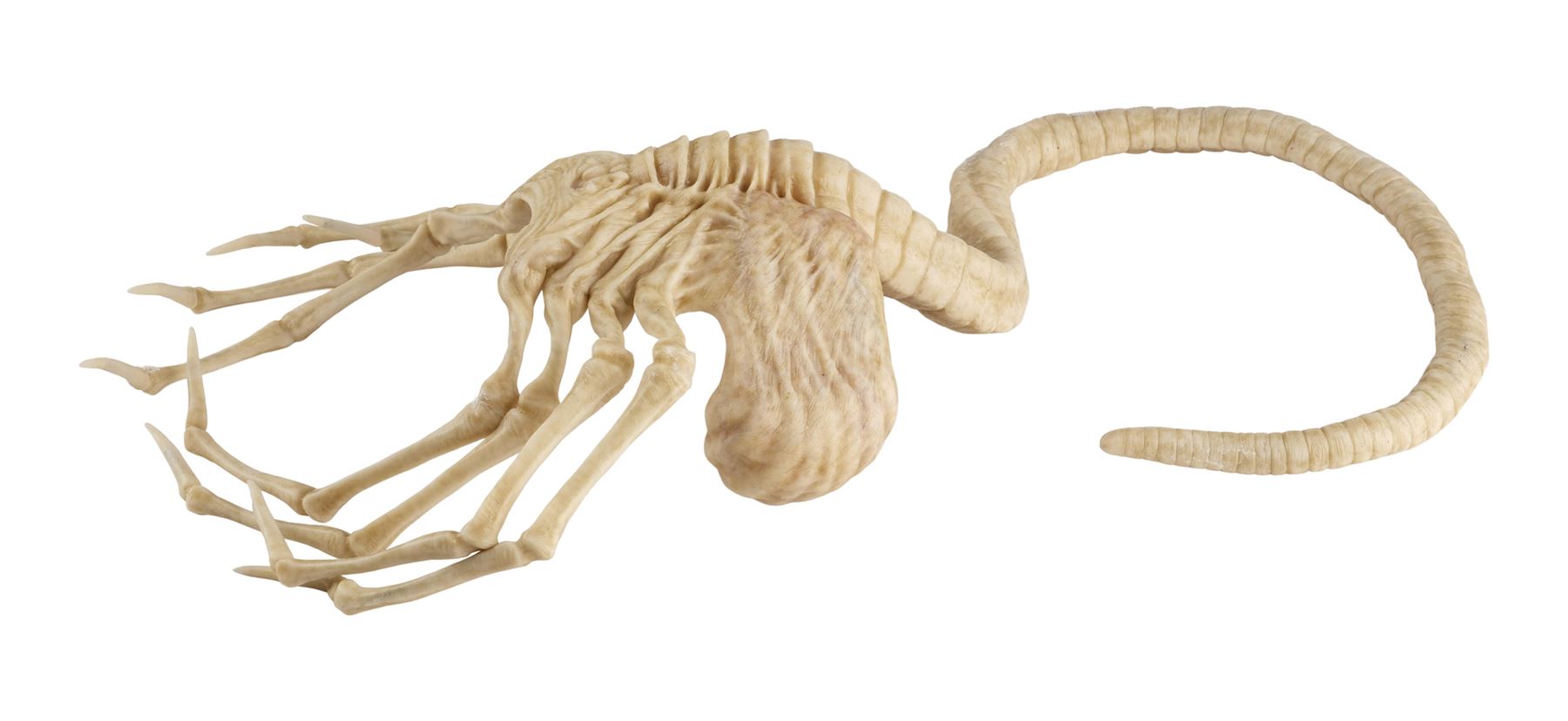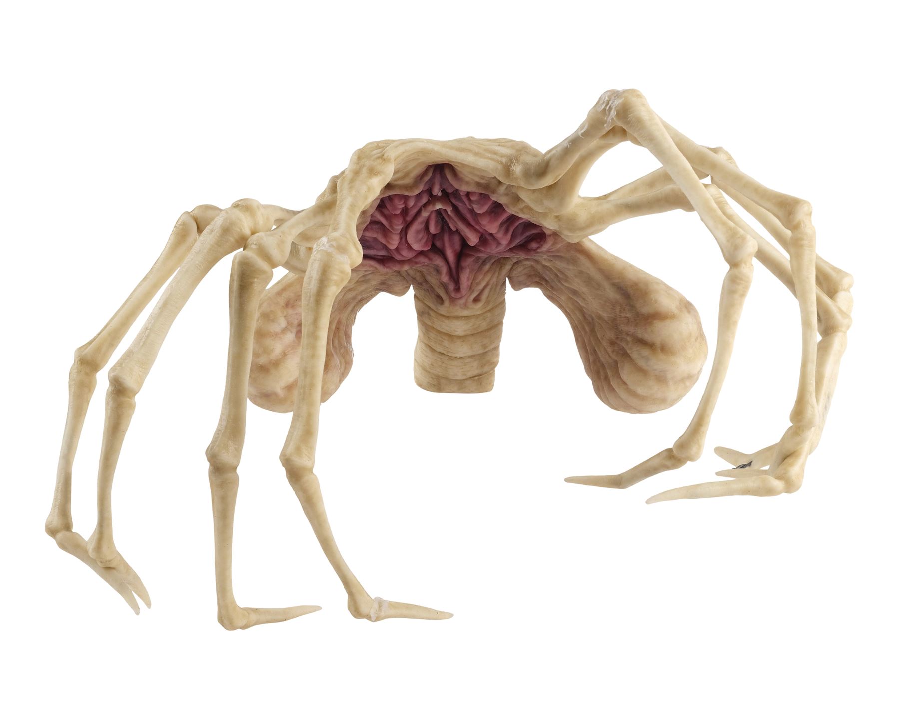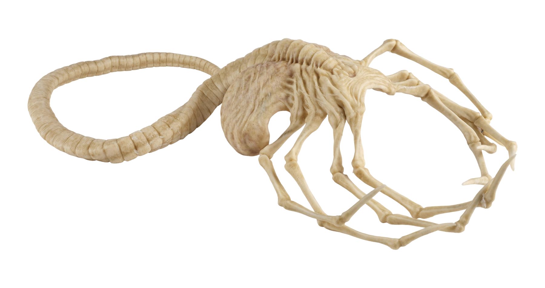 Jointly designed and created by the creature design and effects teams at Creatures Inc. Ltd. and Odd Studio, this jointed silicone facehugger is painted in shades of white and brown on the exterior with a fleshy pink underbelly. It features eight spindly legs molded around metal armatures and a long, coiled spiny tail. The silicone exhibits some peeling around its joints and protruding metal from production use and age. Dimensions: 20" x 15" x 8" (51 cm x 38.25 cm x 20.5 cm)