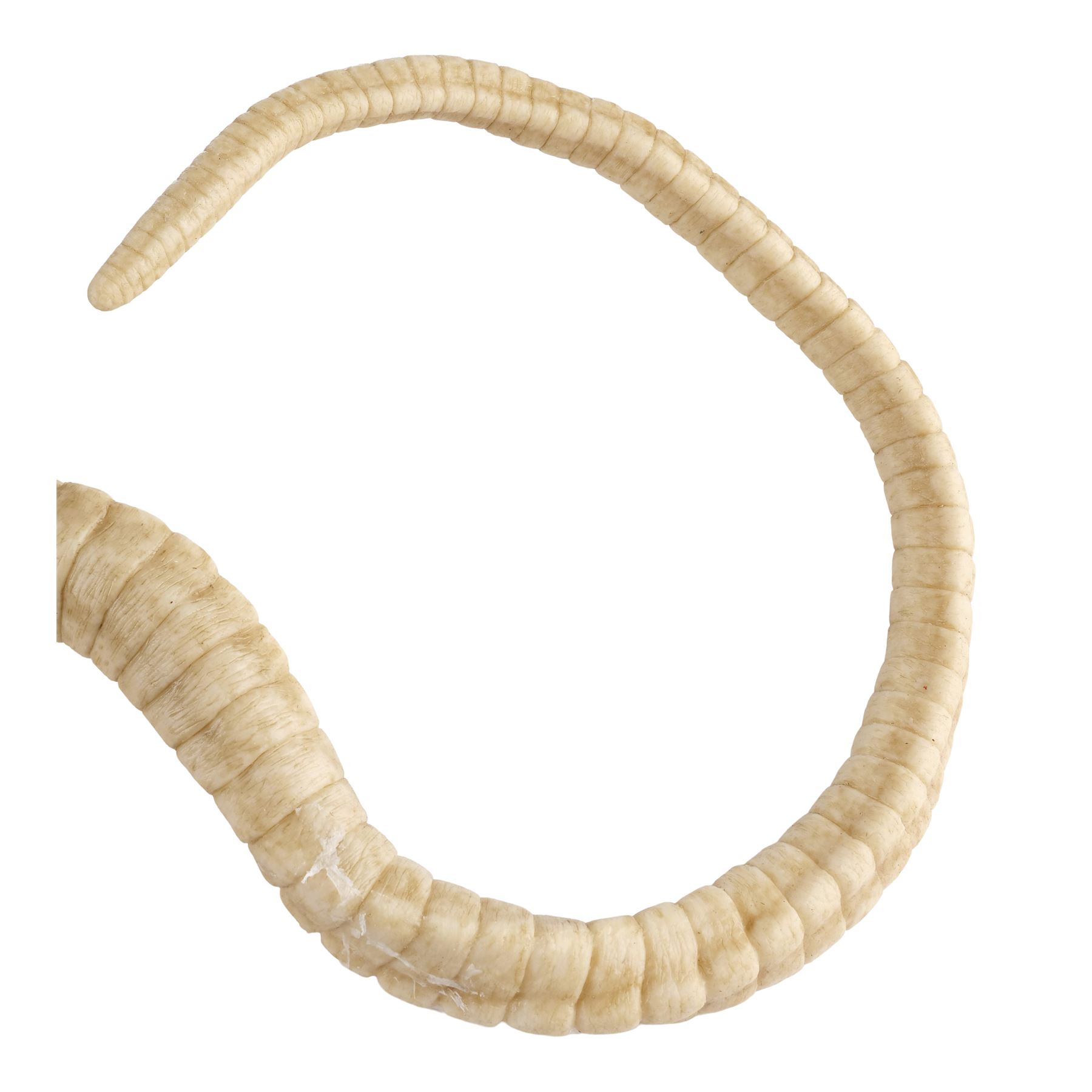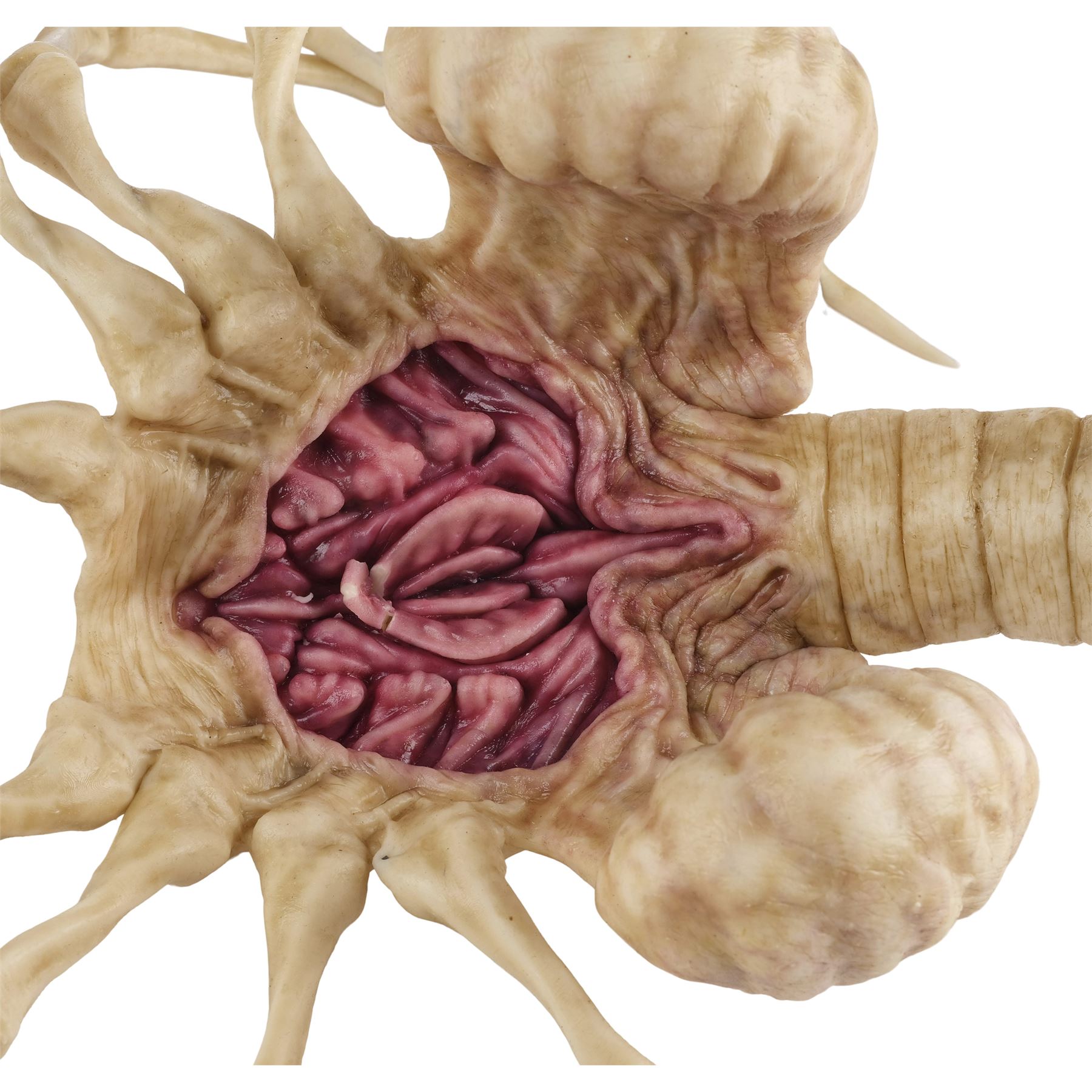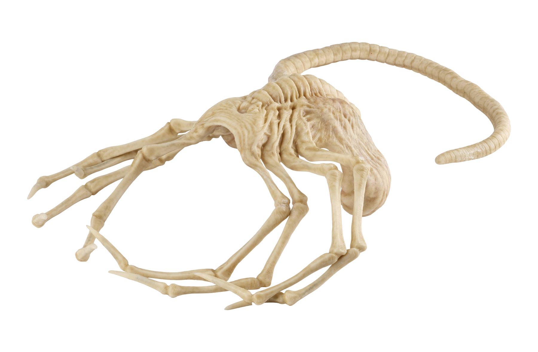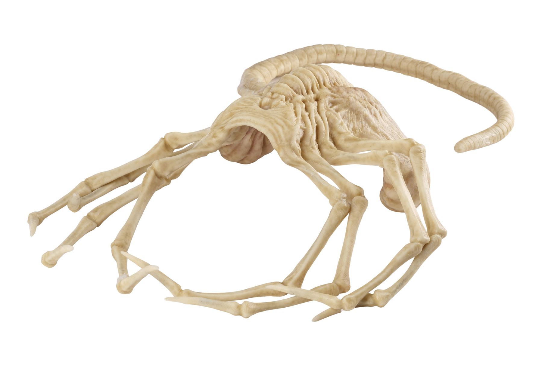 Jointly designed and created by the creature design and effects teams at Creatures Inc. Ltd. and Odd Studio, this jointed silicone facehugger is painted in shades of white and brown on the exterior with a fleshy pink underbelly. It features eight spindly legs molded around metal armatures and a long, coiled spiny tail. The silicone exhibits some peeling around its joints and protruding metal from production use and age. Dimensions: 20" x 15" x 8" (51 cm x 38.25 cm x 20.5 cm)
