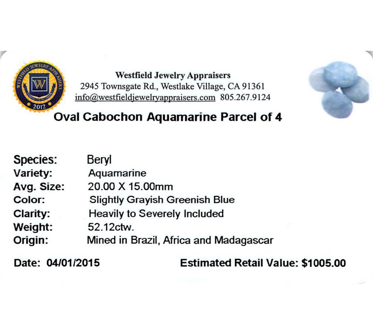 One oval cabochon cut natural aquamarine exact weight 52.12ct., clarity is heavily included, type I, medium, slightly grayish, very slightly greenish blue color, (GIA vslgB 5/2), cut is good. Westfield Appraised at $1,005.00.