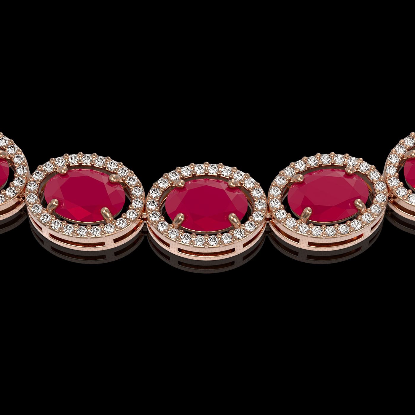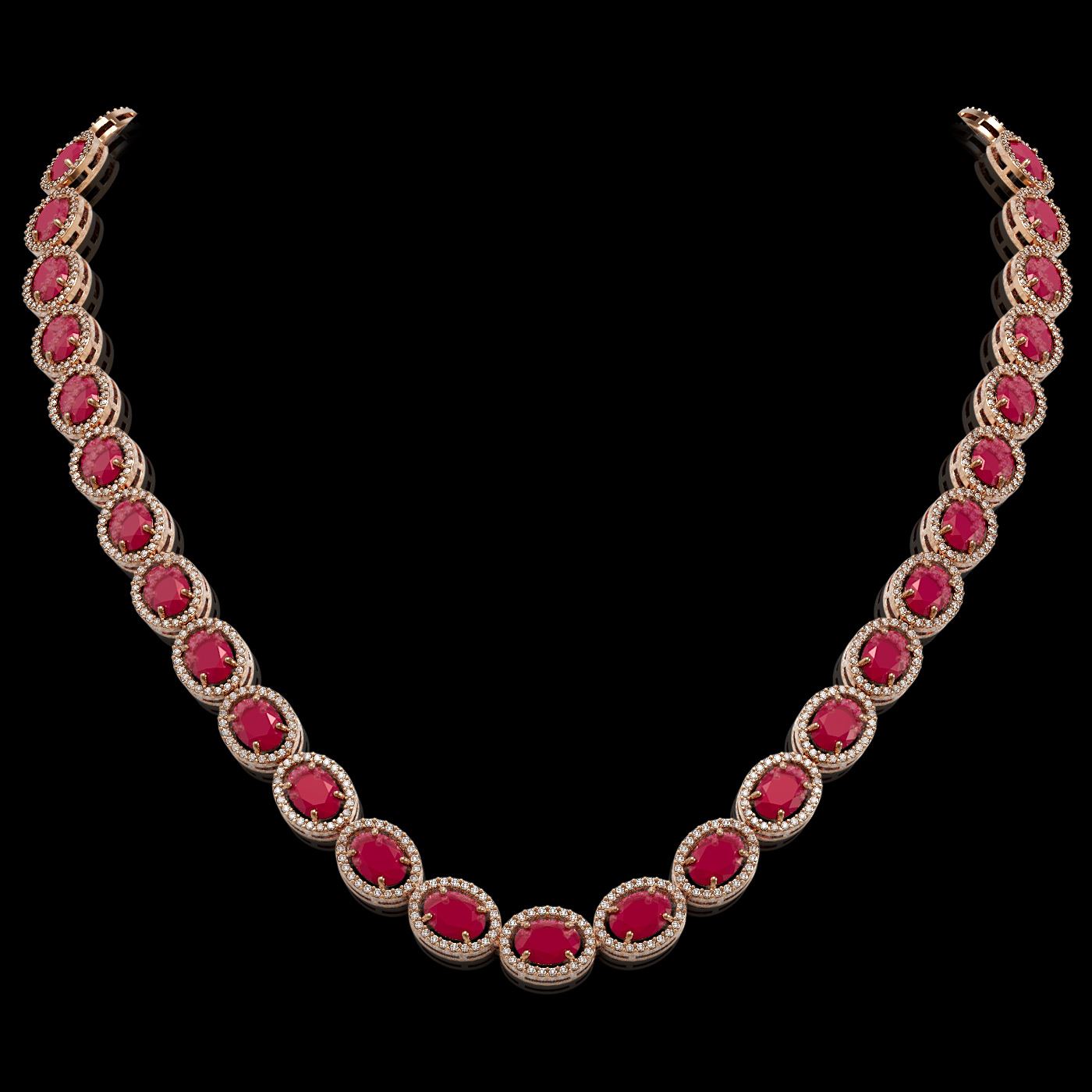 REF-655W3F -40557 ---- 52.15 CTW Ruby & Diamond Halo Necklace 10K Rose Gold ---- Luxury Designer Brand Necklace Appraised at $36,050 Certificate Number US40557 10k Rose gold, Necklace Size is 16 Inches, Necklace measuring approx. 9 mm x 16 Inches, weighing in total approx. 30 grams. Made in the USA and is stamped 10k, Main stone 45.12 carat total weight containing 39 pieces of Mid-Opaque-Deep Red color with AAA quality Oval shape cut Ruby , Stone #2 7.03 carat total weight containing 858 pieces of G-H color with VS/SI quality Round shape cut Diamond