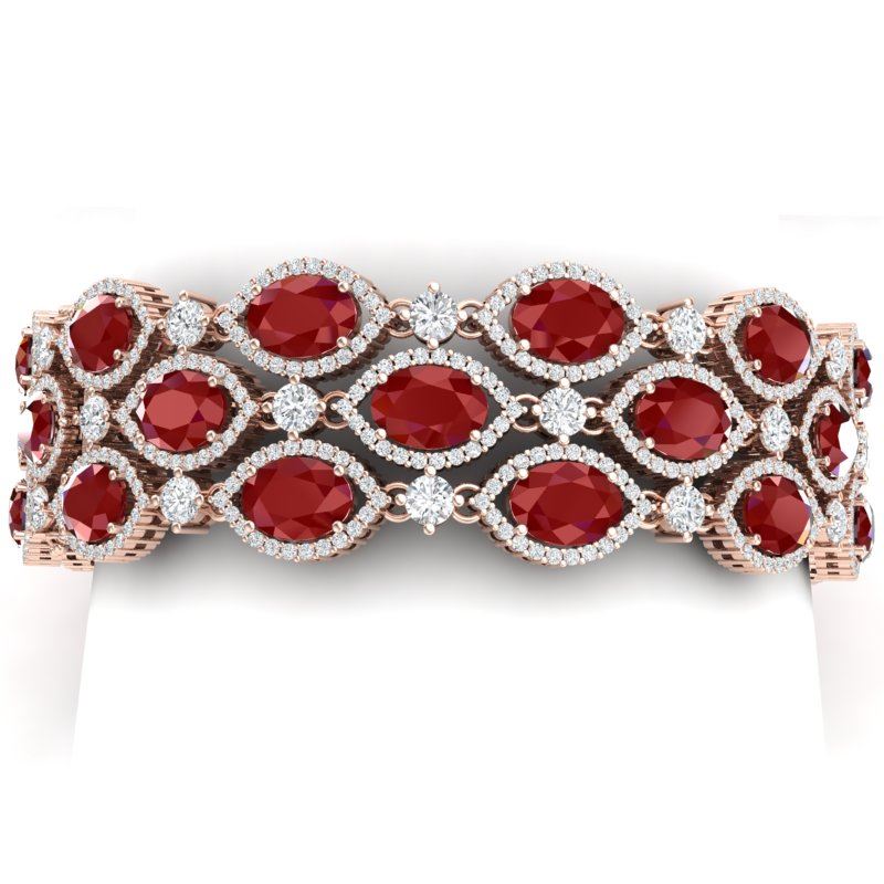 52.84 CTW Royalty Ruby & VS Diamond Bracelet 18K Rose Gold ---- Luxury Designer Brand Bracelet Appraised Retail Price at $91,000 ---- SKU Number US38890 18K Rose gold Bracelet Size is 7 Inches, Can custom fit length, Bracelet measuring approx. 3/4 x 7 Inches, weighing in total approx. 32 grams. Made in the USA and is stamped 18K, Main stone 42.84 carat total weight containing 36 pieces of Intense Mid-Opaque Red color with AAA quality Oval shape cut Ruby , Stone #2 10 carat total weight containing 846 pieces of G-H color with VS/SI quality Round shape cut