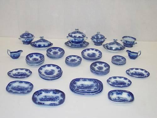 52 PC. PARTIAL DINNER SET MINIATURE FLOW BLUE DOLLS CHINA - AMOY PATTERN BY DAVENPORT - MINOR REPAIRS and IMPERFECTIONS;