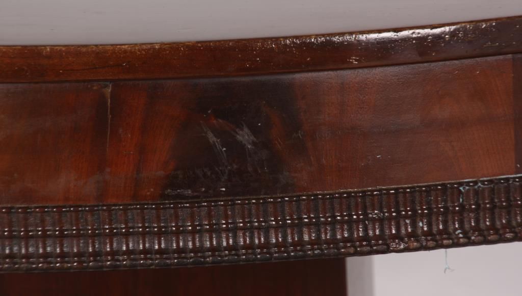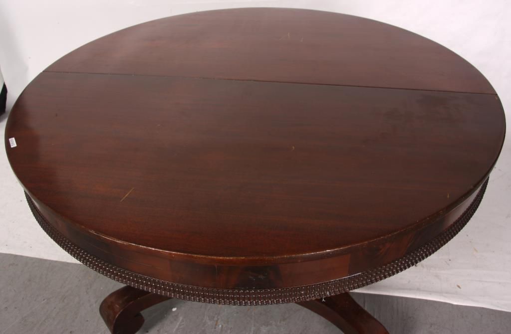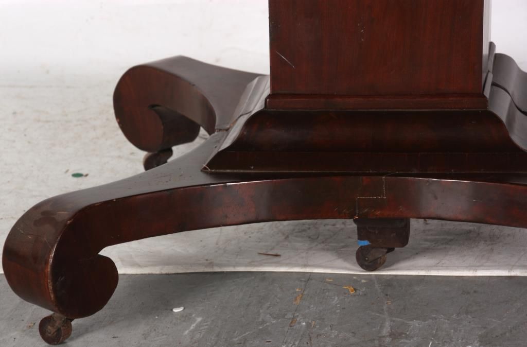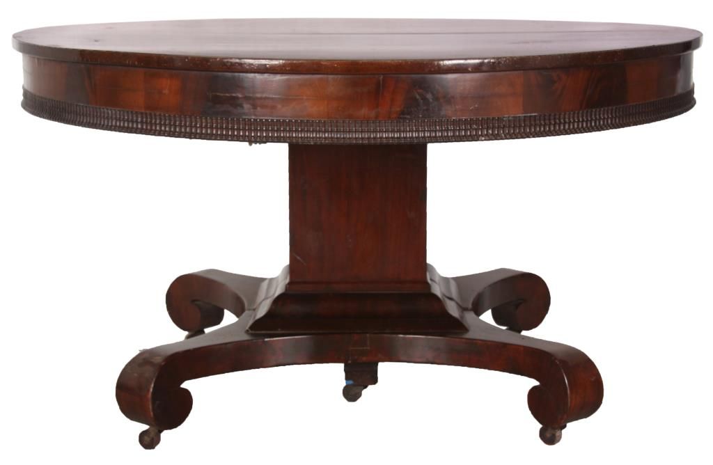 52 in. Mahogany Dining Table. Beautiful mahogany top with carved ripple molding on the bottom edge of the apron; the square mahogany, split pedestal has a stepped base on a convex arched platform with scrolled feet. In good overall condition, French polished finish, has a few minor veneer patches on the base, center leg is a replacement; comes with 2 skirted leaves measuring 13.25 in. wide, the leaves are old with skirts added. 30 in. high.