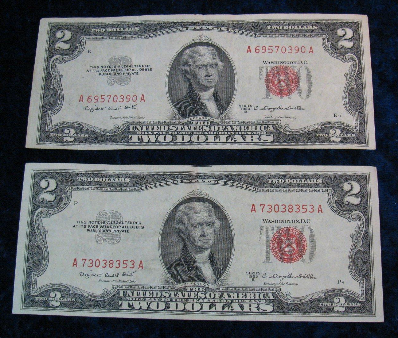 521. (2) Series 1953B $2 U.S. Notes. "Red Seals" VF.