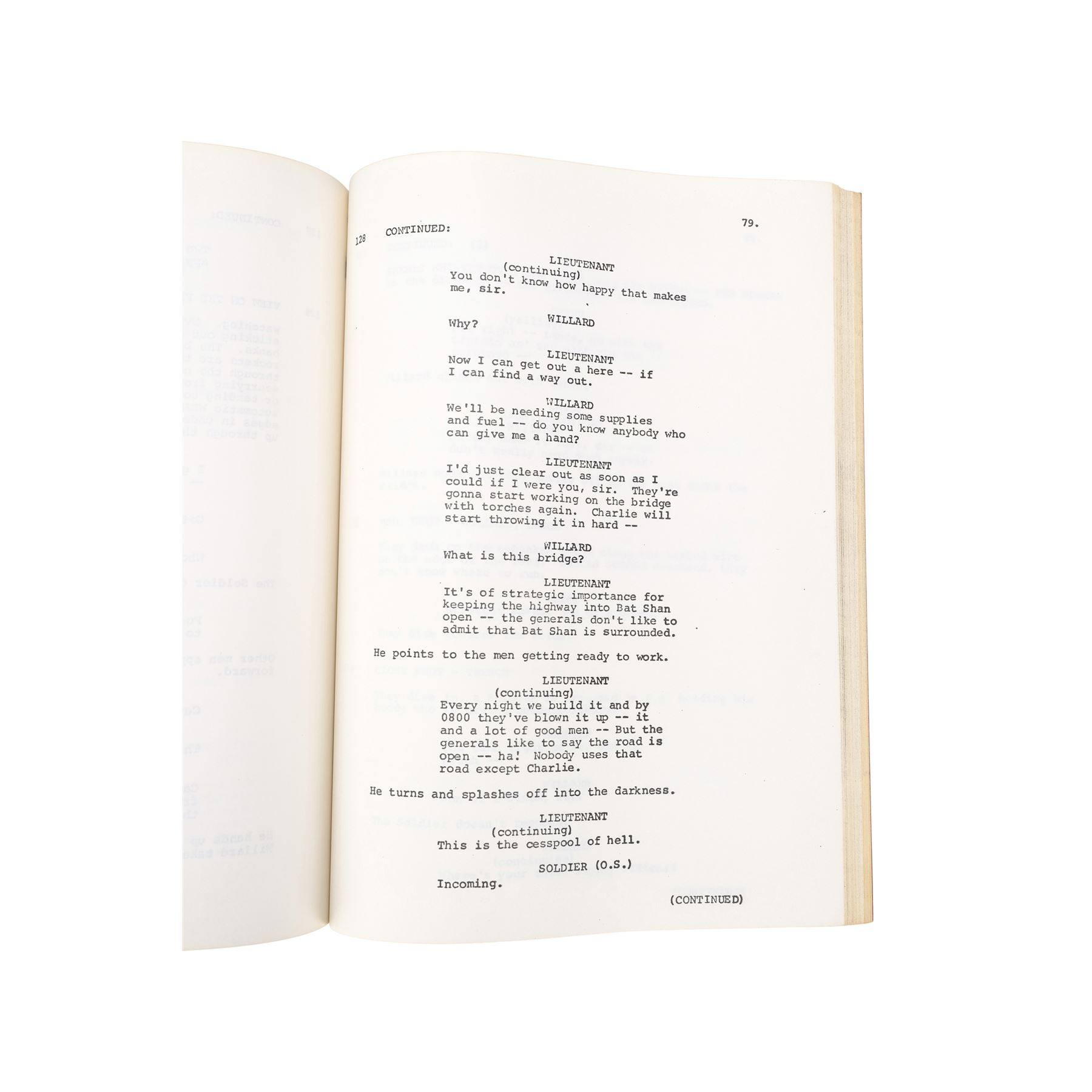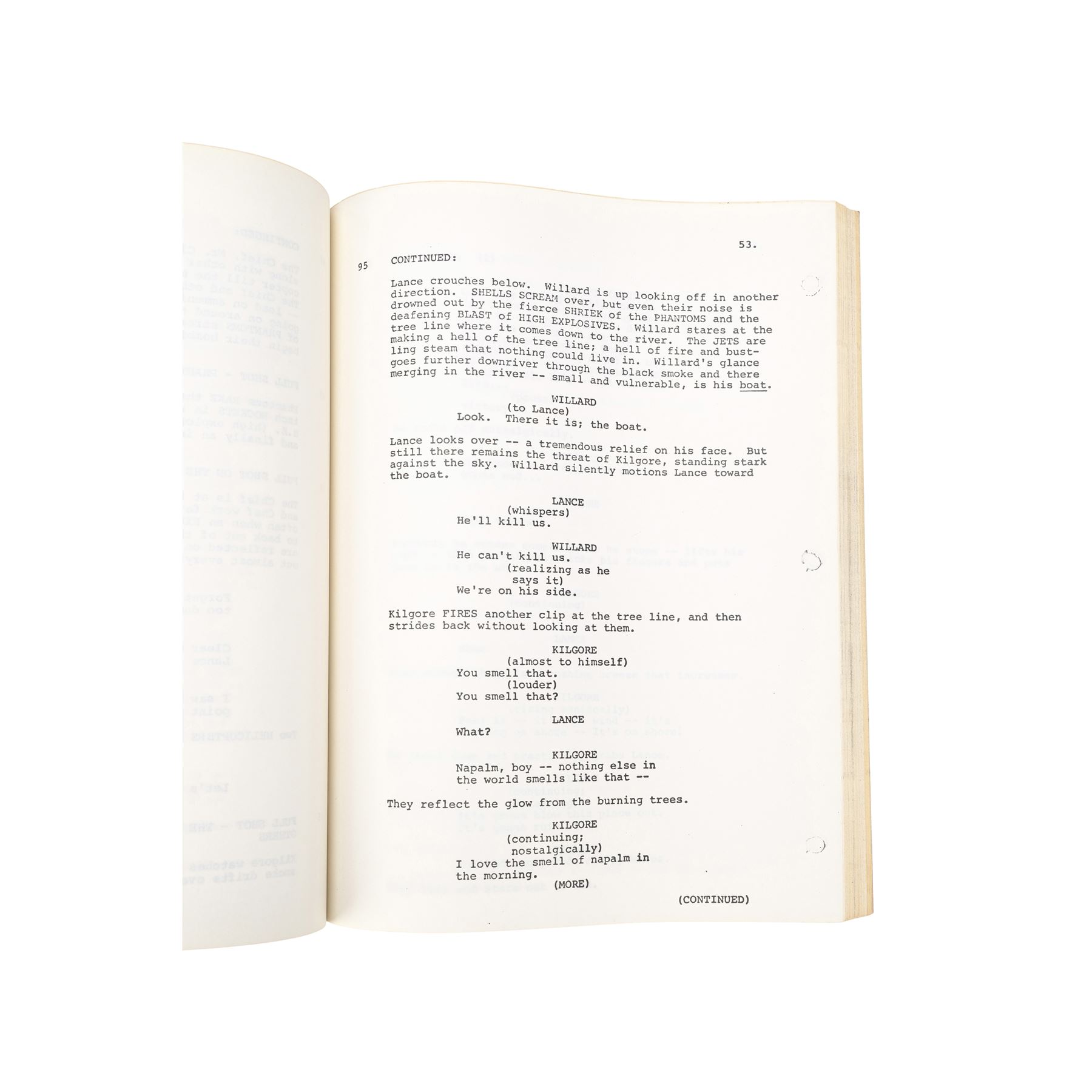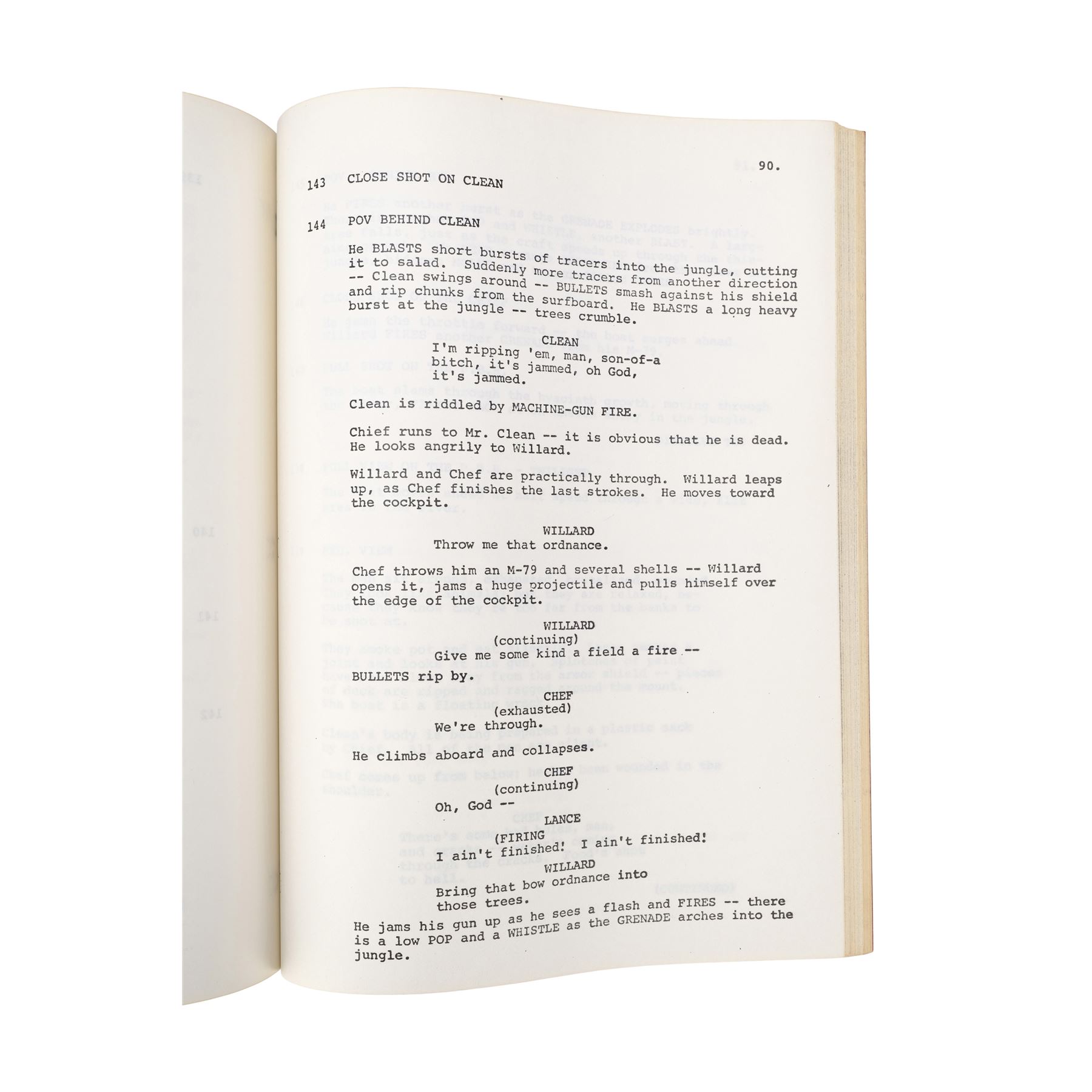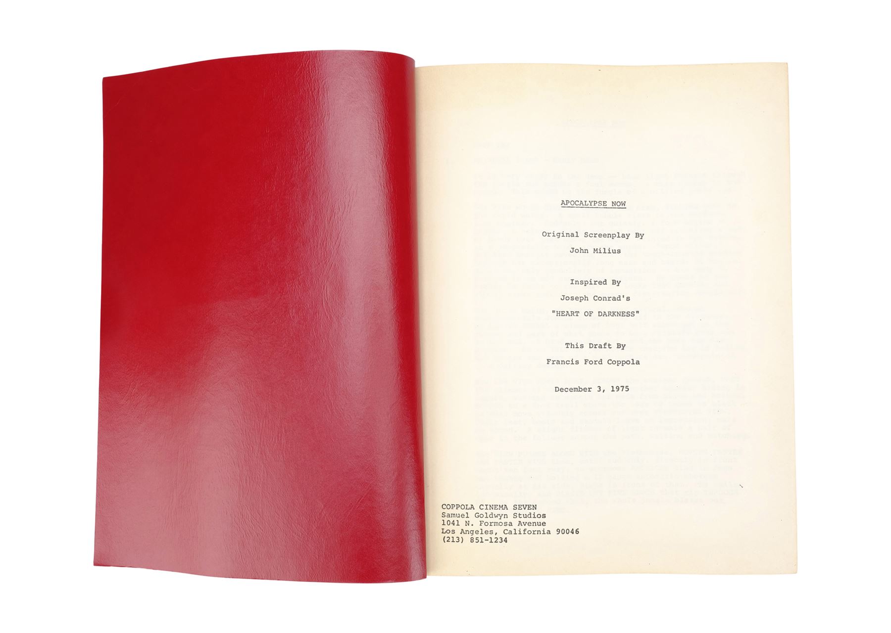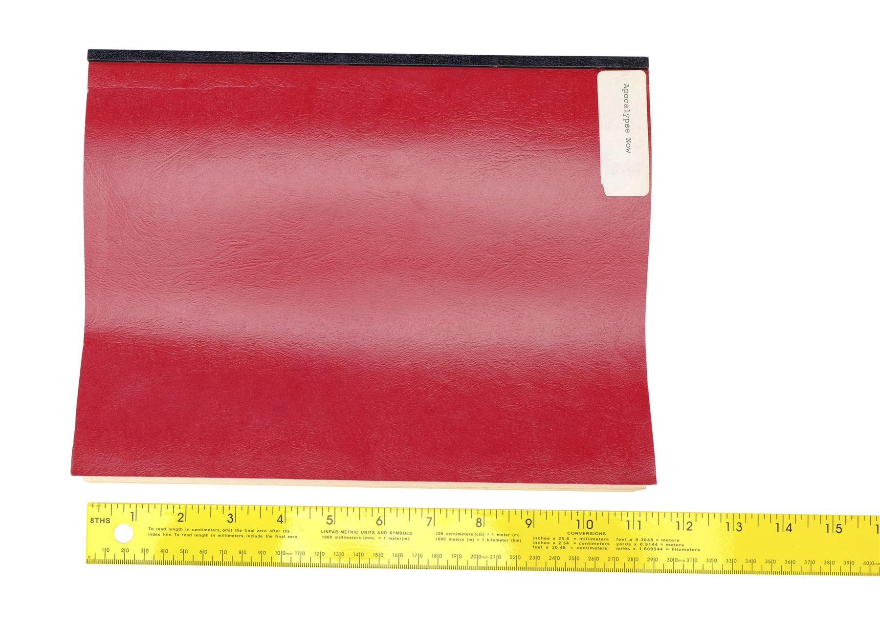 APOCALYPSE NOW (1979) - Bound Draft Script - A bound script from the production of Francis Ford Coppola's Apocalypse Now. Inspired by Joseph Conrad's "Heart of Darkness," this draft of John Milius' screenplay was written by Coppola and distributed by his production company Coppola Cinema Seven. The plastic-bound 156-page script is dated "December 3, 1975" and applied with a red faux vinyl cover labeled "Apocalypse Now." It exhibits bending from age and storage, and the sticker is coming loose from age. Dimensions: 8.5" x 11" x 0.75" (21.75 cm x 28 cm x 2 cm)