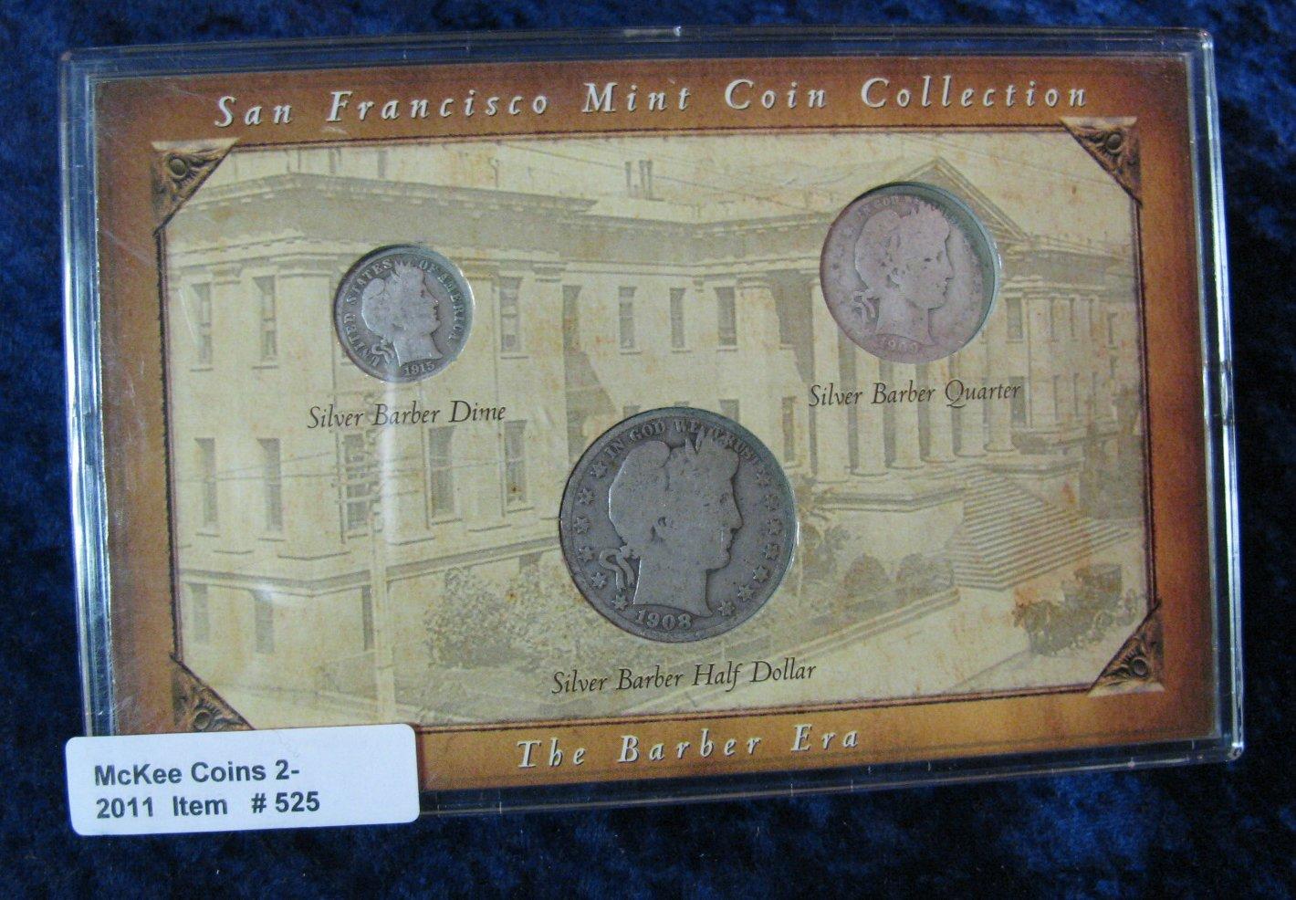 525. The Barber Era Three-Piece Set of San Francisco Mint Coins. Dime to Half Dollar. All 90% Silver.