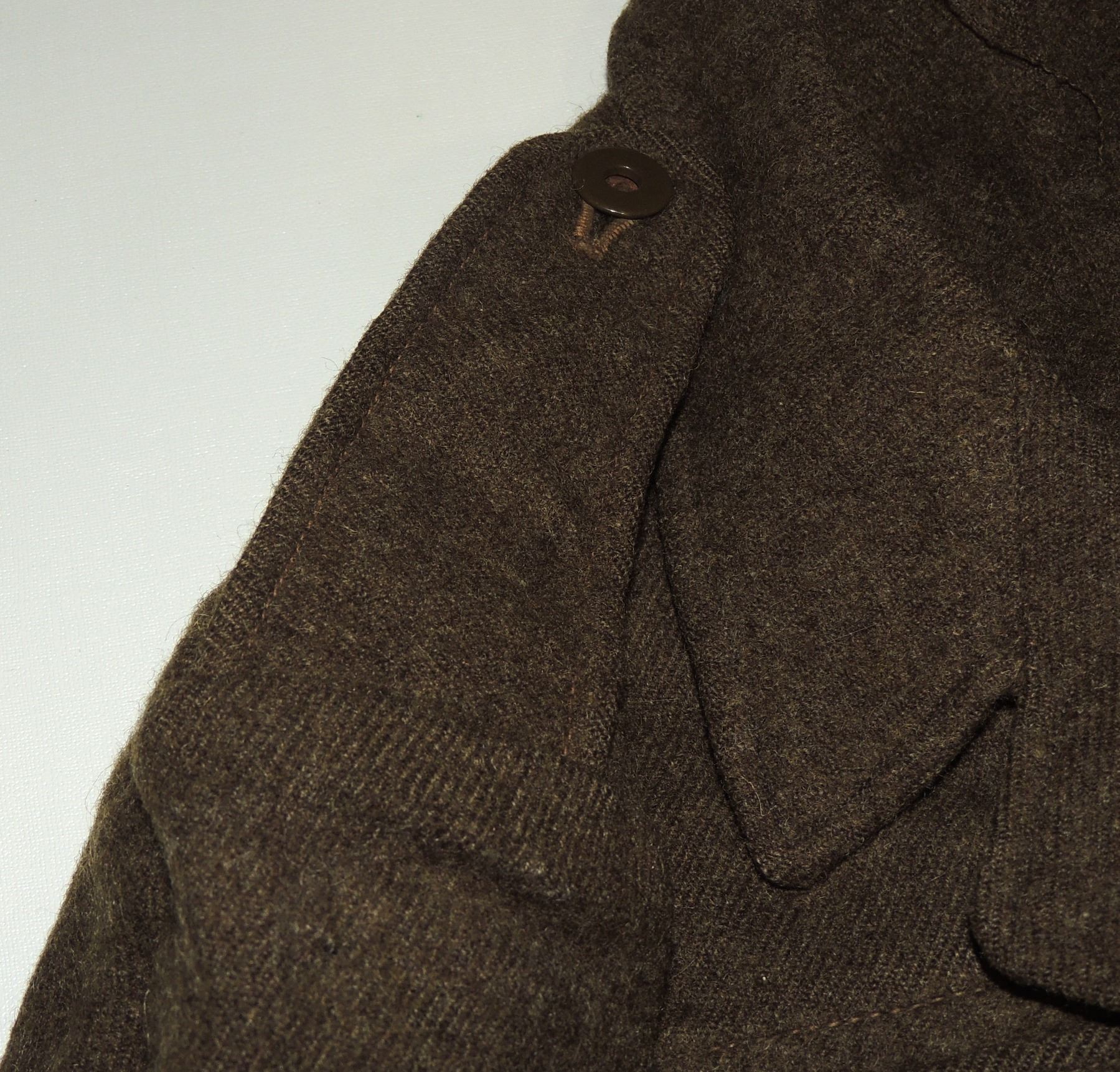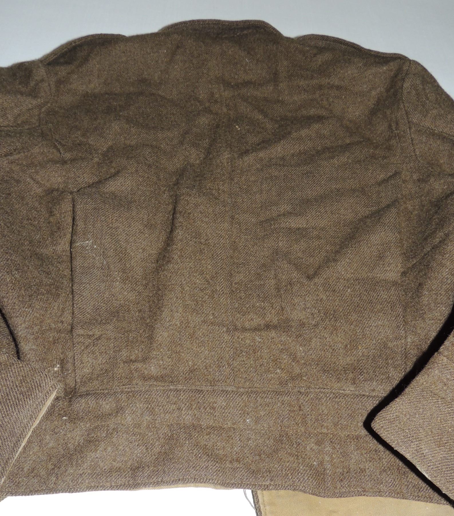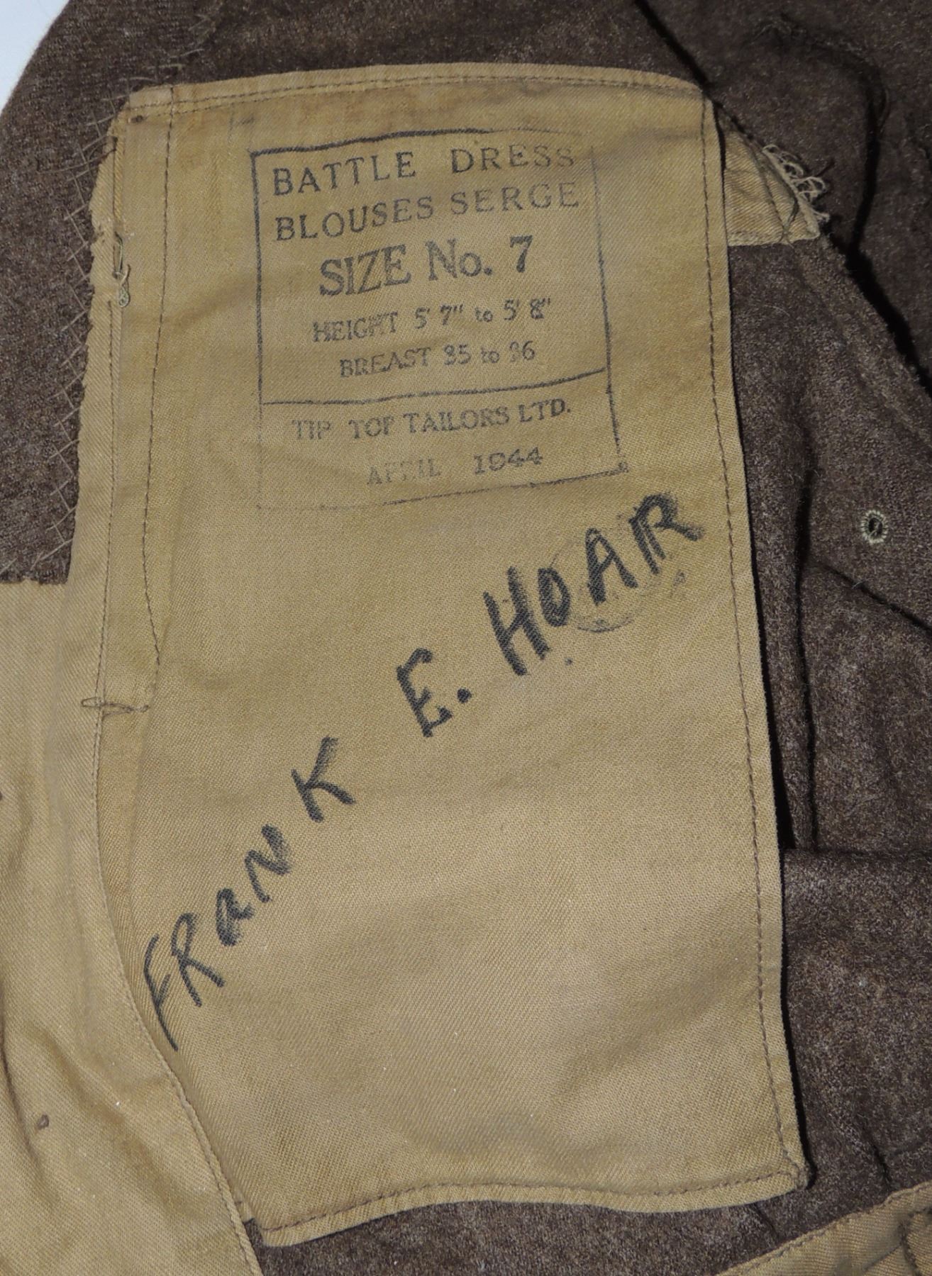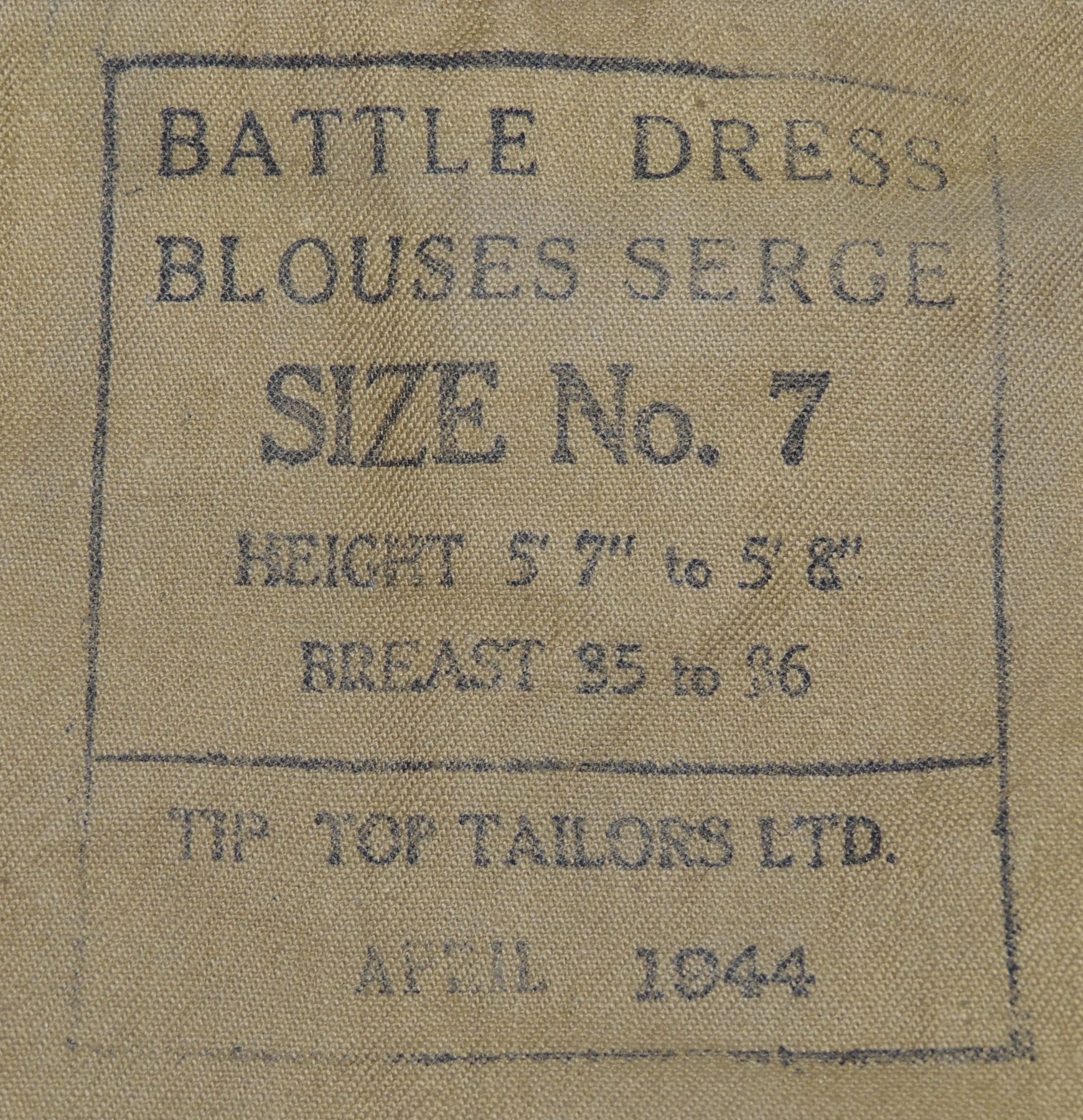 WORLD WAR TWO CANADIAN BATTLEDRESS, , C-> MARKED INTERIOR BENEATH NAME AND DATED APRIL 1944 BY TIP TOP TAILORS. FAIR CONDITION, WITH TWO RED CHEVRONS FOR SERVICE YEARS ON SLEEVE. INTERIOR NAMED. WW2 WORLD WAR TWO CANADIAN UNIFORM ALLIED MILITARY FORCES