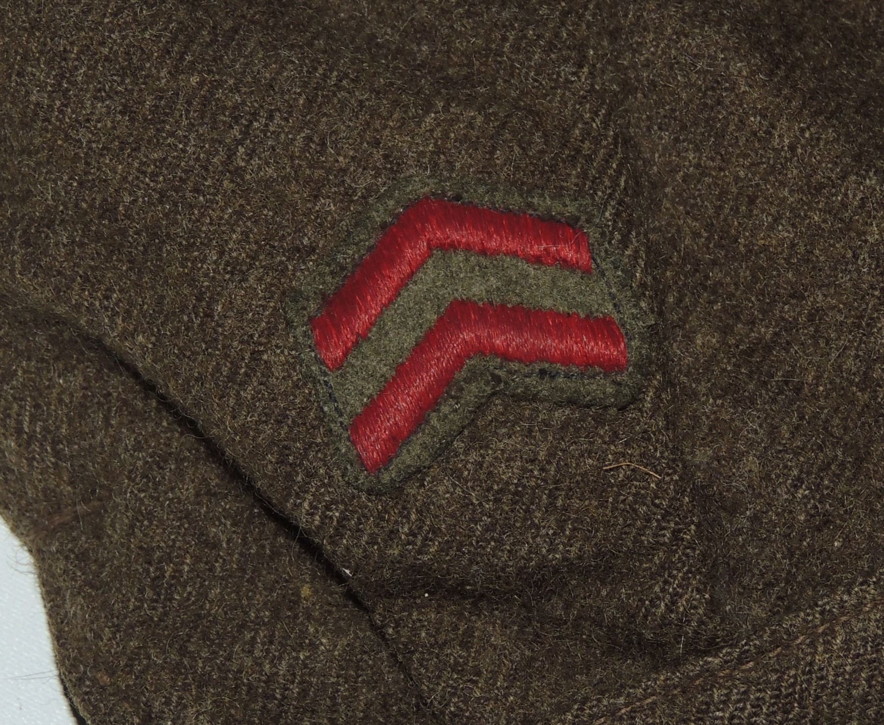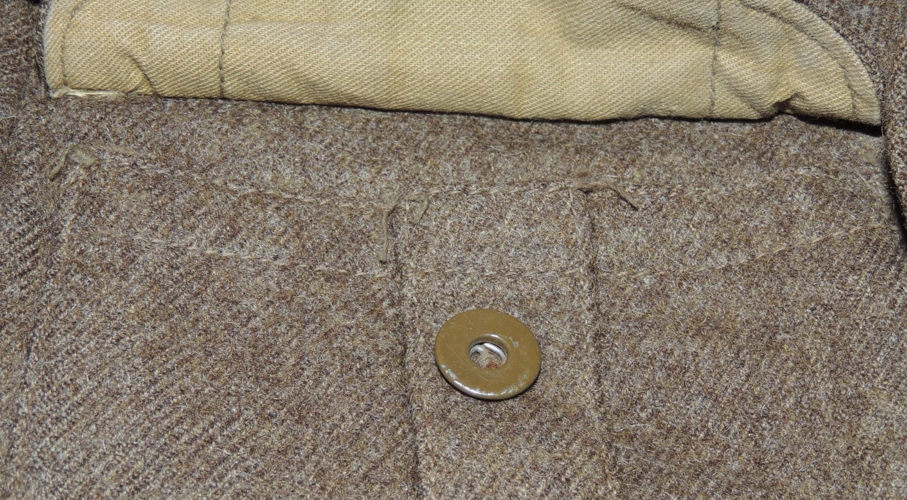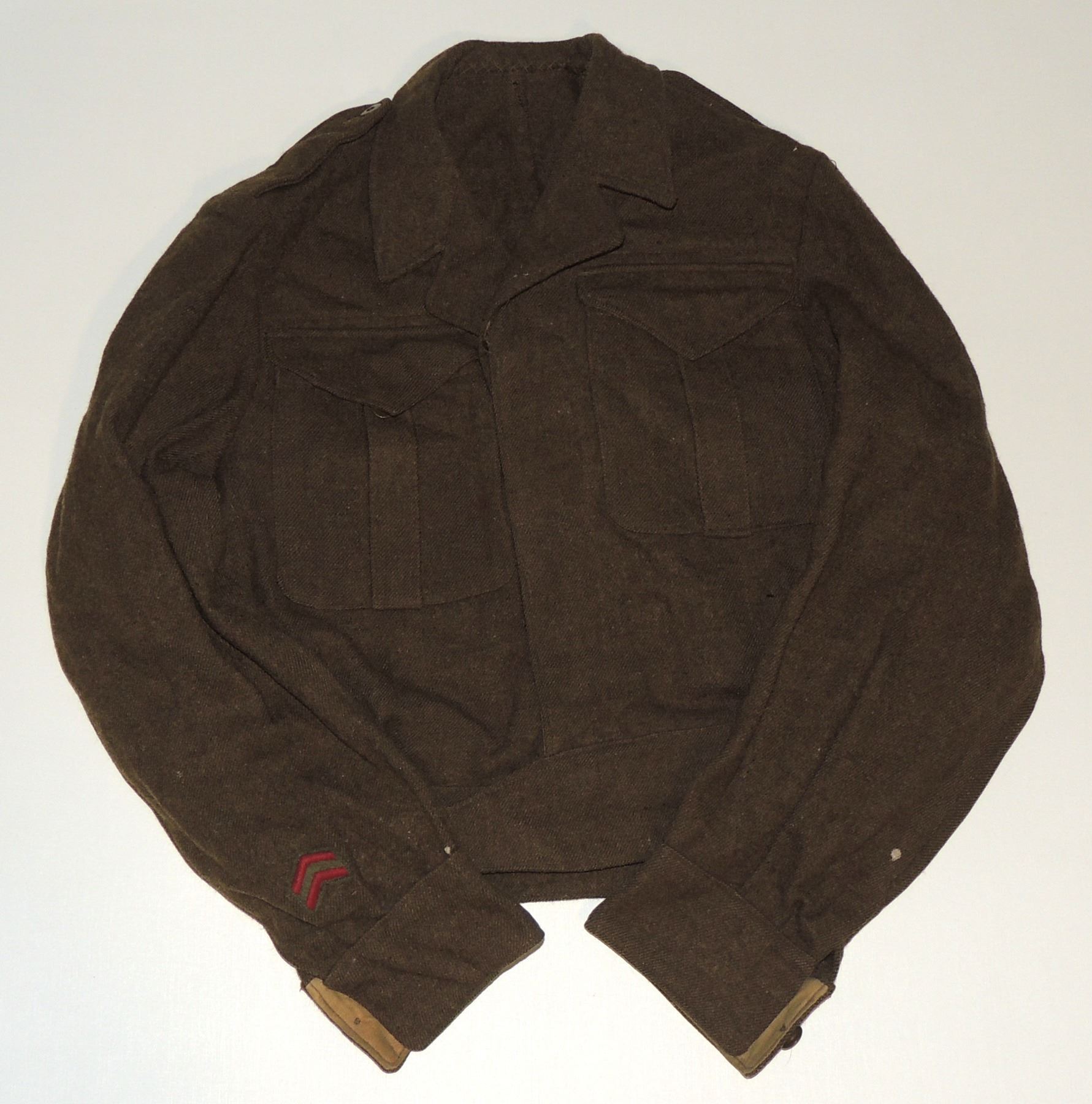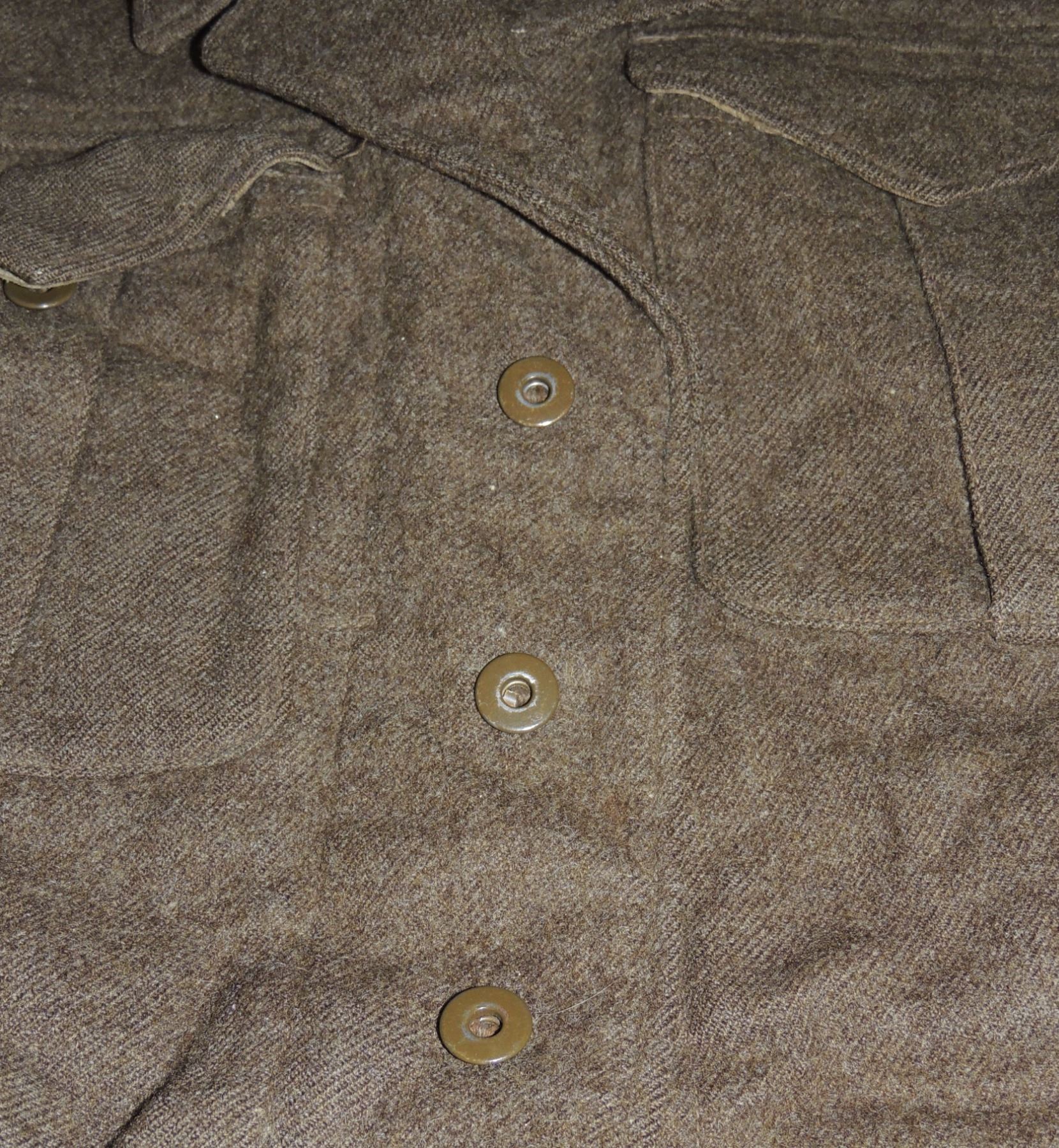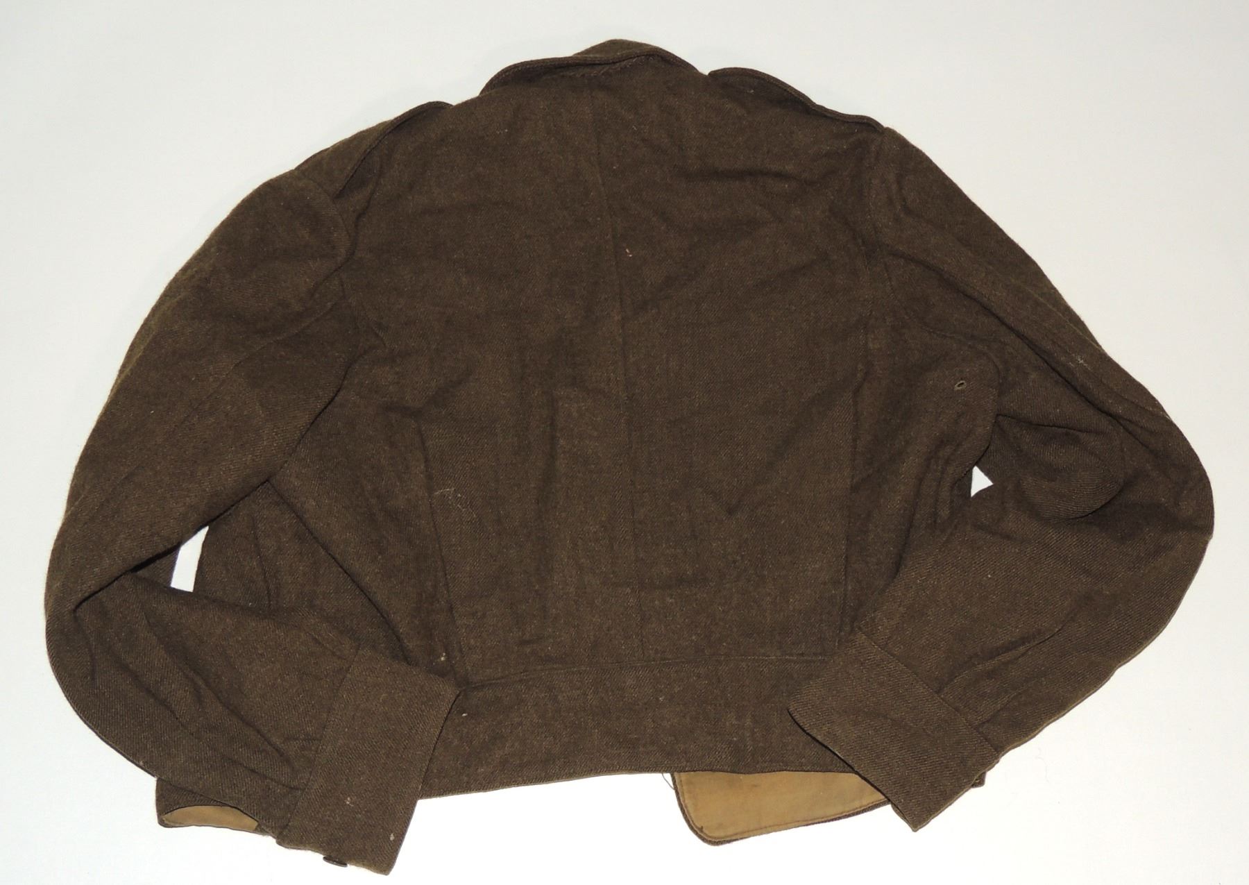 WORLD WAR TWO CANADIAN BATTLEDRESS, , C-> MARKED INTERIOR BENEATH NAME AND DATED APRIL 1944 BY TIP TOP TAILORS. FAIR CONDITION, WITH TWO RED CHEVRONS FOR SERVICE YEARS ON SLEEVE. INTERIOR NAMED. WW2 WORLD WAR TWO CANADIAN UNIFORM ALLIED MILITARY FORCES