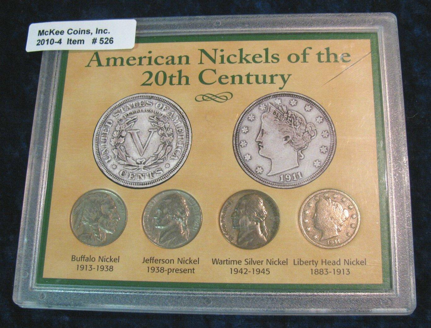 526. "American Nickels of the 20th Century" Type Set in special case. Includes Buffalo Nickel, Jefferson Nickel, Silver World War II Nickel; & Liberty Nickel.