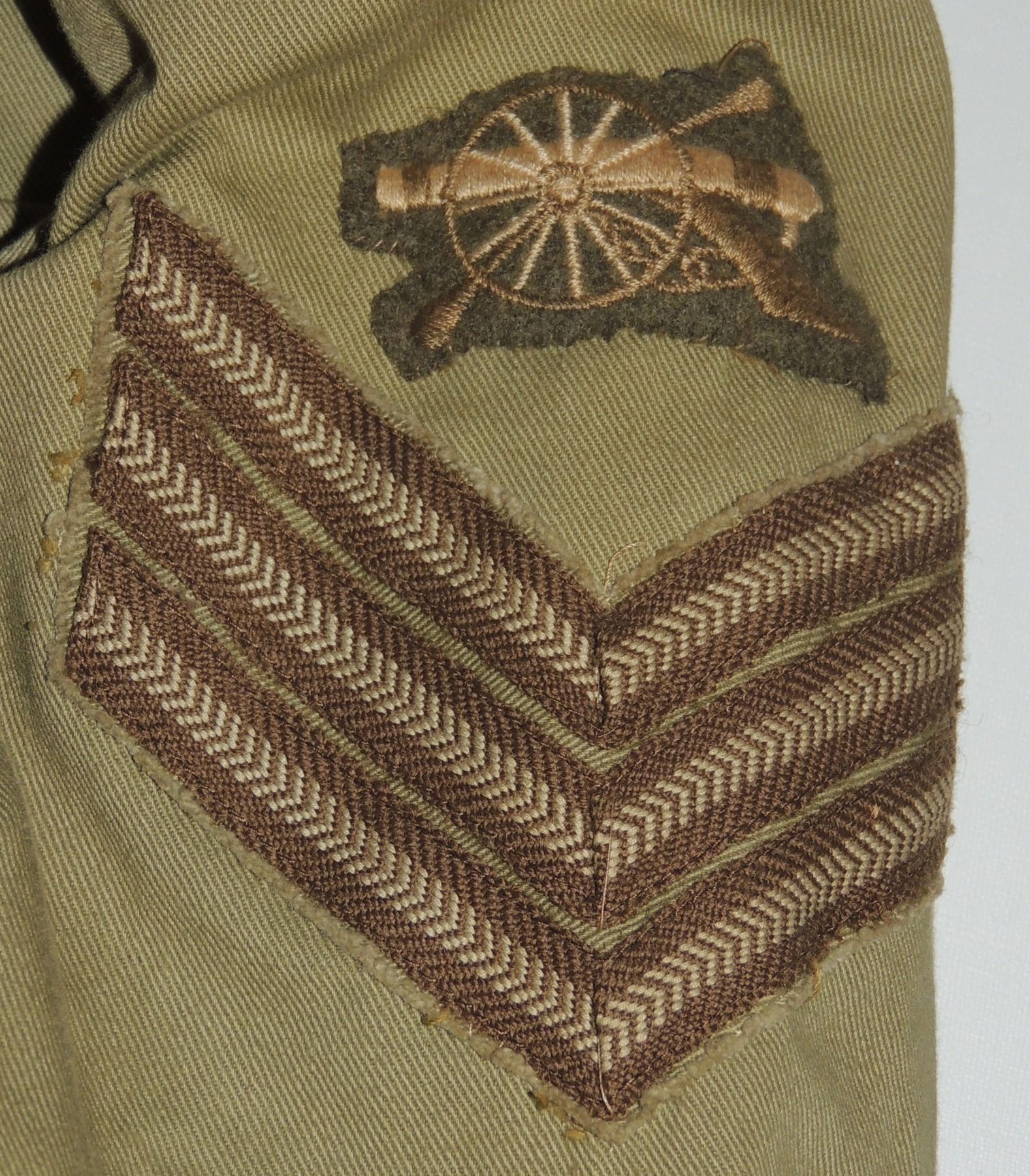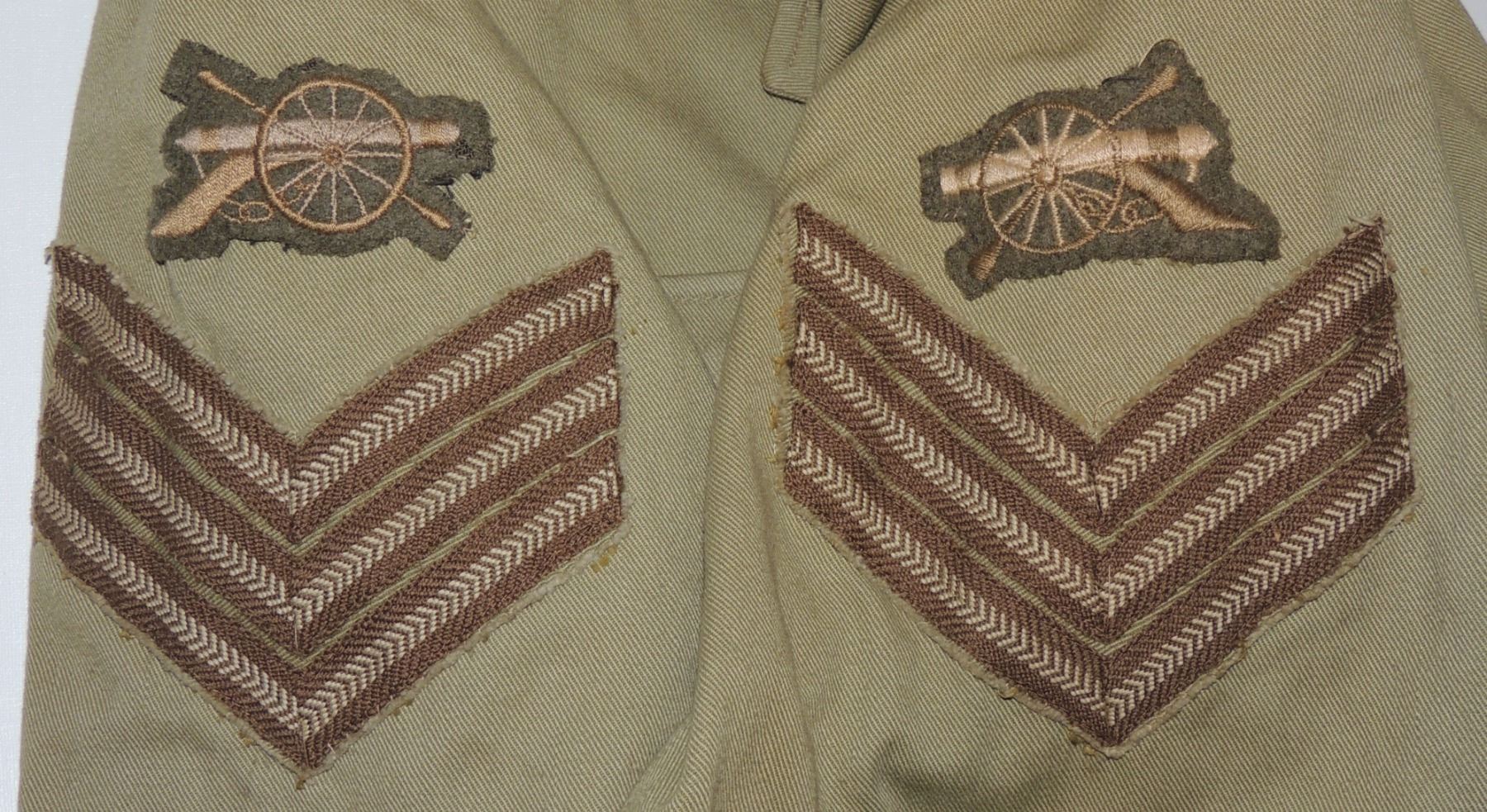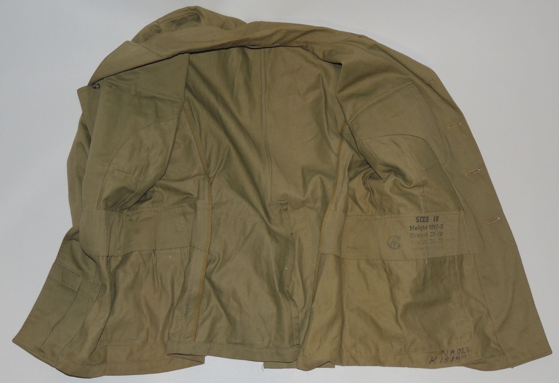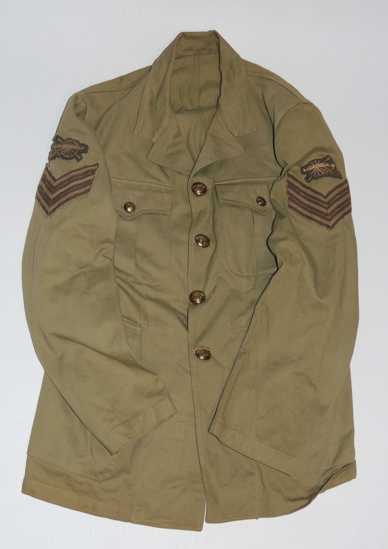 SUMMER TUNIC TO ROYAL CANADIAN ARTILLERY, NAMED TO "NAGLE K15199" OF THE 31ST HEAVY BATTERY RCA. DATED 1942, SIZE 18 WITH C-> C BROAD ARROW. WW2 WORLD WAR TWO CANADIAN UNIFORM ALLIED MILITARY FORCES