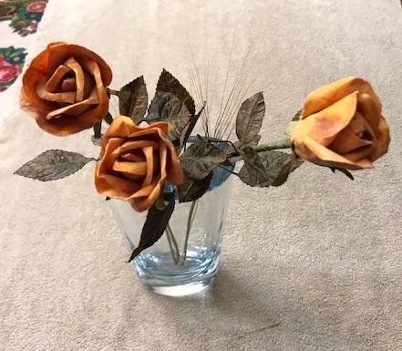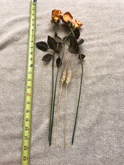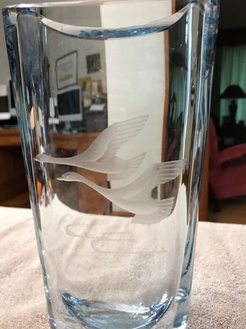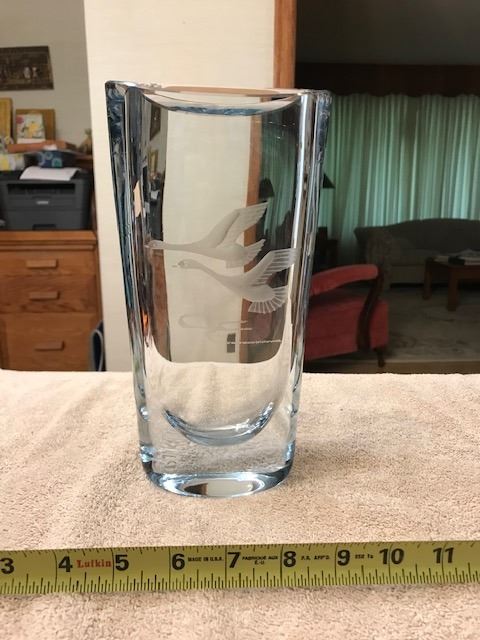 #528: Thick 0.5’’ (1.3 cm) glass vase with etching of 2 Canada geese. Base 4” (10 cm) across x 9.25” (23.5 cm) high. 5” (13 cm) across on top + 3 paper cache roses 18” (46 cm) long with metal leaves + 2 wheat heads. All excellent condition.