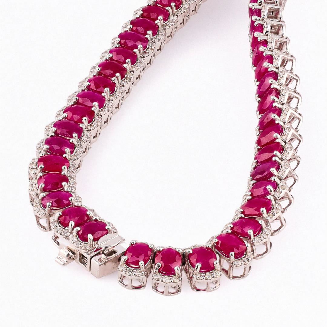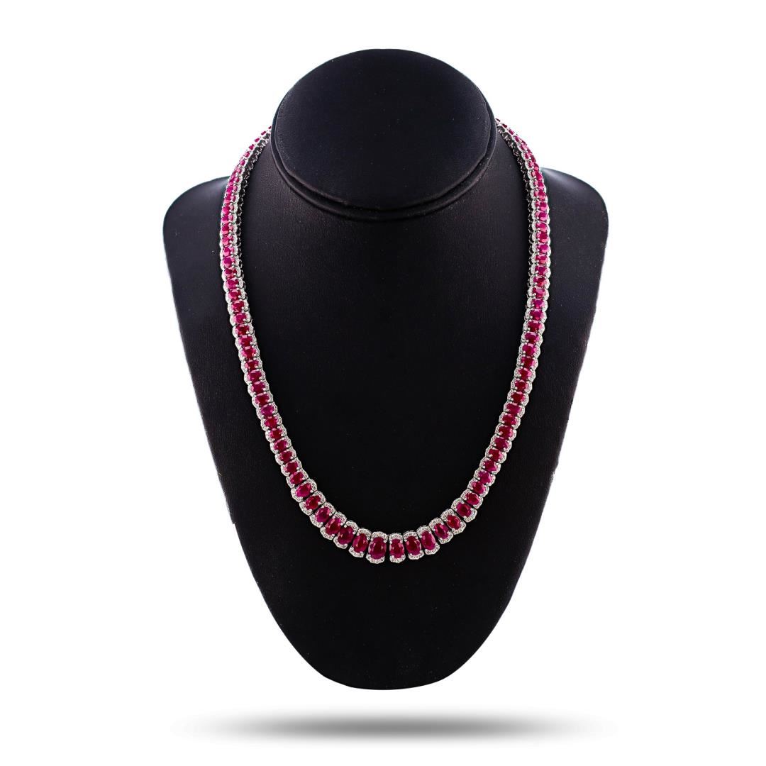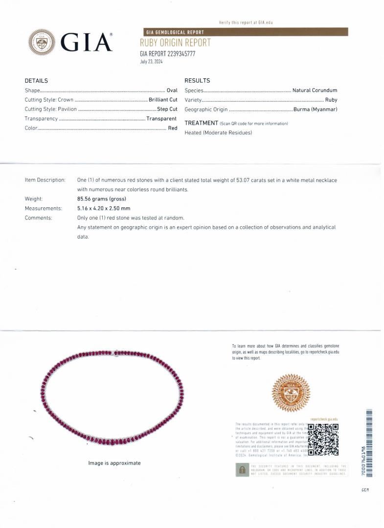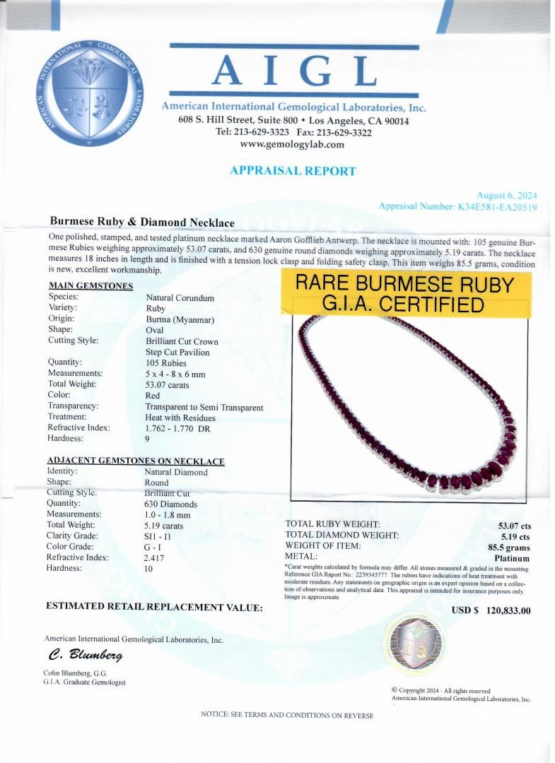 One polished, stamped, and tested platinum necklace marked Aaron Gofflieb Antwerp. The necklace is mounted with: 103 genuine Burmese Rubies weighing approximately 53.07 carats, and 630 genuine round diamonds weighing approximately 5.19 carats. The necklace measures 18 inches in length and is finished with a tension lock clasp and folding safety clasp. This item weighs 85.5 grams, condition is new, excellent workmanship. GIA: 2239345777 #MAIN GEMSTONES# Species: Natural Corundum Variety: Ruby Origin: Burma (Myanmar) Shape: Oval Cutting Style: Brilliant Cut Crown, Step Cut Pavilion Quantity: 105 Rubies Measurements: 5 x 4 - 8 x 6mm Total Weight: 53.07 carats Color: Red Transparency: Transparent to Semi Transparent Treatment: Heat with Residues Refractive Index: 1.762 - 1.770 DR Hardness: 9 #ADJACENT GEMSTONES ON NECKLACE# Identity: Natural Diamond Shape: Round Cutting Style: Brilliant Cut Quantity: 630 Diamonds Measurements: 1.0 - 1.8mm Total Weight: 5.19 carats Clarity Grade: SI1-I1 Color Grade: G-I Refractive Index: 2.417 Hardness: 10 #TOTAL RUBY WEIGHT: 53.07 cts TOTAL DIAMOND WEIGHT: 5.19 cts WEIGHT OF ITEM: 85.5 grams METAL: Platinum Size: 18