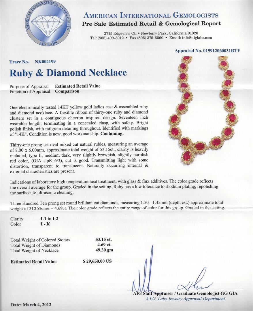 One electronically tested 14KT yellow gold ladies cast & assembled ruby and diamond necklace. A flexible ribbon of thirty-one ruby and diamond clusters set in a contiguous chevron inspired design. Seventeen inch wearable length, terminating in a concealed clasp, with safety. Bright polish finish, with milgrain detailing throughout. Identified with markings of "14K". Condition is new, good workmanship. Containing: Thirty-one prong set oval mixed cut natural rubies, measuring an average of 8.00 x 6.00mm, approximate total weight of 53.15ct., clarity is heavily included, type II, medium dark, very slightly brownish, slightly purplish red color, (GIA s1pR 6/3), cut is good. Transmitting light with some distortion, transparent ot translucent. Naturally occurring internal & external characteristics are present. Indications of laboratory high temperature heat treatment, with glass & flux additives. Color grade reflects the overall average for the group. Graded in the setting. Ruby has a low tolerance to rhodium plating, repolishing the surface, & ultrasonic cleaning. Three Hundred Ten prong set round brilliant cut diamonds, measuring 1.50 - 1.45mm (depth est.) approximate total weight of 310 Stones = 4.69ct. The color grade reflects the entire range of color for this group. Graded in the setting. Clarity: I-1 to I-2. Color: I - K. Total Weight of Colored Stones: 53.15ct. Total Weight of Diamonds: 4.69ct. Total Weight of Necklace: 49.30gm. AIG Appraised at $29,650.00.