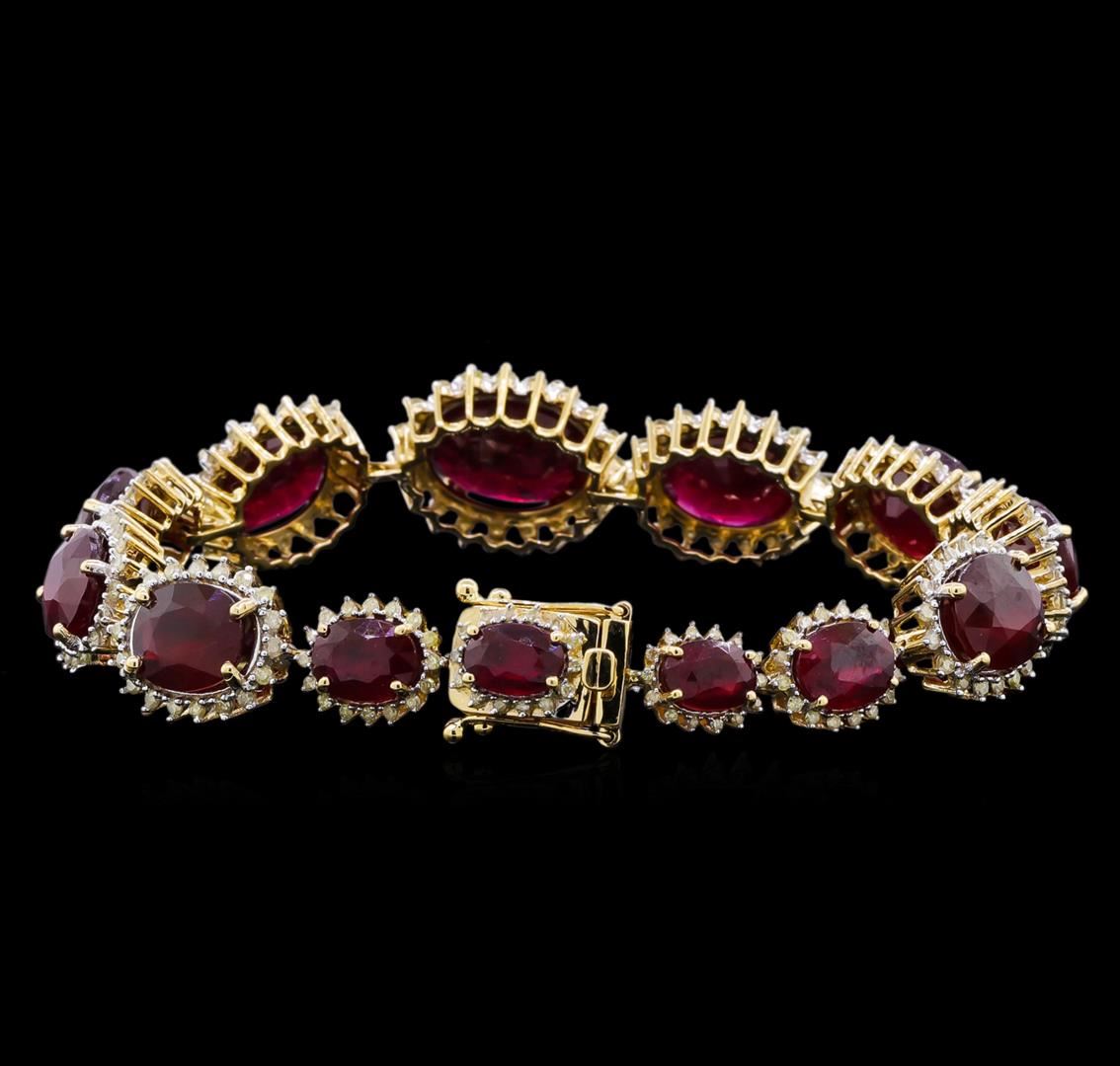 One electronically tested 14KT yellow gold ladies cast & assembled ruby and diamond bracelet. Seven and one-quarter inch length bracelet features a flexible graduating ruby and diamond floret ribbon, terminating in a concealed clasp with twin safeties. Bright polish finish with rhodium accents. Trademark is Orianne. Identified with markings of "14K". Condition is new, good workmanship. Containing: Thirteen prong set oval mixed cut natural rubies approximate total weight of 53.19ct., clarity is heavily included, type II, dark, very slightly brownish, red color, (GIA R 7/3), cut is good. Transmitting light somewhat diffusely, transparent to translucent. Naturally occurring internal & external characteristics are present. Indications of laboratory high temperature heat treatment, with glass & flux additives. The color grade is an average for the group. Graded in the setting. Ruby has a low tolerance to rhodium plating, repolishing the surface, & ultrasonic cleaning. Two Hundred Twenty-Three prong set round brilliant cut diamonds approximate total weight of 223 Stones = 2.35ct. Graded in the setting. Clarity: I-2 to I-3. Color: J - L. Total Weight of Colored Stones 53.19ct. Total Weight of Diamonds 2.35ct. Total Weight of Bracelet 28.21gm. AIG Appraised at $16,910.00.