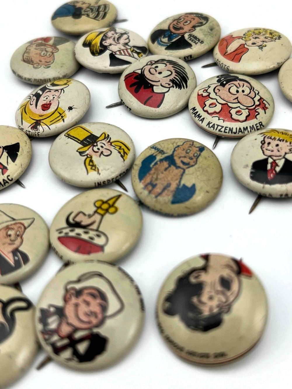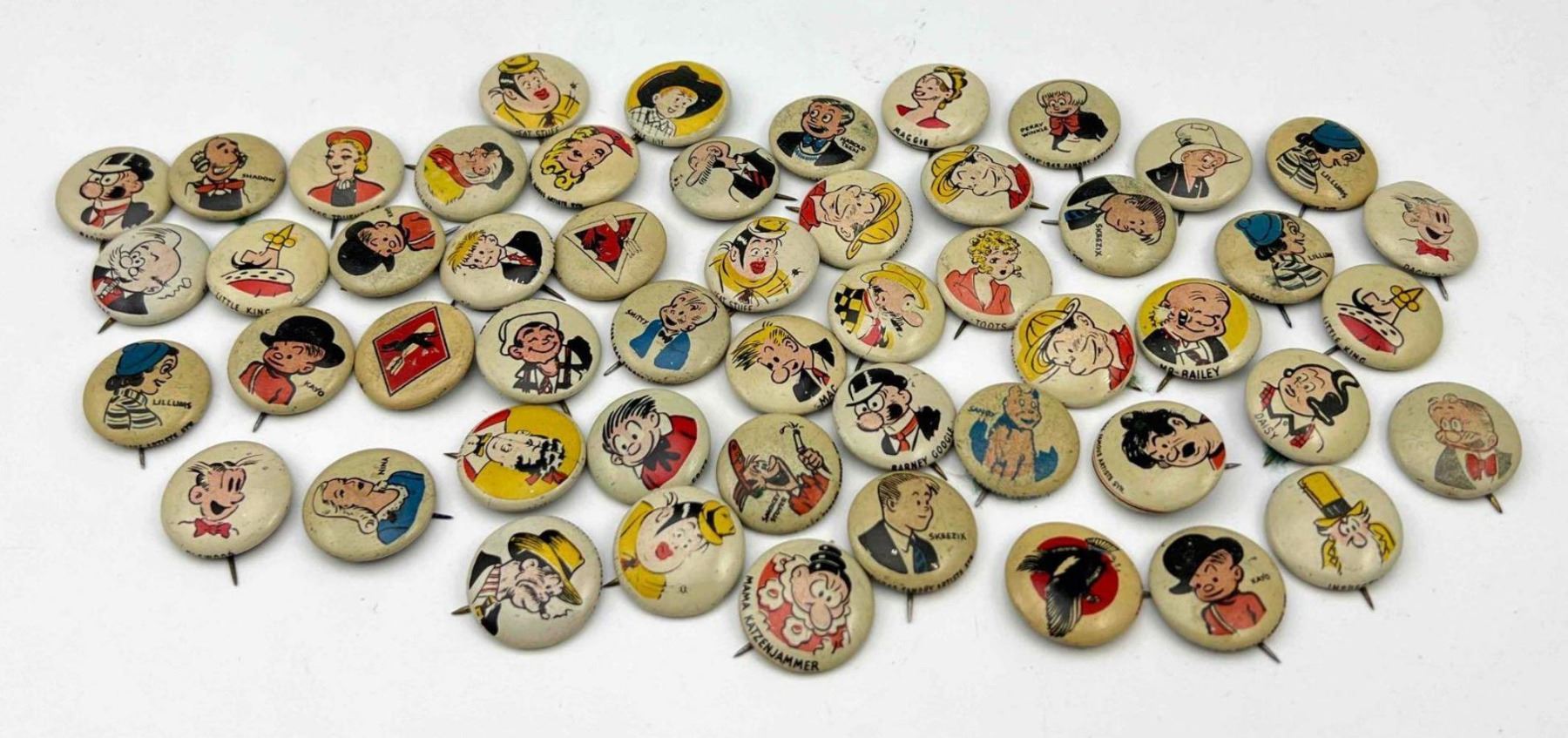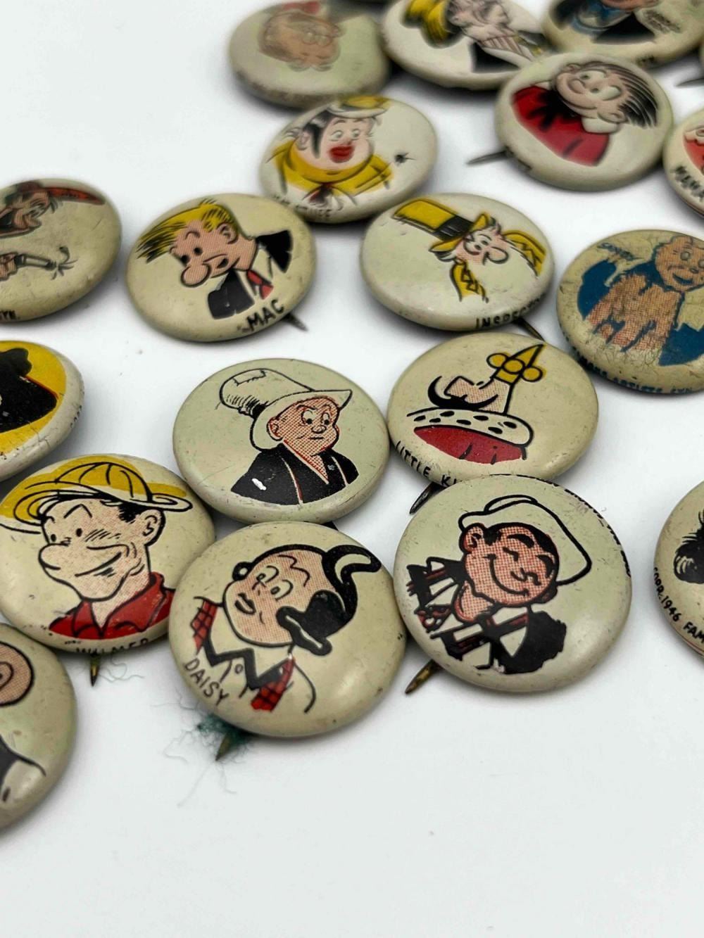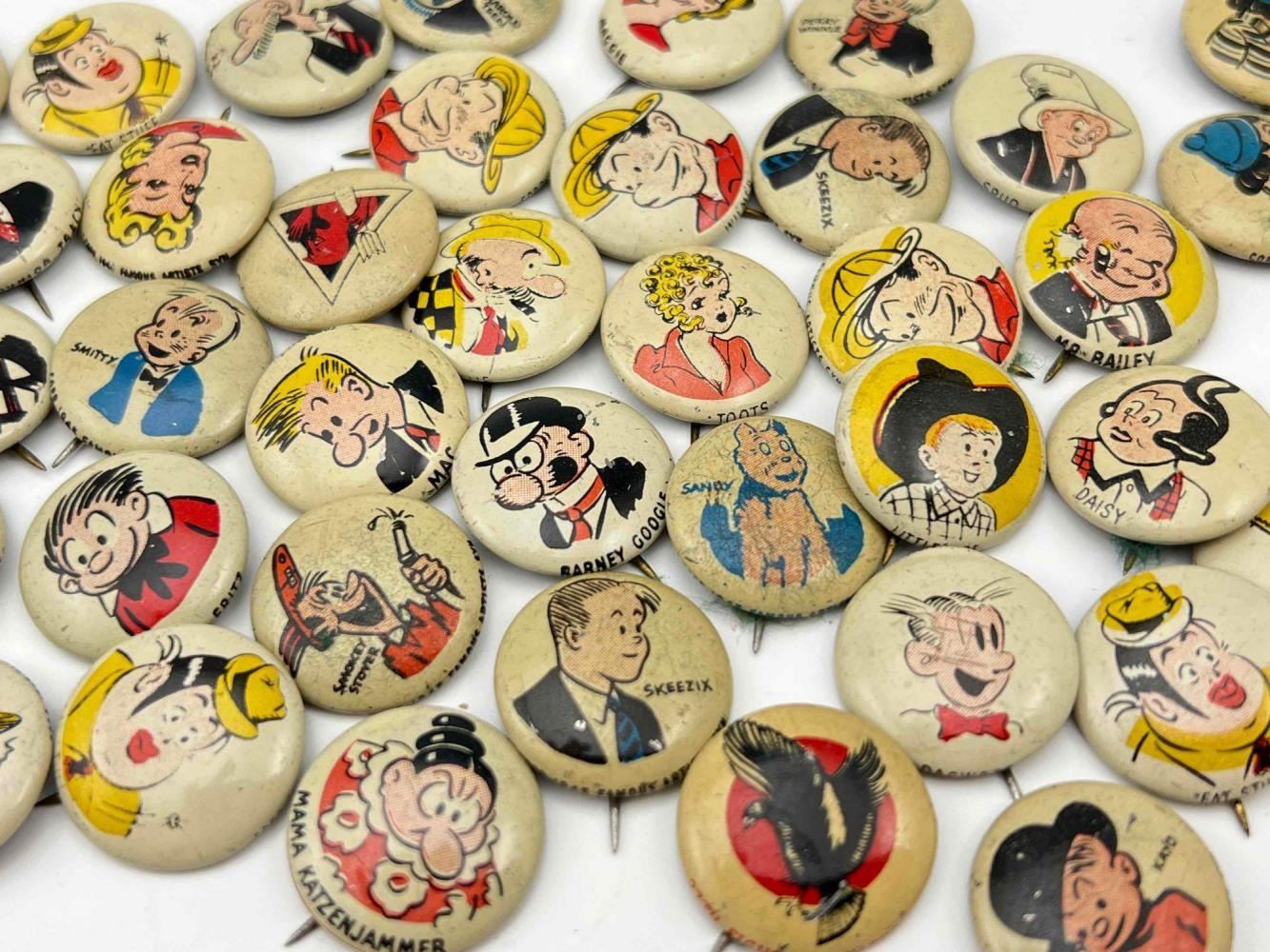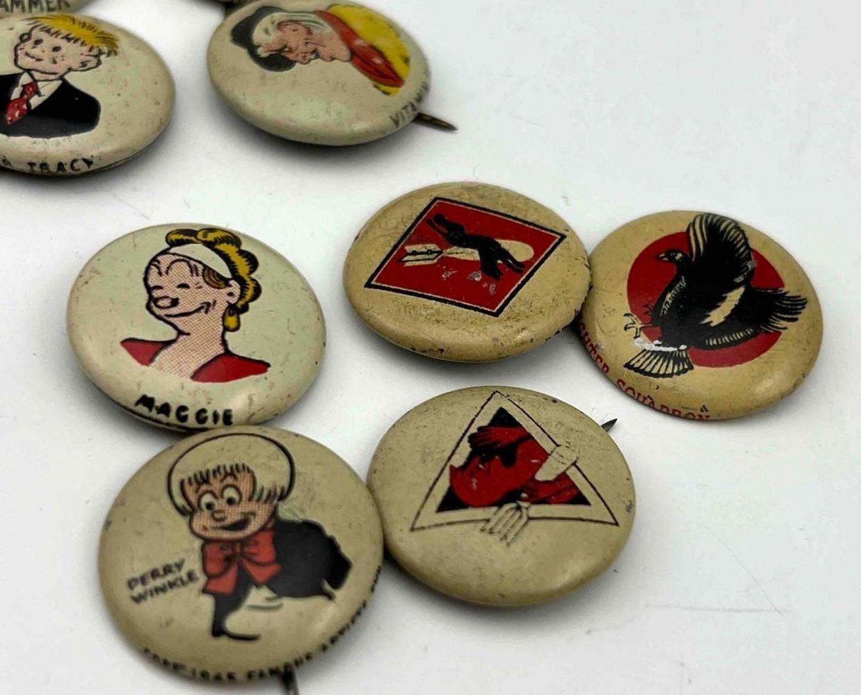 53 1940s Kellog Pep Buttons, Including Dagwood, Fritz Katzenjammer, Mama Katzenjammer, Sandy The Dog (Little Orphan Annie), Tess Trueheart, Vitamin Flintheart, And Junior Tracy (Dick Tracy), Little King, Harold Teen, Lillums (Harold Teen), Smokey Stover, Cindy And Fat Stuff (Smilin Jack), Smitty And Mr Bailey (Smitty), Andy Gump (The Gumps), Toots, Wilmer, Skeezix And Uncle Avery (Gasoline Alley), Perry Winkle And Mr. Bibbs (Winnie Winkle), Mac (Tillie The Toiler), Barney Google, Abretha Breeze (Brenda Starr), Little Joe, Nina, Sadow, Daisy, Goofy, Mamie, Uncle Willie, Goofy, And Maggie. Also Includes Pins For 27th Fighter Squadron, 530 Bombardment Squadron, 96th Bombardment Squadron. Marked Kellog's Pep, COPR. 1946 Famous Artists Syn. Each Button Approximately 0.8125 L x 0.8125 W x 0.125 D Inches.