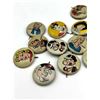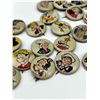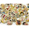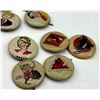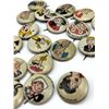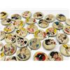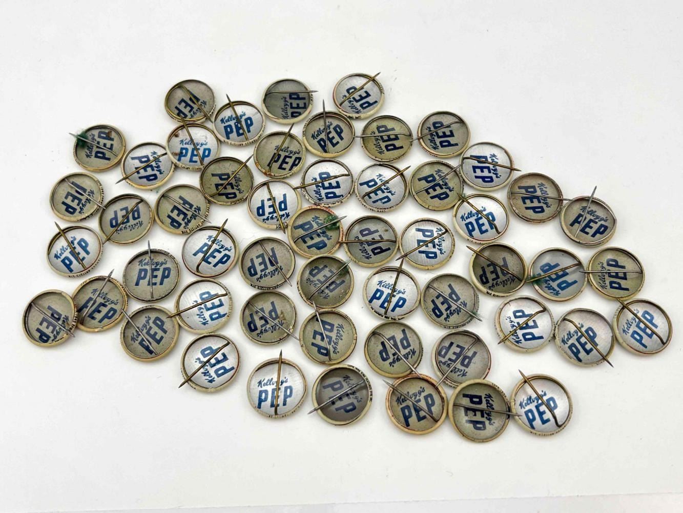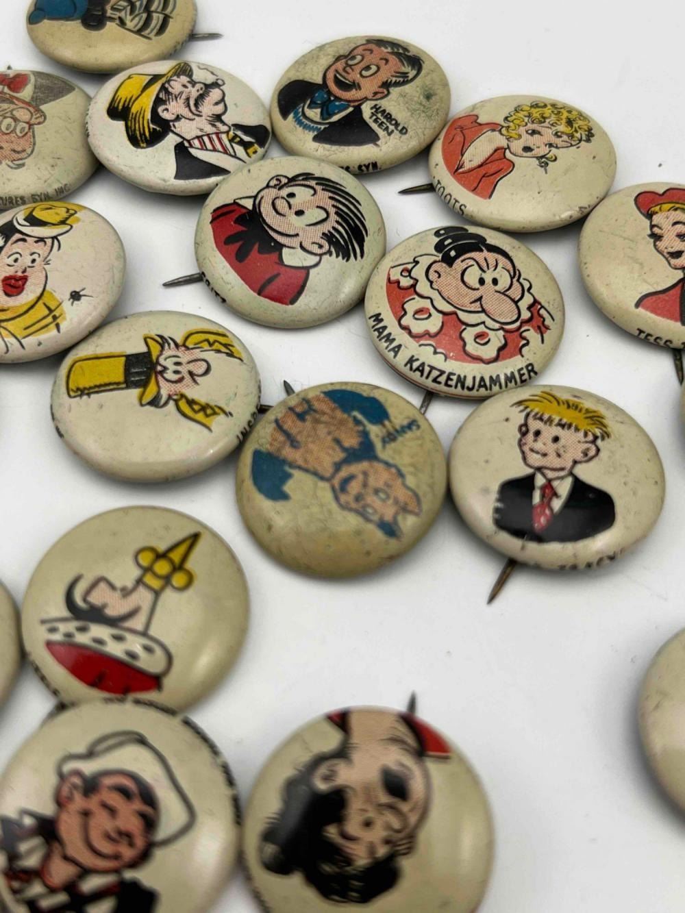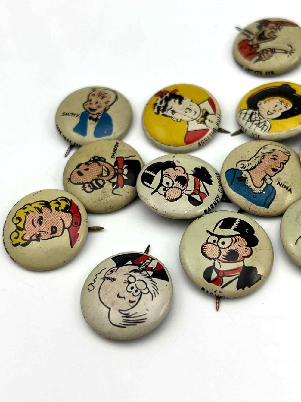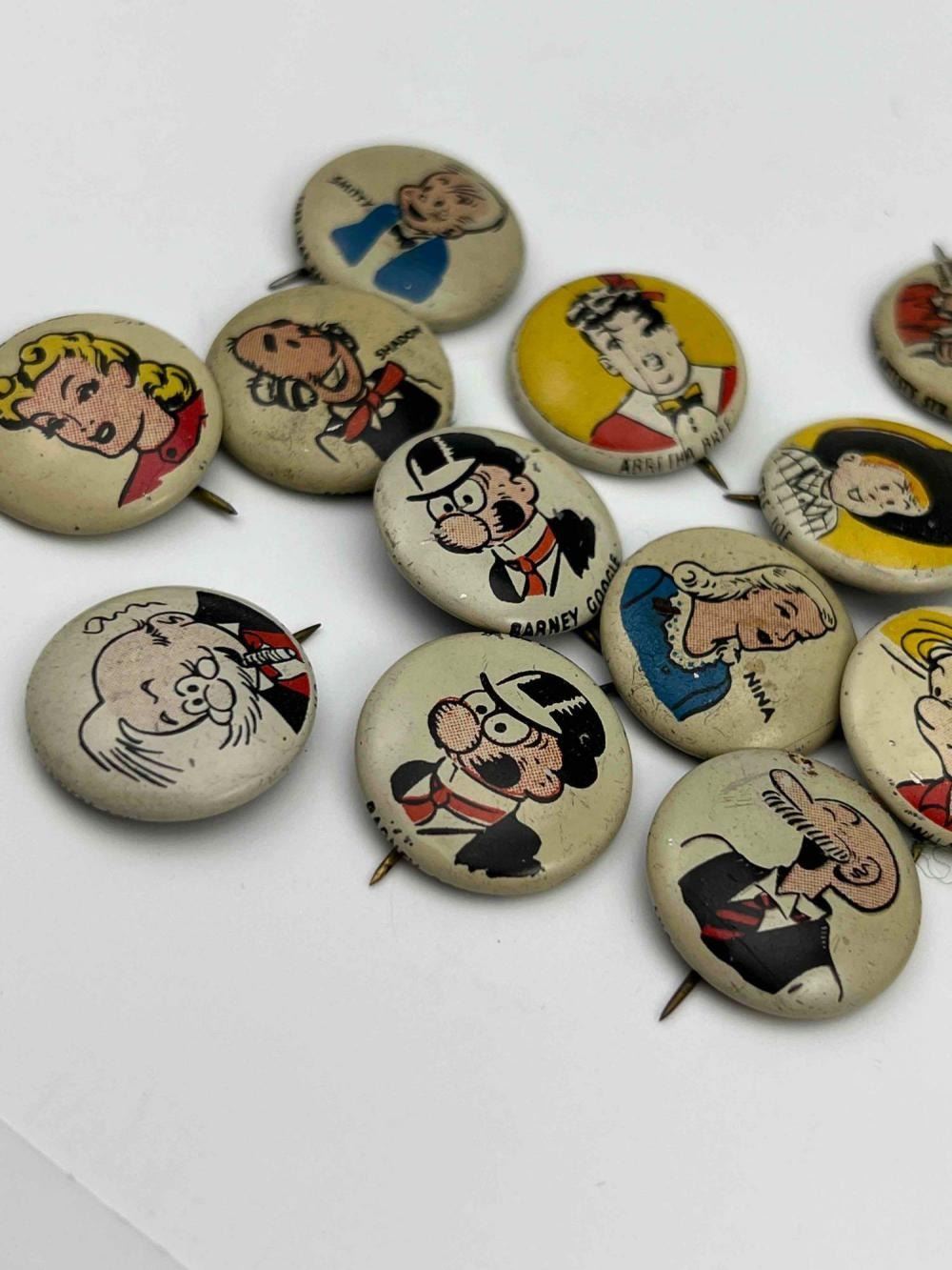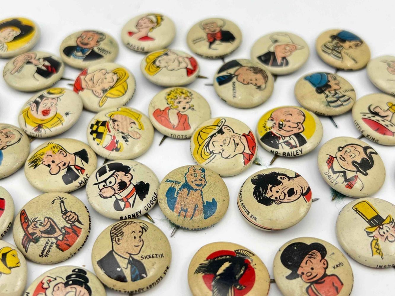 53 1940s Kellog Pep Buttons, Including Dagwood, Fritz Katzenjammer, Mama Katzenjammer, Sandy The Dog (Little Orphan Annie), Tess Trueheart, Vitamin Flintheart, And Junior Tracy (Dick Tracy), Little King, Harold Teen, Lillums (Harold Teen), Smokey Stover, Cindy And Fat Stuff (Smilin Jack), Smitty And Mr Bailey (Smitty), Andy Gump (The Gumps), Toots, Wilmer, Skeezix And Uncle Avery (Gasoline Alley), Perry Winkle And Mr. Bibbs (Winnie Winkle), Mac (Tillie The Toiler), Barney Google, Abretha Breeze (Brenda Starr), Little Joe, Nina, Sadow, Daisy, Goofy, Mamie, Uncle Willie, Goofy, And Maggie. Also Includes Pins For 27th Fighter Squadron, 530 Bombardment Squadron, 96th Bombardment Squadron. Marked Kellog's Pep, COPR. 1946 Famous Artists Syn. Each Button Approximately 0.8125 L x 0.8125 W x 0.125 D Inches.