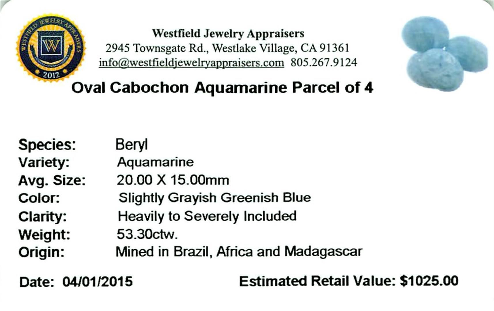 Four oval cabochon cut natural aquamarines exact total weight 53.30ct., clarity is heavily included, type I, medium, slightly grayish, very slightly greenish blue color, (GIA vslgB 5/2), cut is good. Westfield Appraised at $1,025.00.