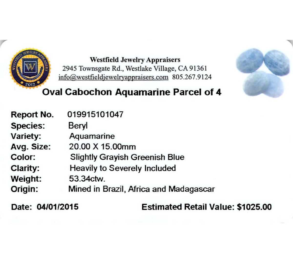 Four oval cabochon cut natural aquamarines exact total weight 53.34ct., clarity is heavily included, type I, medium, very slightly grayish, very slightly greenish blue color, (GIA vslgB 5/3), cut is good. Westfield Appraised at $1,025.00.