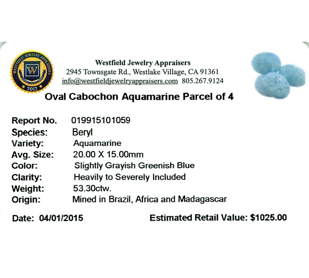 Four oval cabochon cut natural aquamarines exact total weight 53.30ct., clarity is heavily included, type I, medium, slightly grayish, very slightly greenish blue color, (GIA vslgB 5/2), cut is good. Westfield Appraised at $1,025.00.