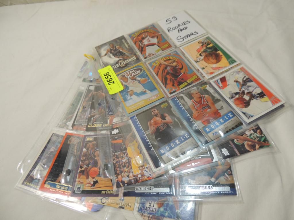 53 BASKETBALL PLAYER CARDS. ROOKIES & STARS. MIXED MAKERS AND YEARS. AS SHOWN SEE PHOTO FOR MORE DETAILS.