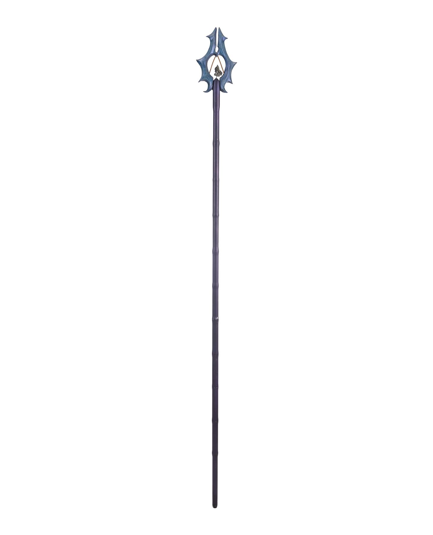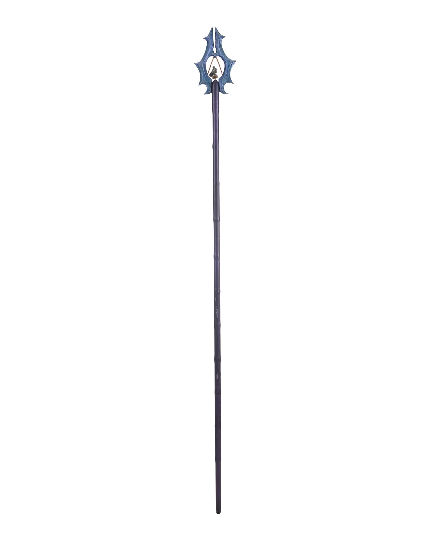This long metal staff with rounded tips and scalloped edges is painted black and mounted at the top with a pyrite geode. Surrounding the geode is a detailed, two-pronged cast resin spike painted a glossy aquamarine and affixed on the interior with copper-color rods. The staff exhibits scratching down its length from production as well as flaking paint and exposed resin from age. Dimensions: 69.5" x 6" x 1.25" (176.5 cm x 15.25 cm x 3 cm)