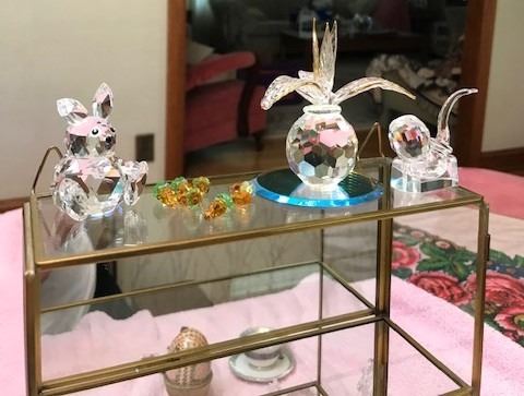 #535: Rectangular holder with mirror on rear wall, no door. 7” (18.5 cm) wide x 10” (26 cm) tall. Two hangers attached to top. Nic nags: teacup with chipped saucer (Made in Japan), Ukrainian Easter egg in stand & piano. Mostly Swarovski crystals: swan, moose, rabbit with carrots, smoking pipe on stand, stool and pineapple on mirror.