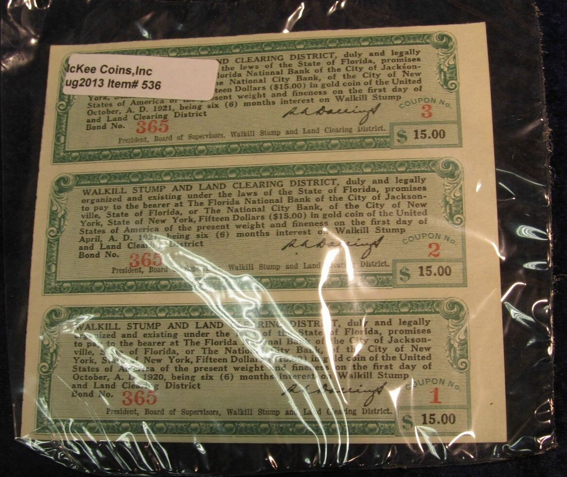 536. Walkill Stump and Land Clearing District $15 Payable in Gold Certificate. Uncut sheet of three. Ca. 1920. CU.