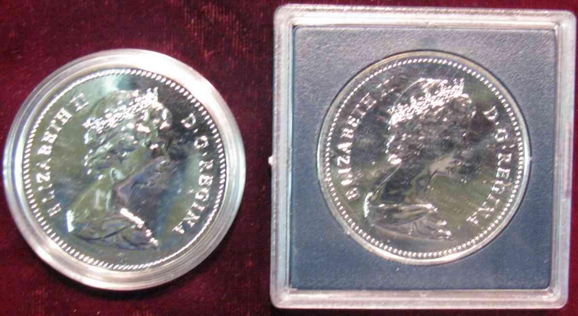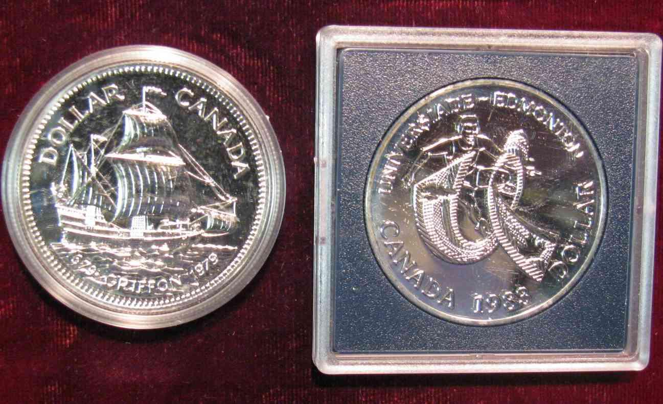 539. 1979 "Griffon" & 1983 "Edmonton University Games" Canada Proof like Dollars. Both encapsulated. Contains .75 ounces total silver.