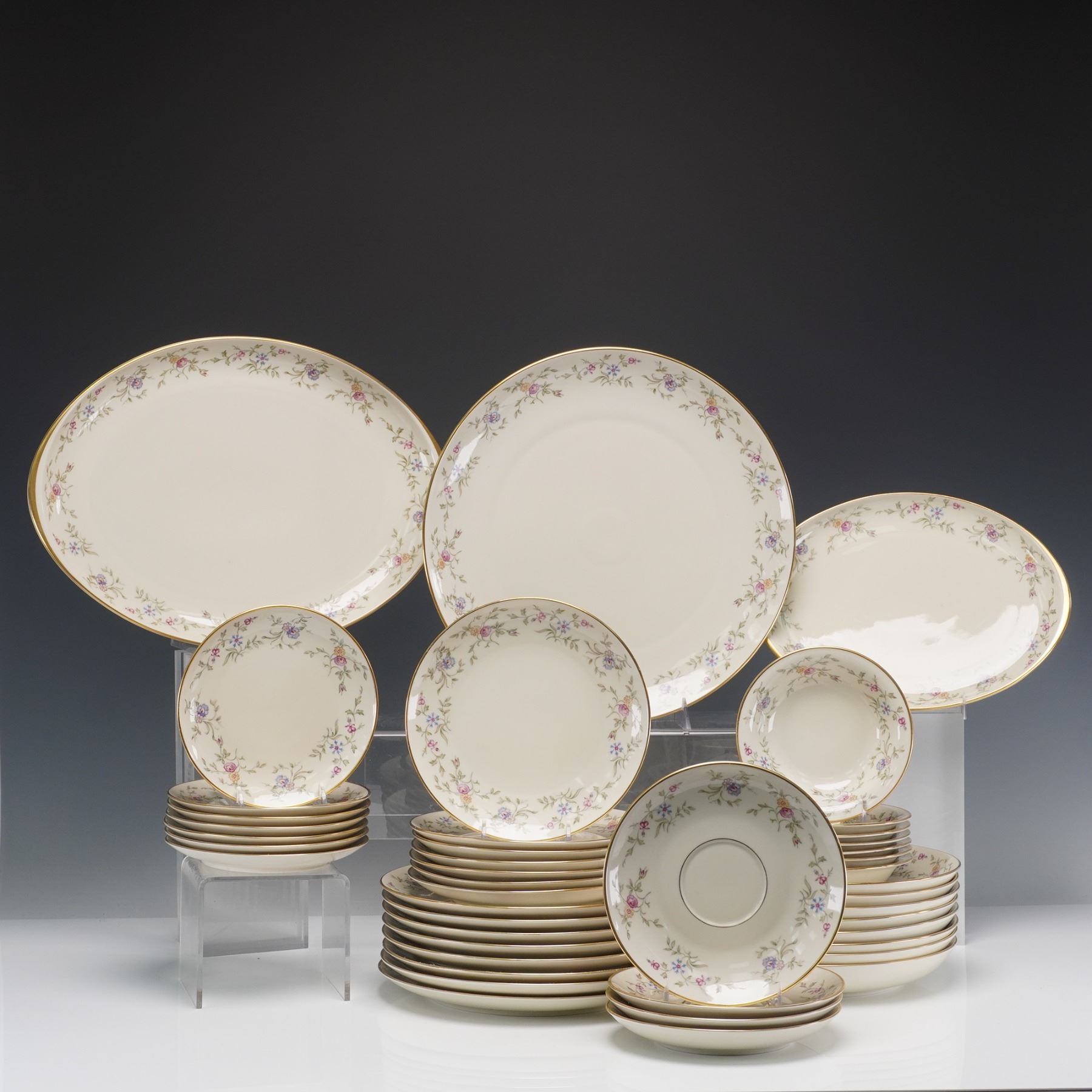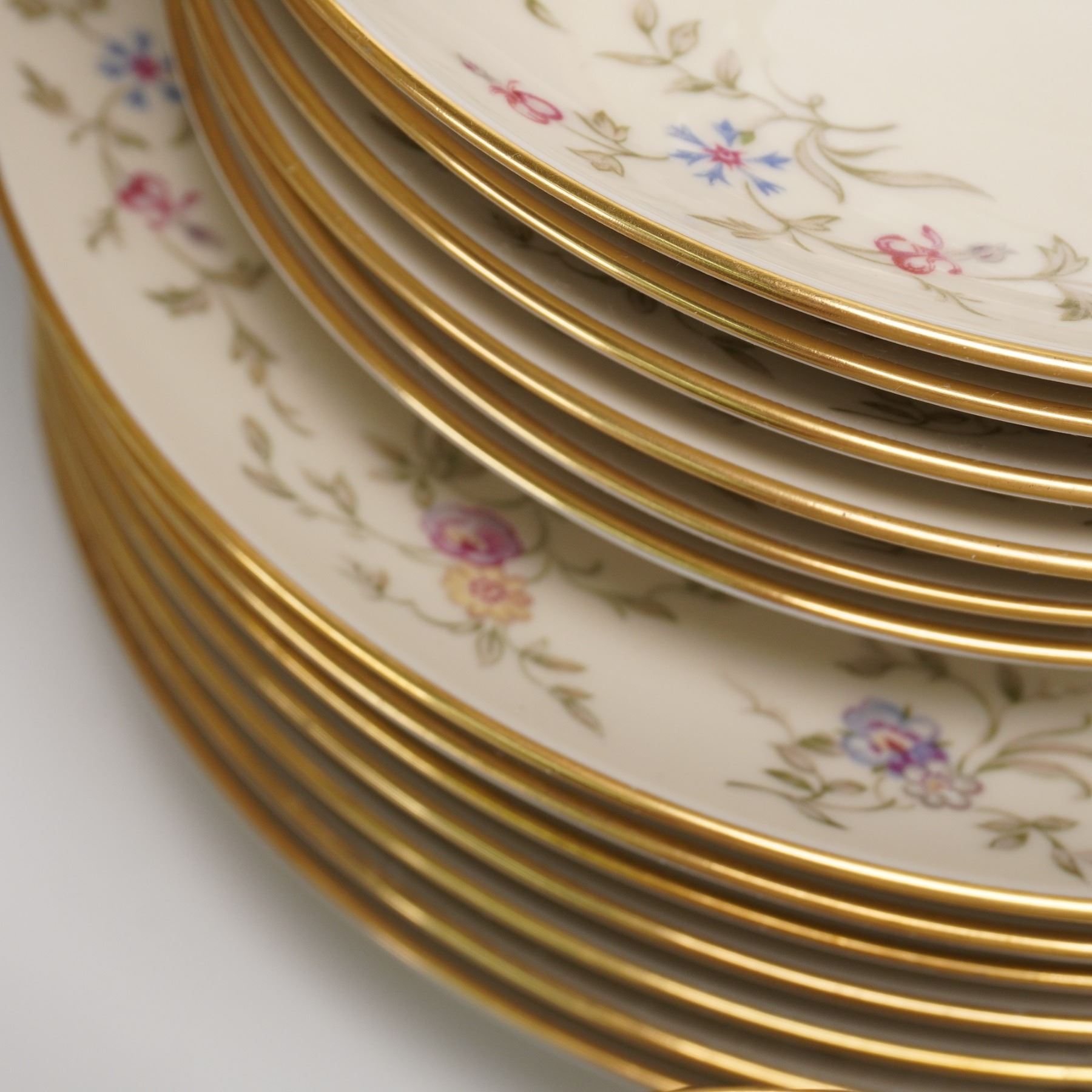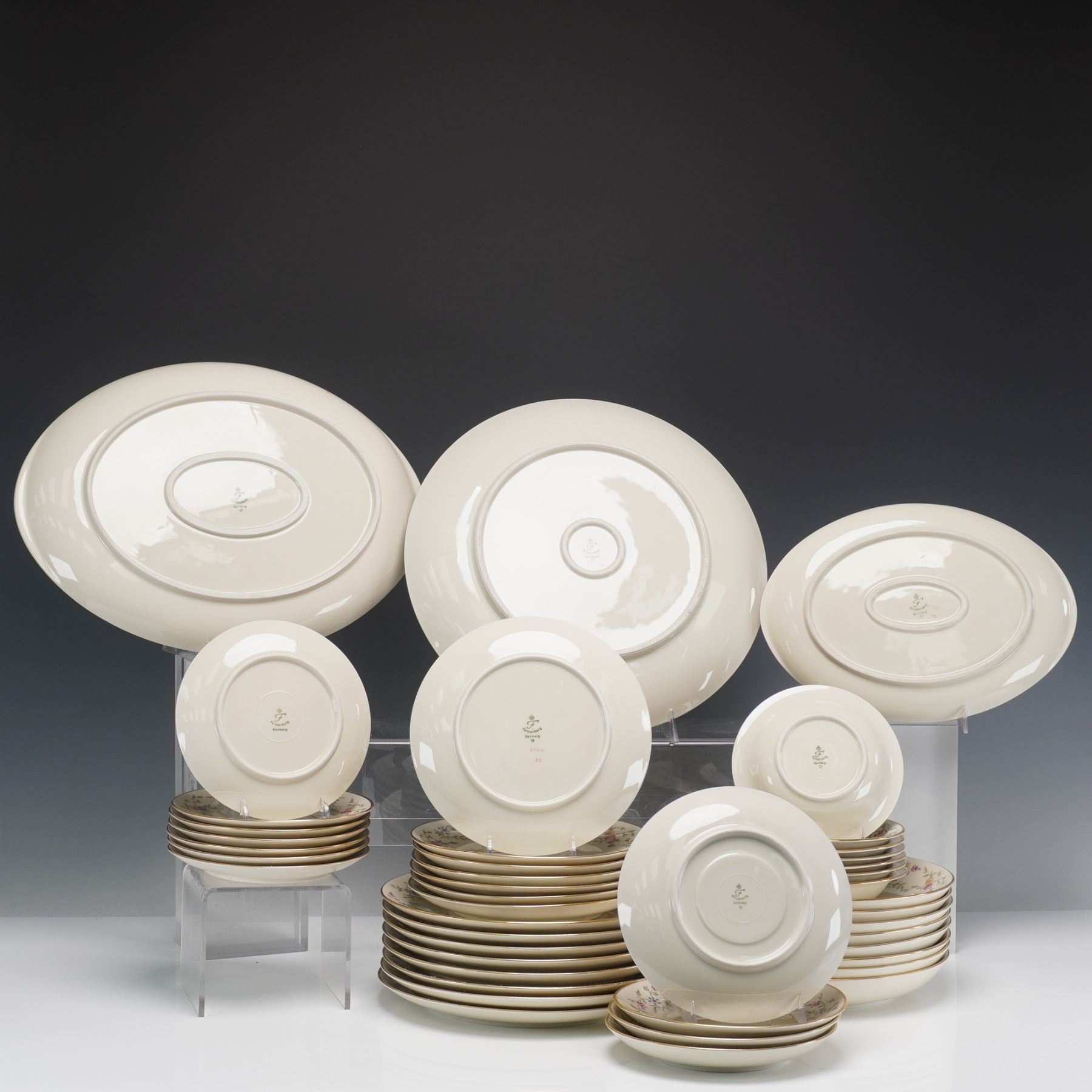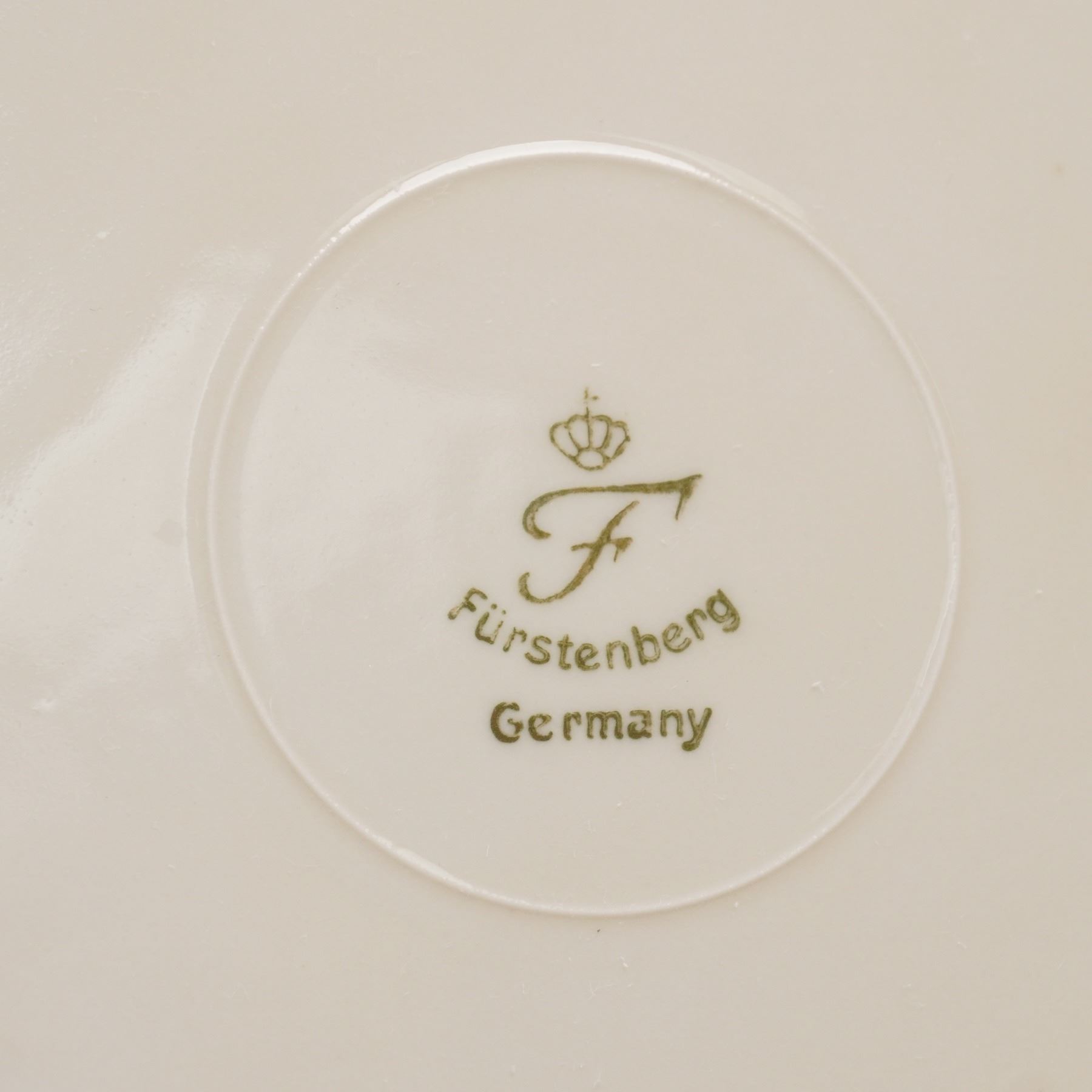 Elegant 53pc porcelain dinnerware set by Furstenberg, Germany. This delicate set features a soft floral pattern in pastel tones with fine gold trim throughout. The service includes a large oval plate 14.5"L, a small oval plate 10.75"L, a large oval bowl 11.25"L, and a small oval bowl 10"L. There are four handled cups 2.25"H with matching saucers 7" dia., 8 large bowls 8.5" dia., 8 dinner plates 9.5" dia., 7 lunch plates 7.75"dia., 7 dessert plates 6.5" dia., 7 small compote bowls 5.75" dia., a large platter 12.75" dia., and a lidded casserole bowl 6.5"H. Also included is a gravy boat with an attached underplate measuring 9.5"L. All pieces are marked Furstenberg Germany to the base.