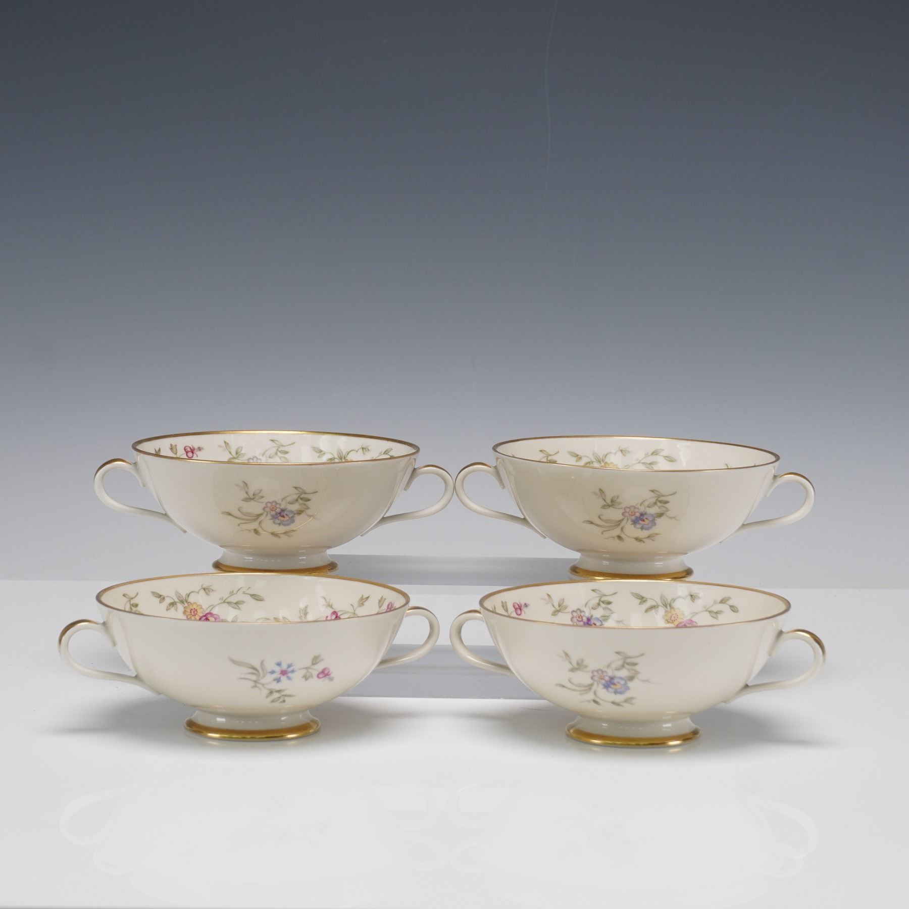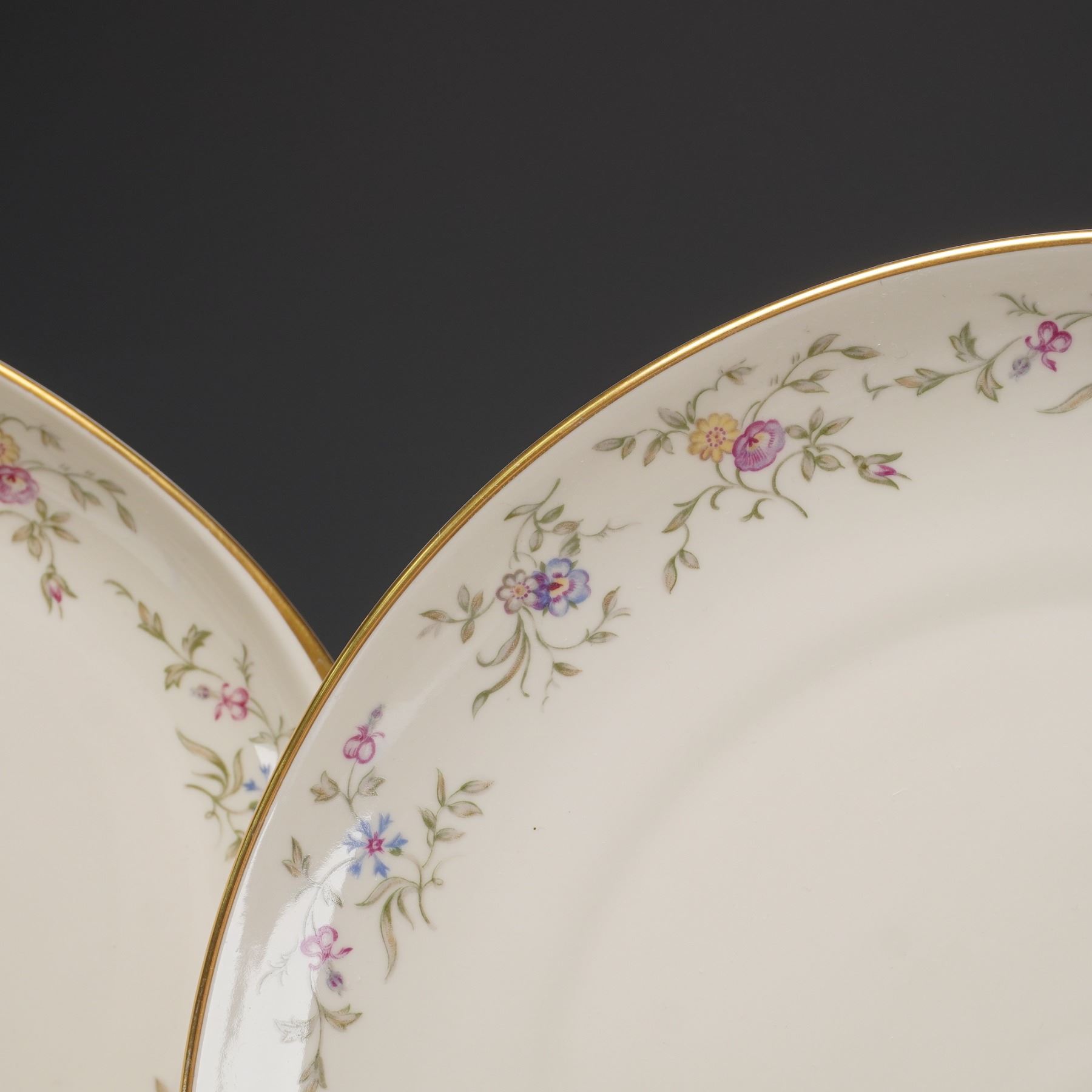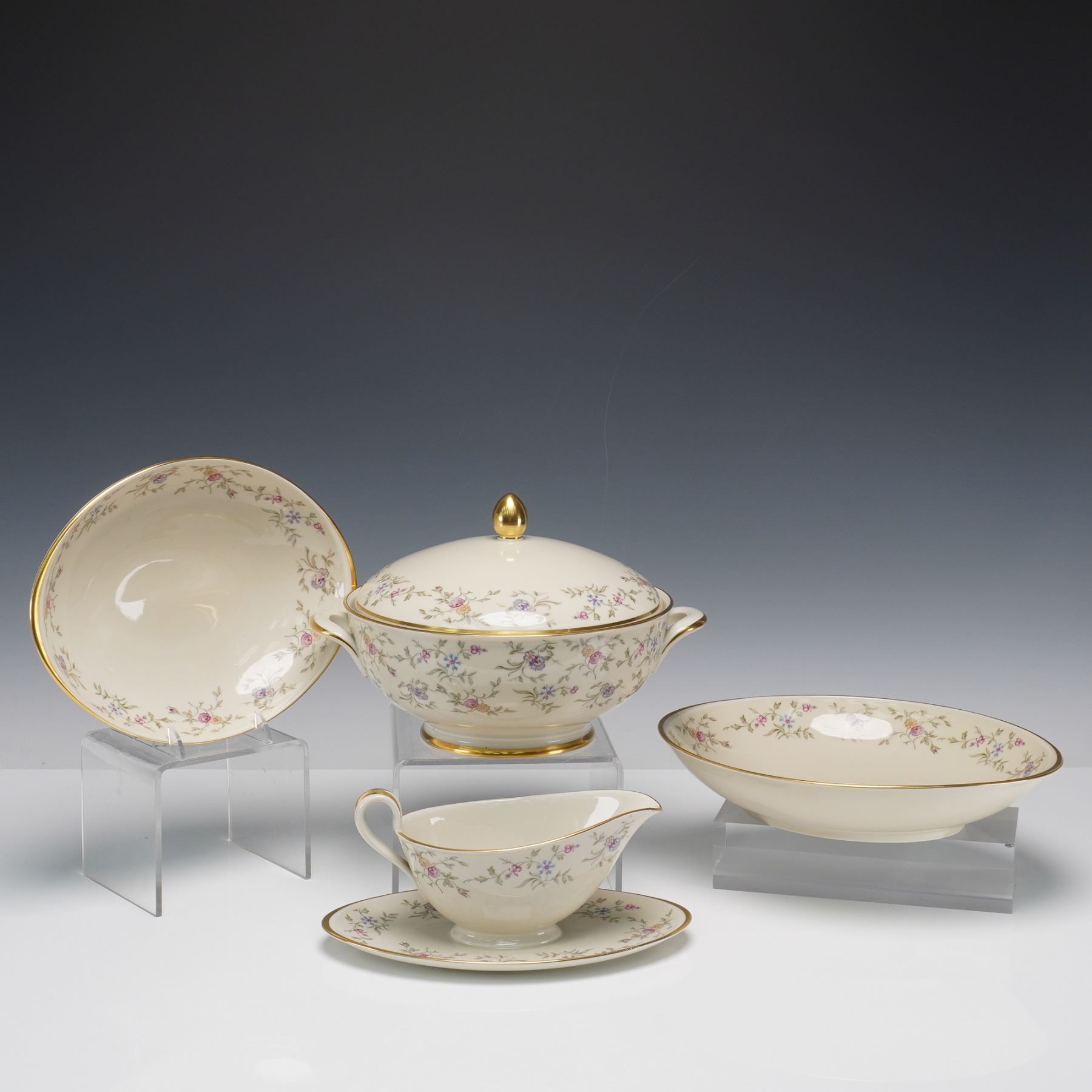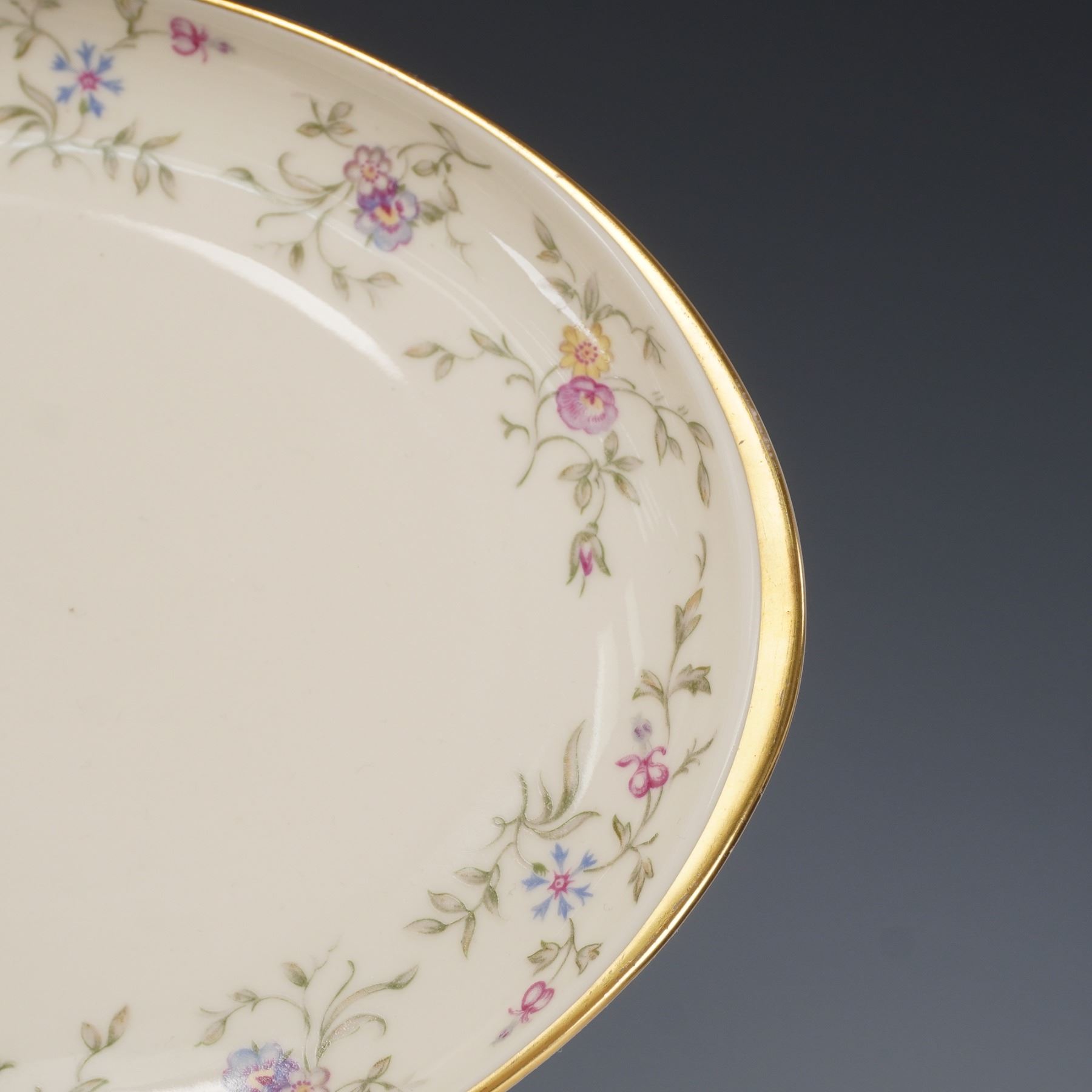 Elegant 53pc porcelain dinnerware set by Furstenberg, Germany. This delicate set features a soft floral pattern in pastel tones with fine gold trim throughout. The service includes a large oval plate 14.5"L, a small oval plate 10.75"L, a large oval bowl 11.25"L, and a small oval bowl 10"L. There are four handled cups 2.25"H with matching saucers 7" dia., 8 large bowls 8.5" dia., 8 dinner plates 9.5" dia., 7 lunch plates 7.75"dia., 7 dessert plates 6.5" dia., 7 small compote bowls 5.75" dia., a large platter 12.75" dia., and a lidded casserole bowl 6.5"H. Also included is a gravy boat with an attached underplate measuring 9.5"L. All pieces are marked Furstenberg Germany to the base.