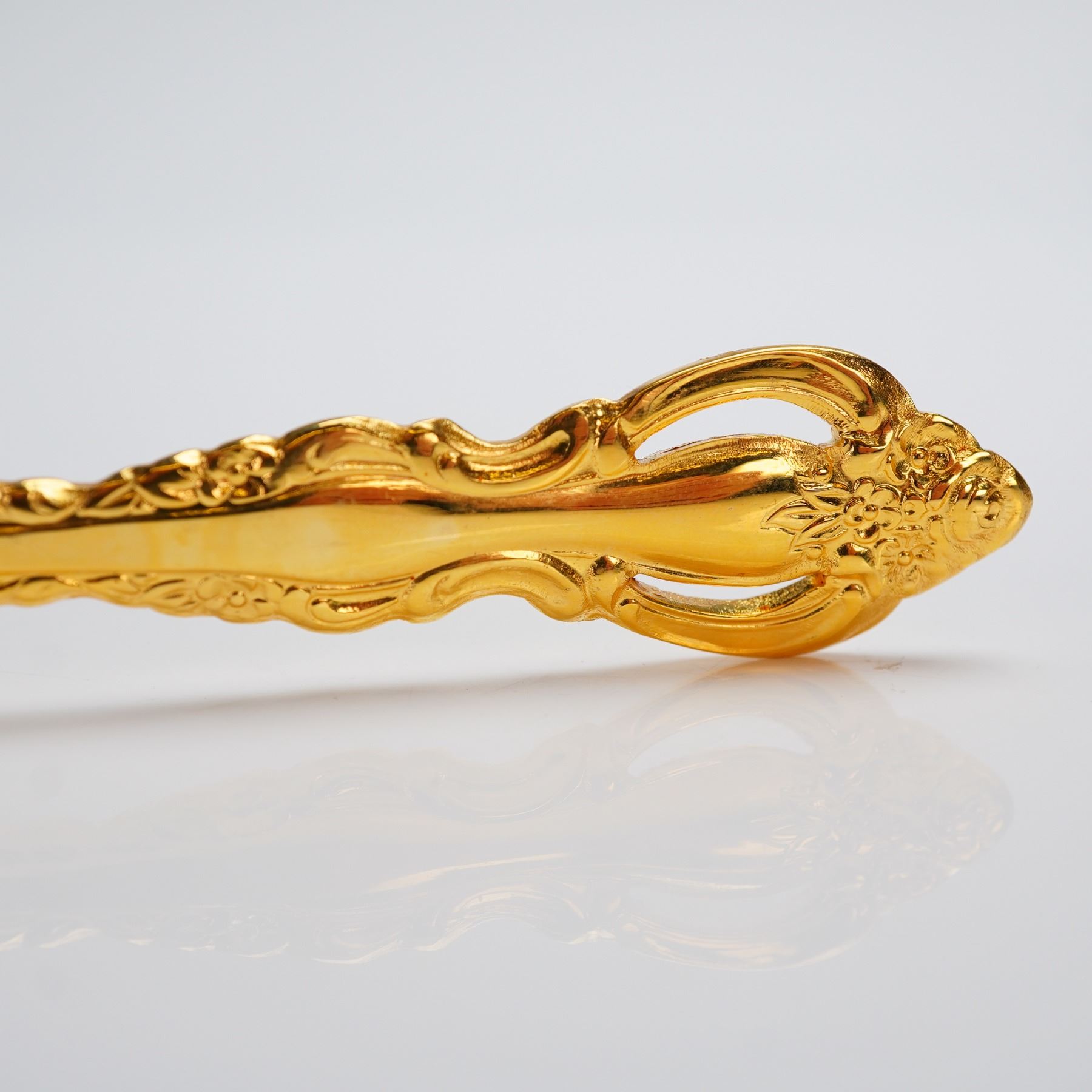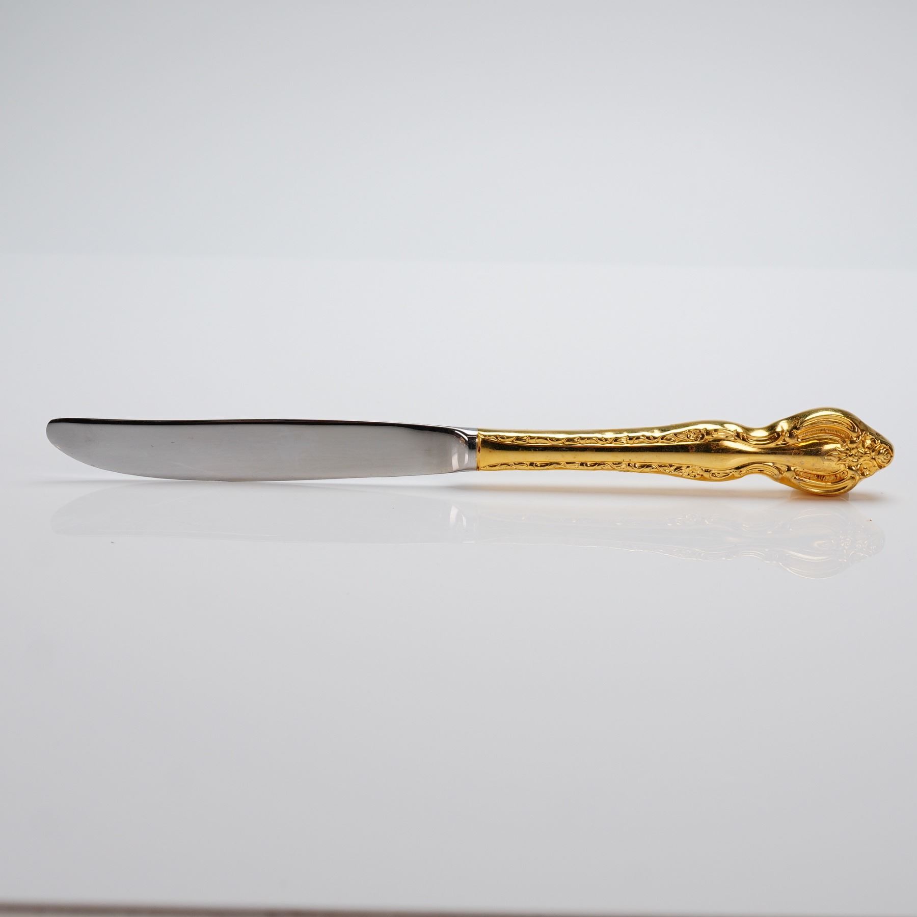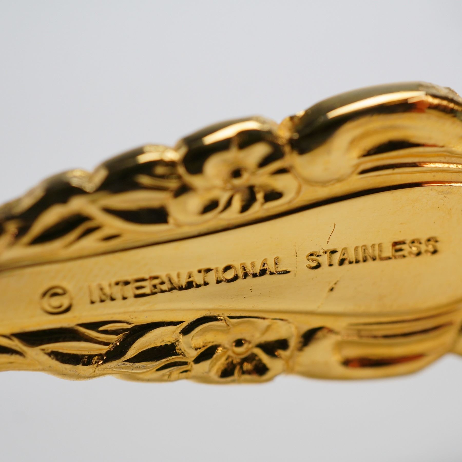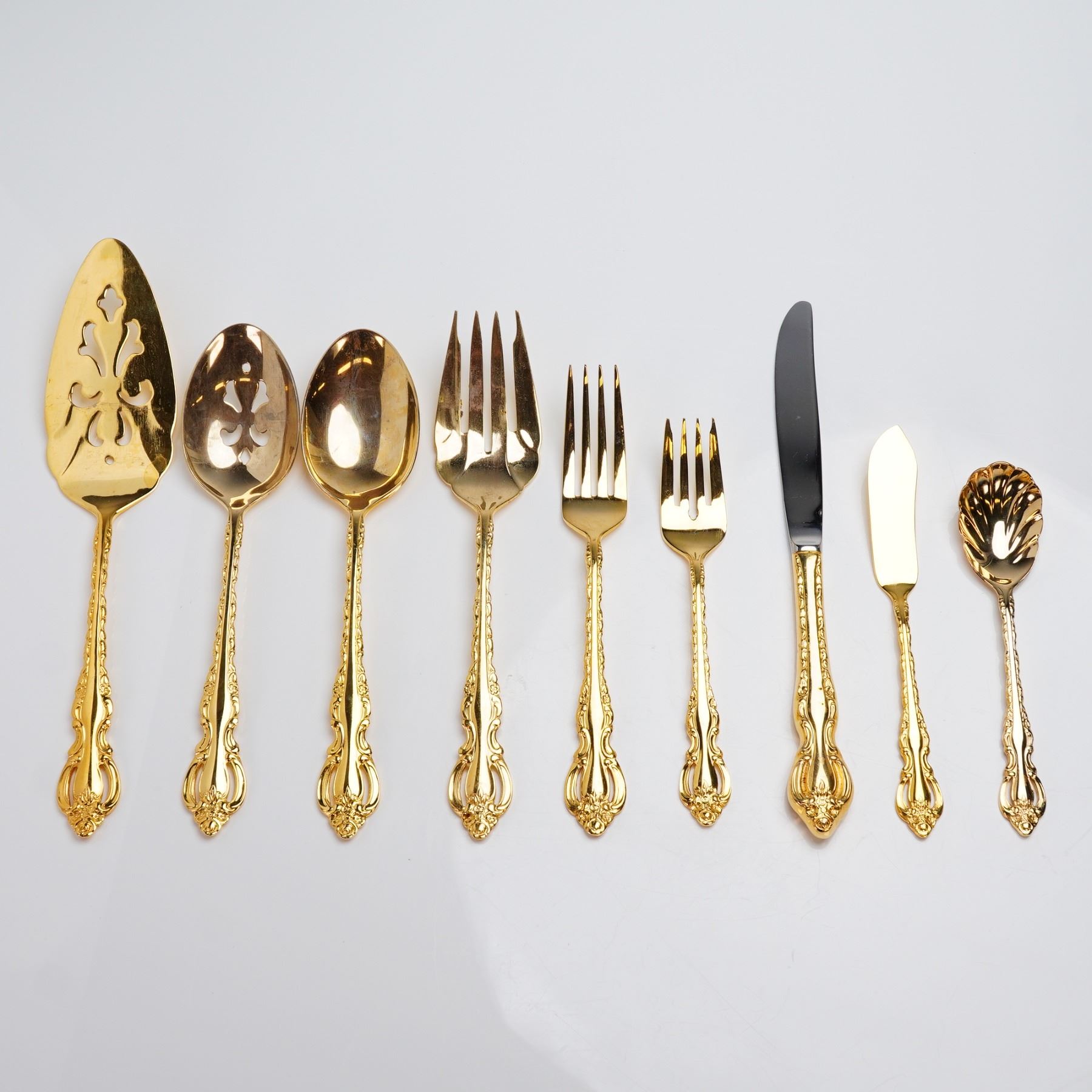 A 53-piece flatware by International Silver in the Golden Orleans pattern. The set is constructed from stainless steel with a gold electroplate finish. The flatware exhibits a Baroque or Rococo revival style, characterized by heavily scrolling and floral relief work across the handles. The set is presented in a hinged, stained wooden case lined with reddish-brown felt. The manufacturer's mark engraved on the handles reads " INTERNATIONAL STAINLESS." The 53-piece service includes 8 dinner forks, 7 salad forks, 8 soup spoons, 16 dessert spoons, 1 pie/cake server, 1 serving spoon, 1 pierced serving spoon, 1 serving fork, 1 scalloped sugar spoon, 1 spreader, and 8 dinner knives, and 1 serving fork. Measurements are for the largest pieces which is the pie cake server.