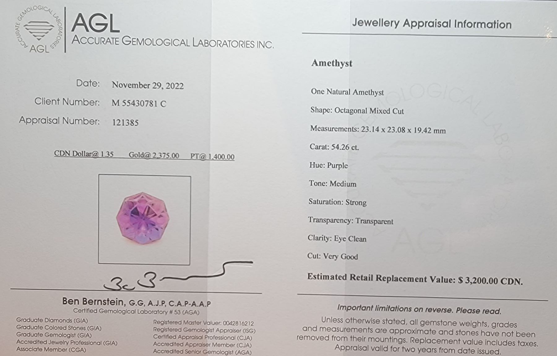 OCTAGONAL CUT - INCLUDES APPRAISAL CERTIFICATE **ALL ITEMS MUST BE REMOVED BY 5PM SATURDAY, JANUARY 21ST 2023. ALL MAGIC SPACE ITEMS MUST BE REMOVED BY WEDNESDAY, JANUARY 18TH AND ARE LOCATED AT 9058-22 AVENUE SW #102. **ALL REMAINING ITEMS WILL BE SUBJECT TO A $6.00 PER DAY STORAGE CHARGE. ANY ITEMS REMAINING AFTER MONDAY, FEBRUARY 6TH, 2023 WILL BE CONSIDERED FORFEITED. NO REFUNDS WILL BE ISSUED FOR FORFEITED ITEMS. TO SCHEDULE A PICK UP APPOINTMENT CLICK HERE